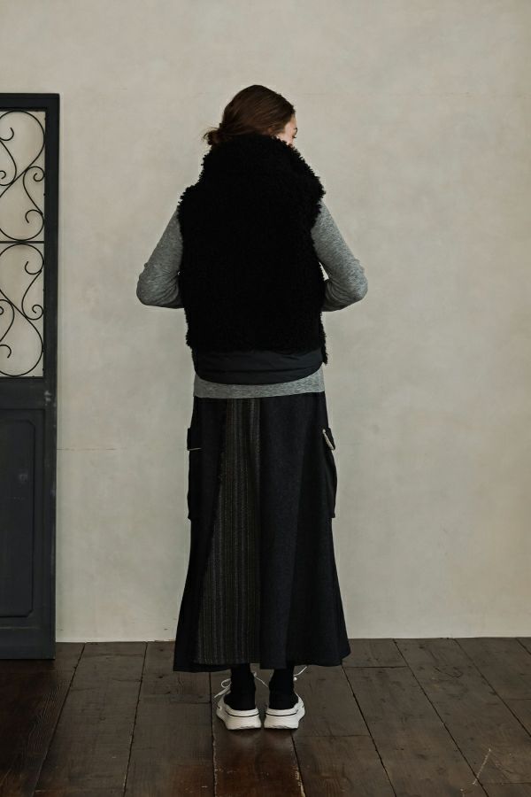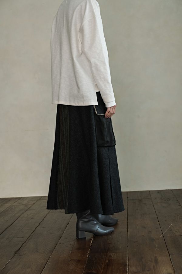静かに惹きつける、縦ラインの魔法。立体感で魅せるモードスカート。 ストライプとバーズアイ風ツイードを縦に切り替えた配色が、視覚的な細見え効果を演出し、すっきりとした印象に。ナイロン素材のBIGポケットはヒップまわりをさりげなくカバーしながら、モードな存在感を添えます。 メロウなロング丈のシルエットは、裾の分量を巧みに調整することで軽やかな揺れ感を実現。歩くたびに表情が生まれ、足さばきも快適です。しわになりにくいツイード素材で、シーズンレスに着回せるのも魅力。 機能美とエレガンスを兼ね備えた、大人のための一着です。 ●ツイードナイロンジャケット(25238-6634P-W)とセットアップ可