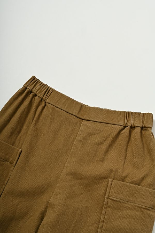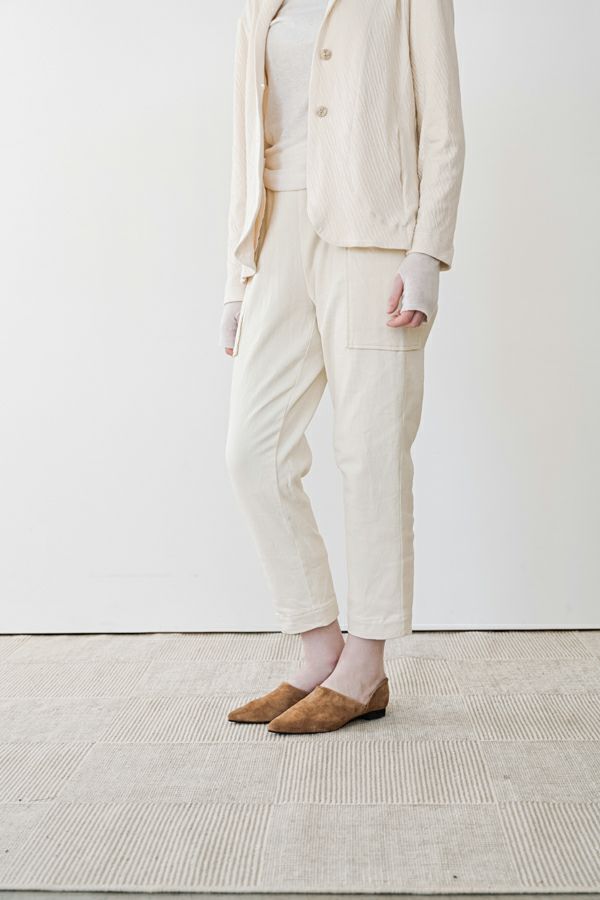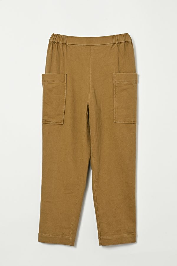 きれい見えと快適さを両立。大人のための美シルエットパンツ。 中肉の裏起毛ストレッチ素材を製品洗いで仕上げ、やわらかな温もりと動きやすさを叶えた一本。フロントはギャザーを無くし、すっきりとしたウエストラインに。 サイドに配した大きめポケットが腰まわりをさりげなくカバーしながら、視線を引き上げることで美しいバランスに整えてくれます。 裾に向かって細くなるテーパードシルエットが、脚を長く、ほっそりと演出。 ストレッチ性に優れた素材と総ゴムウエスト仕様で、ストレスフリーな穿き心地なのに、見た目はシャープ。リラックス感ときちんと感を両立した、デイリーに頼れる大人パンツです。 ●裏起毛ストレッチジャケット(25238-6627M-R)とセットアップ可