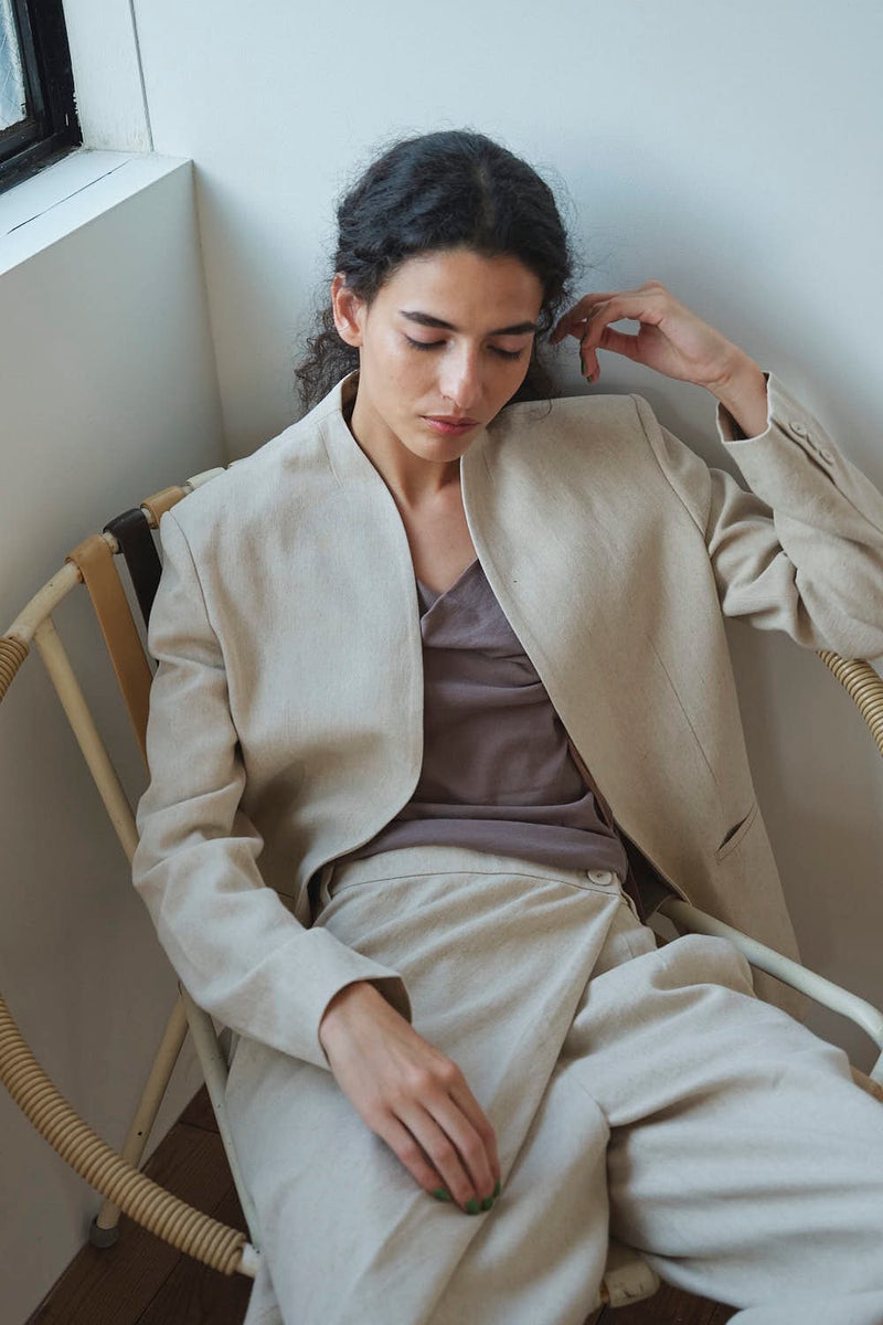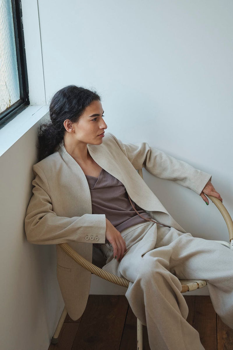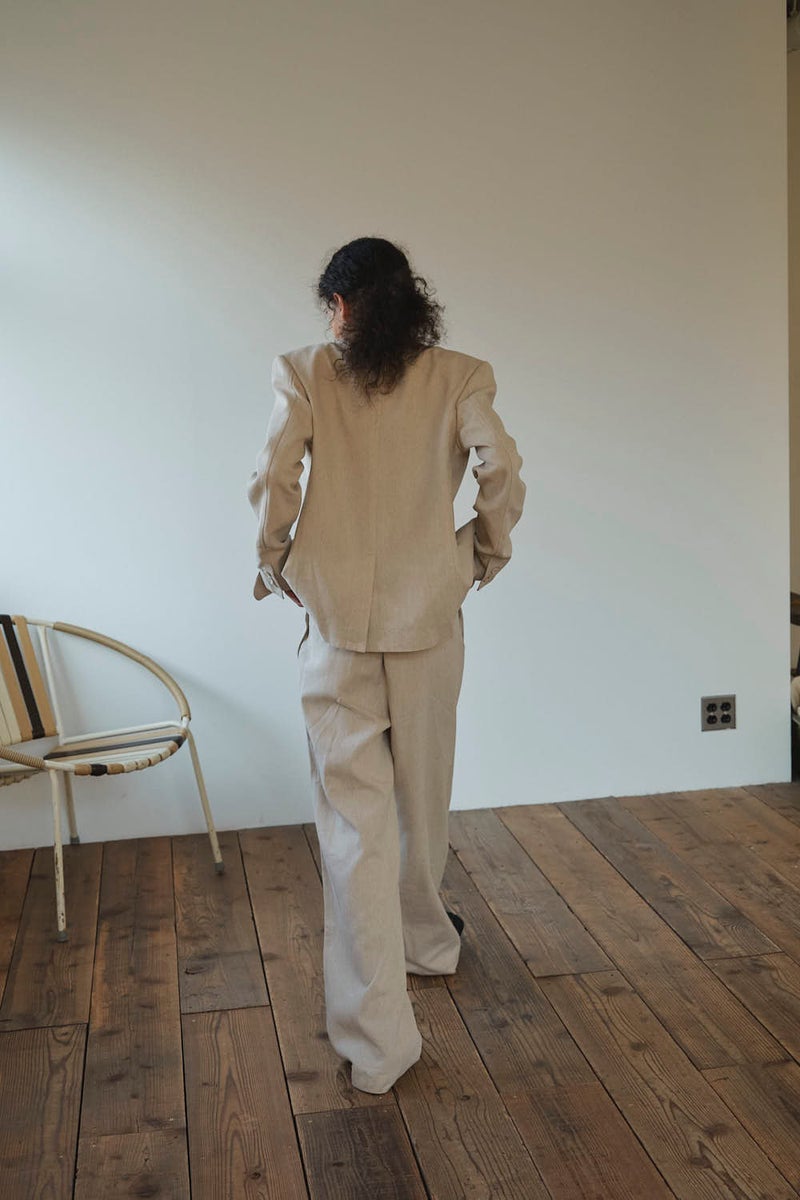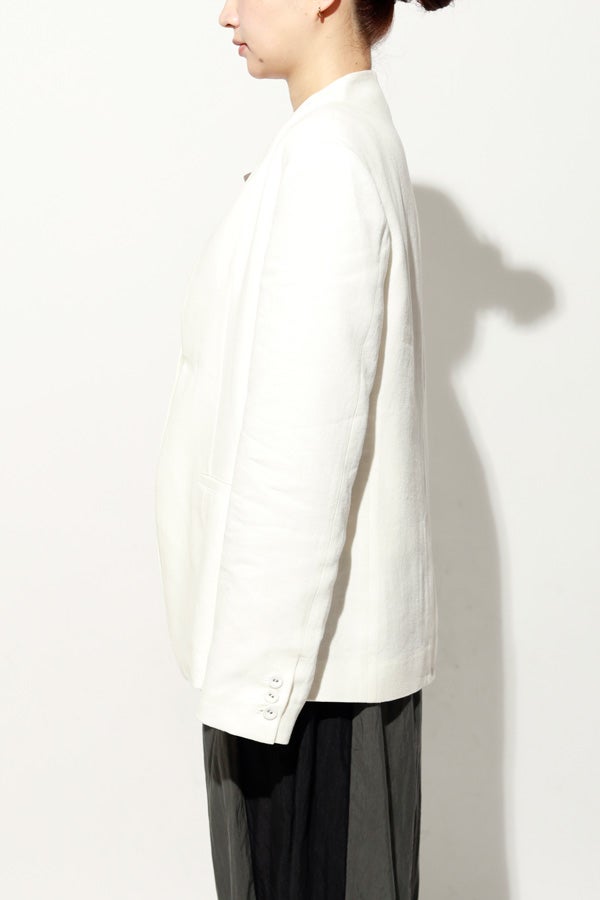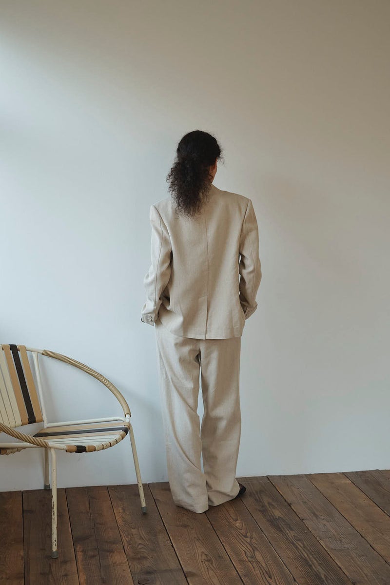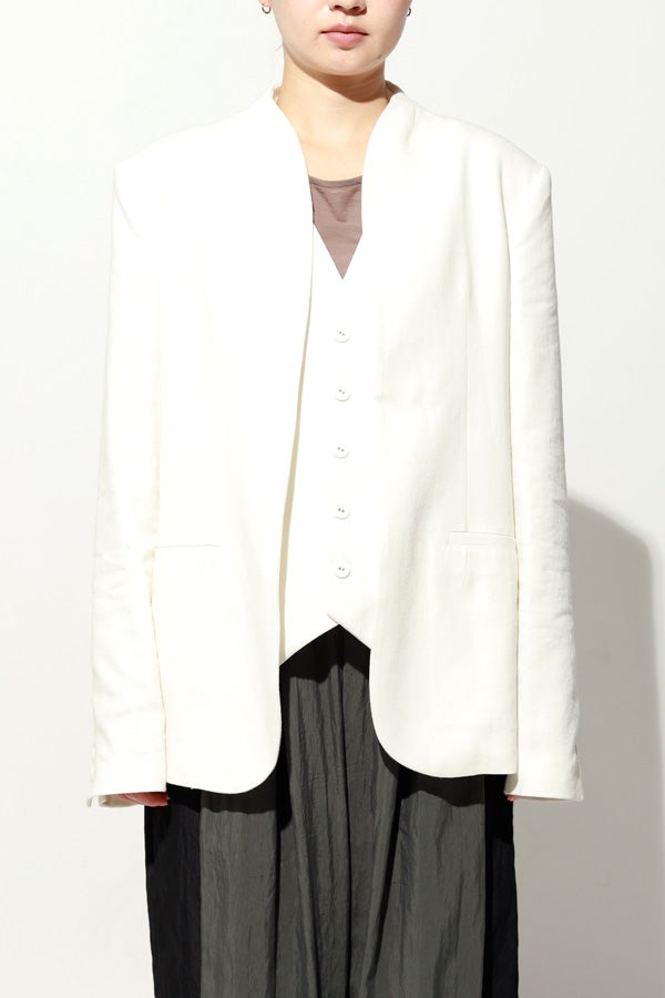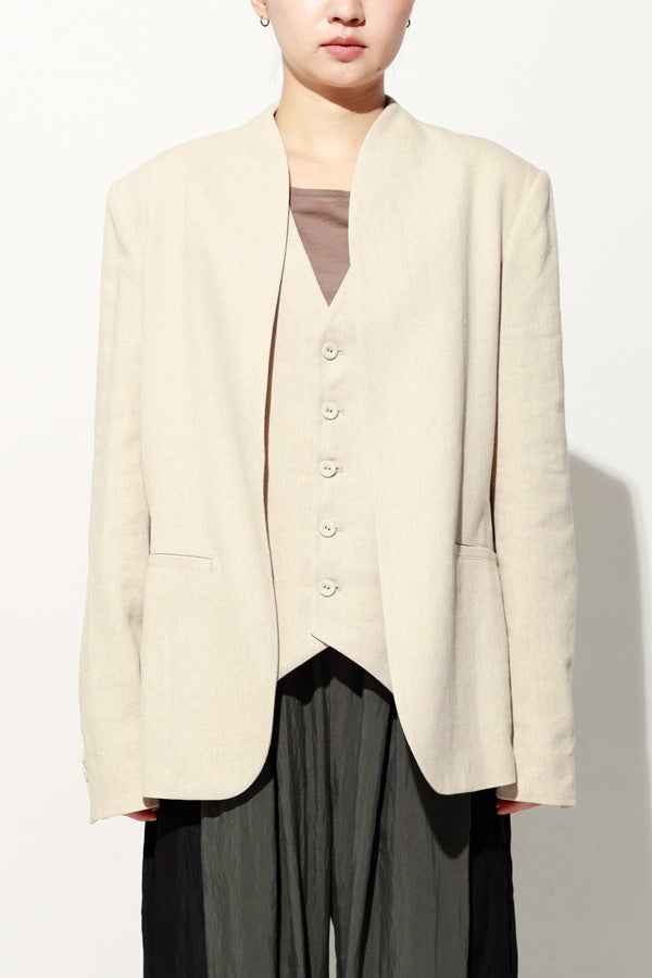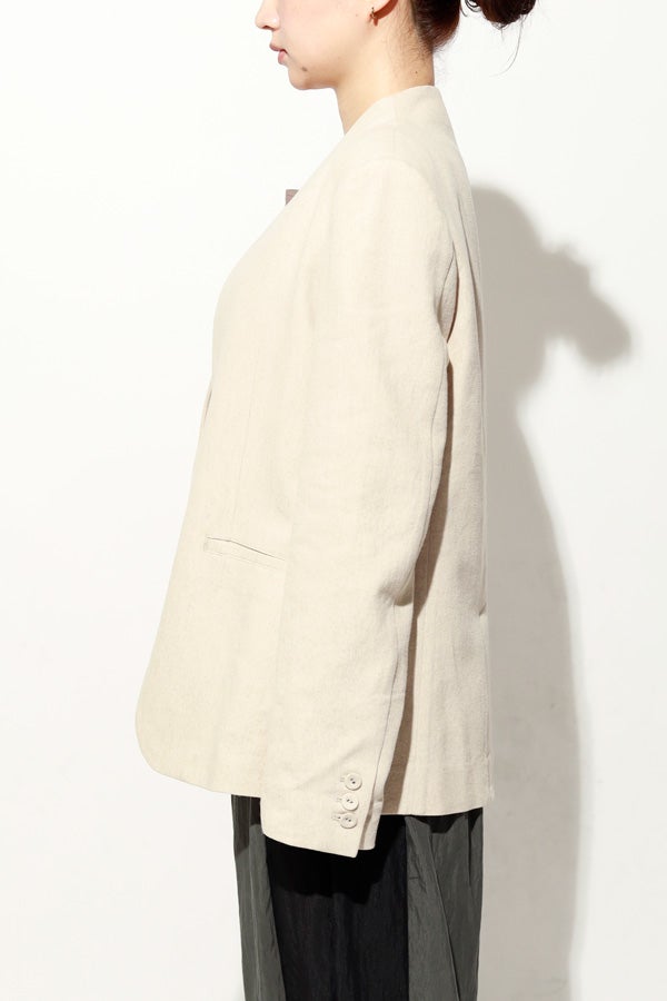 美シルエットと快適さを両立した、品格ジャケット。 カチッとした美しいシルエットを保ちながら、袖の運動量をしっかり確保できるようパターンにこだわり抜いたジャケット。肩パットを備えた設計が自然なスタイルアップを叶え、体に沿う立体的なフォルムでストレスのない着心地を実現します。 ビジネスシーンから特別なお出掛けまで、気分を引き締めたい瞬間に寄り添ってくれる、大人の女性のワードローブに欠かせない一着。 同素材のパンツやベストと三つ揃えで着用すればオケージョンスタイルにも対応。 デニムやTシャツにさらりと羽織れば、程よく力の抜けた都会的な着こなしが完成します。 ●リネン混ベスト(26153-5837E),リネン混フロントタックパンツ(26153-9835E)とセットアップ可【三つ揃え】 ●手洗い可