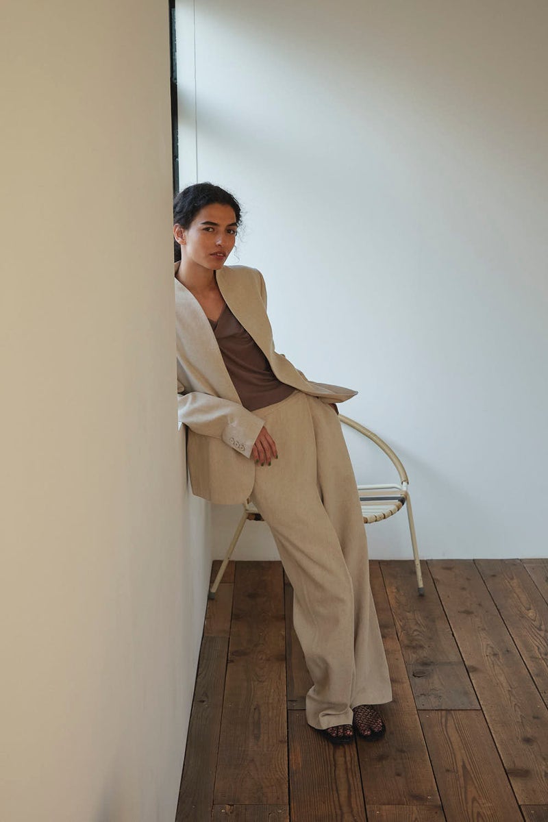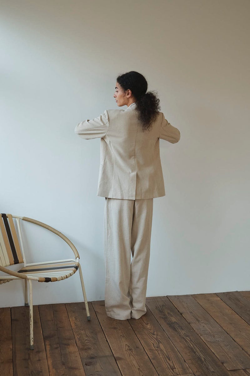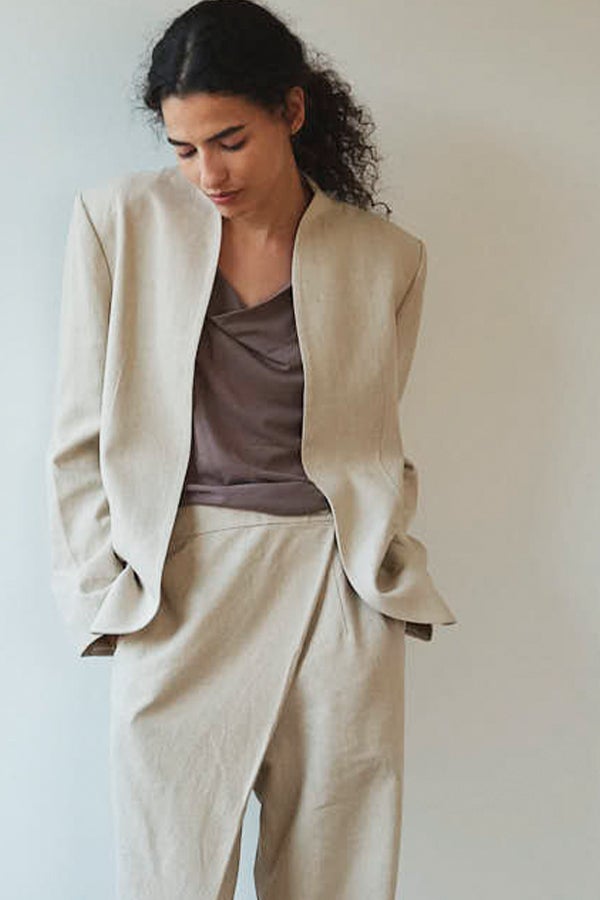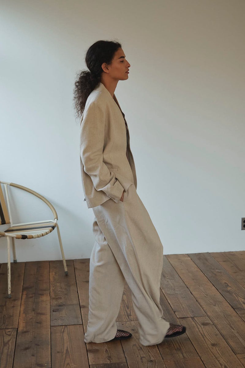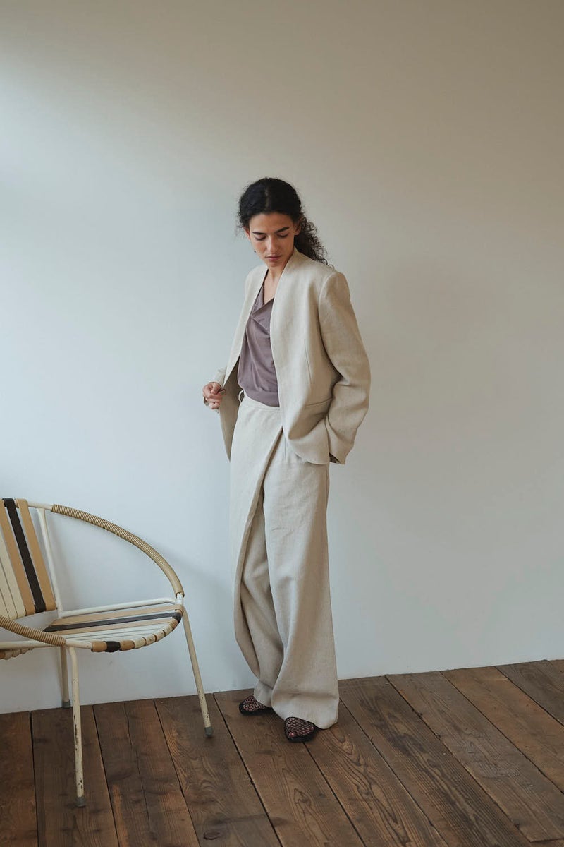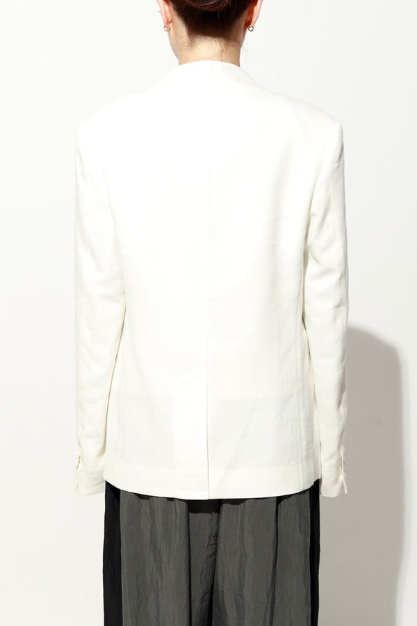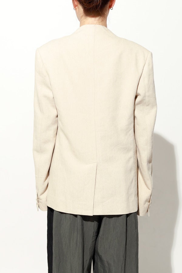 美シルエットと快適さを両立した、品格ジャケット。 カチッとした美しいシルエットを保ちながら、袖の運動量をしっかり確保できるようパターンにこだわり抜いたジャケット。肩パットを備えた設計が自然なスタイルアップを叶え、体に沿う立体的なフォルムでストレスのない着心地を実現します。 ビジネスシーンから特別なお出掛けまで、気分を引き締めたい瞬間に寄り添ってくれる、大人の女性のワードローブに欠かせない一着。 同素材のパンツやベストと三つ揃えで着用すればオケージョンスタイルにも対応。 デニムやTシャツにさらりと羽織れば、程よく力の抜けた都会的な着こなしが完成します。 ●リネン混ベスト(26153-5837E),リネン混フロントタックパンツ(26153-9835E)とセットアップ可【三つ揃え】 ●手洗い可