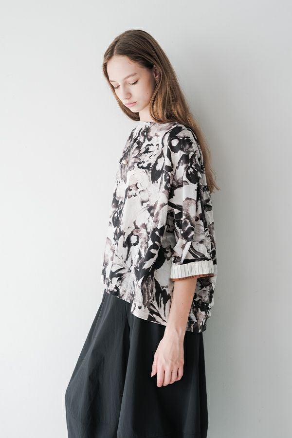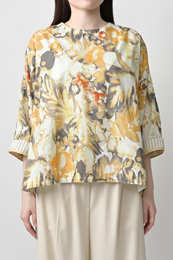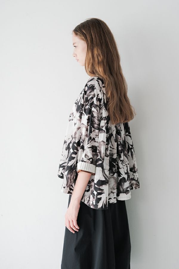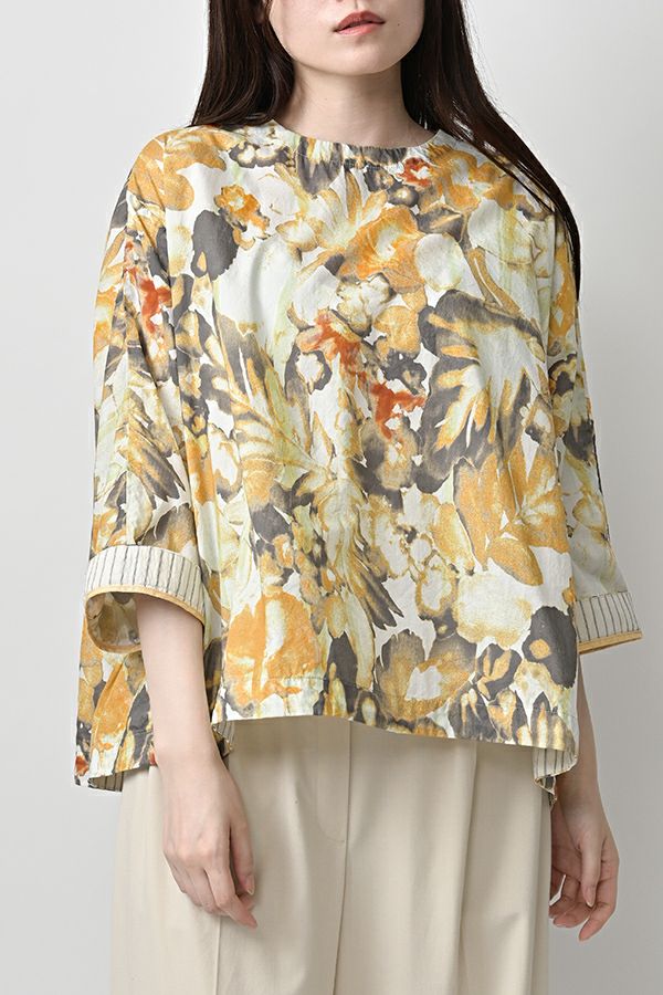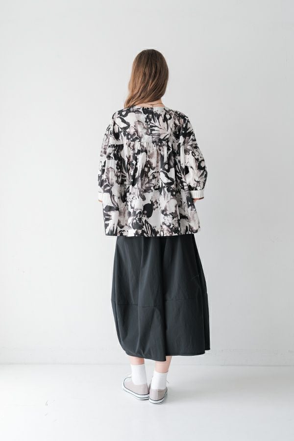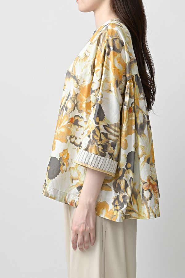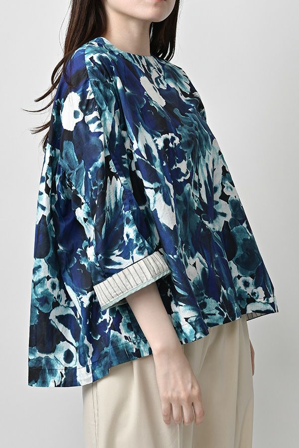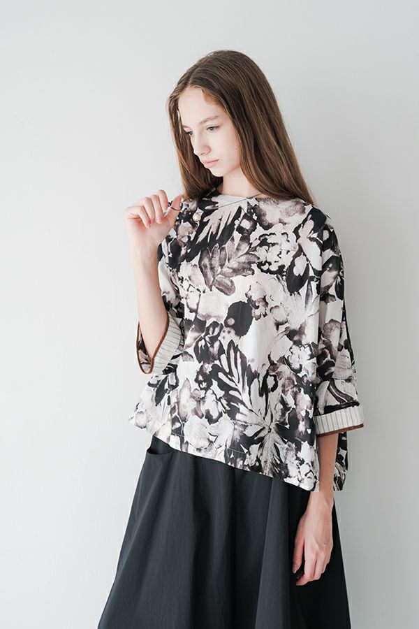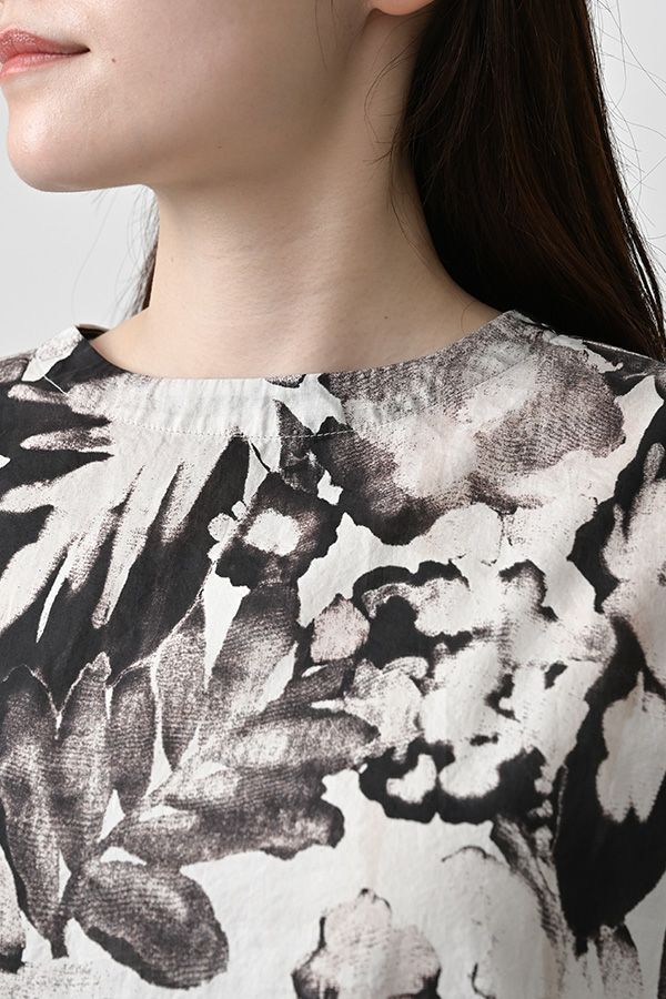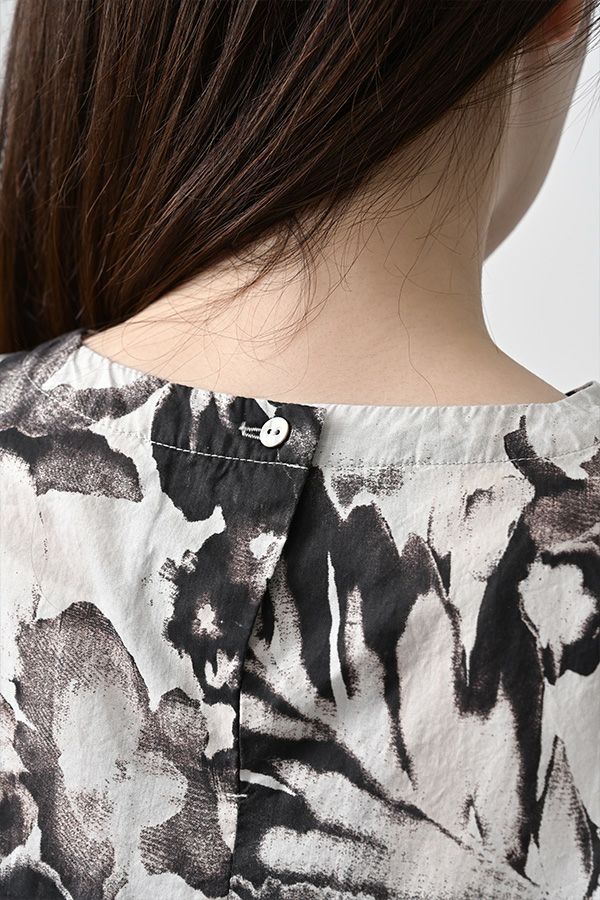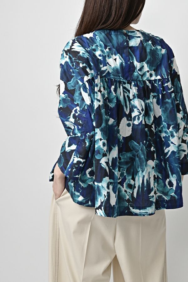 後ろ姿まで美しい、大人のガーデンプリントブラウス。 後ろ身頃にたっぷりとギャザーを施すことで、ふんわりとした立体的なシルエットが生まれ、動くたびに揺れる柔らかなボリューム感が魅力です。袖口を折り返すとちらりとストライプ柄がのぞき、遊び心のあるアクセントに。後ろの涙あきはほんのり斜めにデザインされていて、後ろ姿にもさりげないニュアンスを。さらに背中の見返しにも同柄をあしらい、ハンガーにかけたときも美しい表情をキープします。 素材には毎年人気の薄手80綿ローンを使用。軽やかで爽やかな着心地が春の装いにぴったりです。オンブレー調(同系色)の自然豊かなガーデンプリントは、大人の女性に似合う上品な華やかさを演出。 パンツにもスカートにも合わせやすい丈感で、シンプルにデニムと合わせるだけでも春らしいスタイリングが完成します。前からも後ろからも美しいフォルムを楽しめる、一枚で主役になるブラウスです。 ●オリジナルテキスタイル