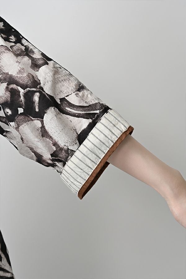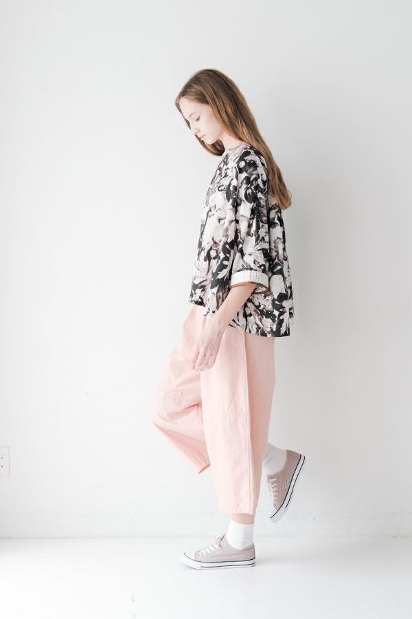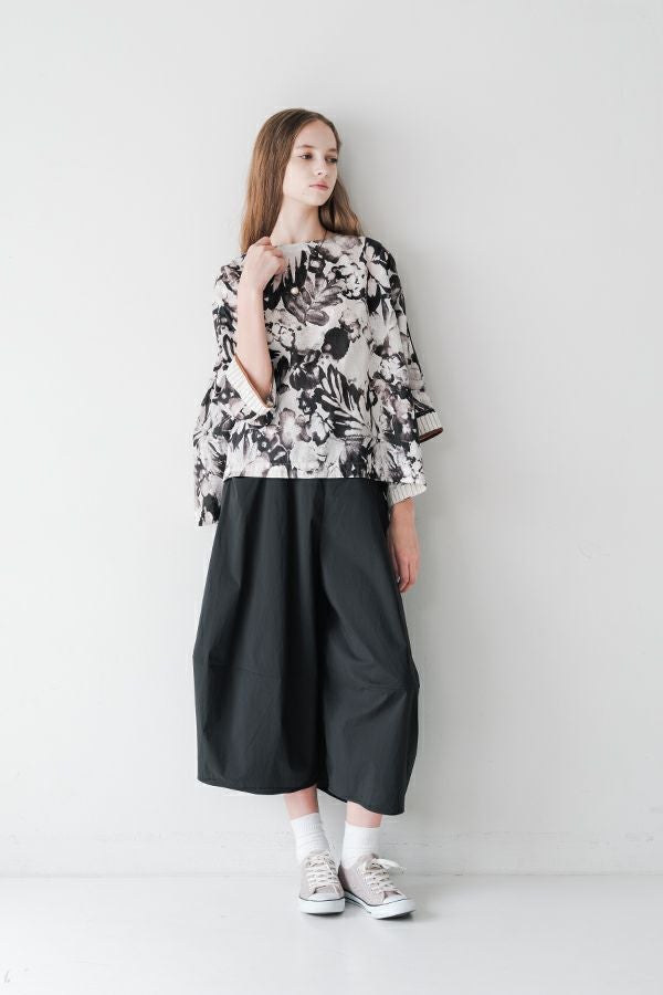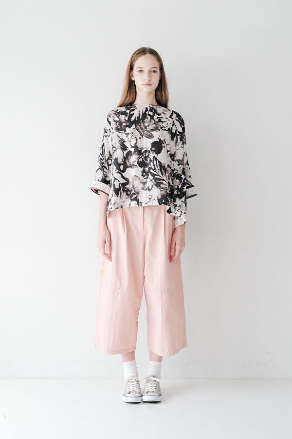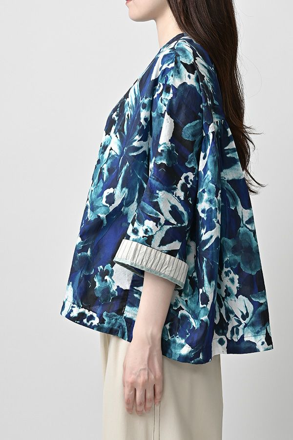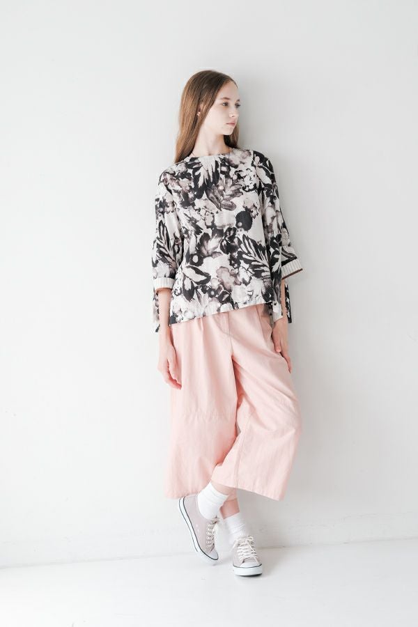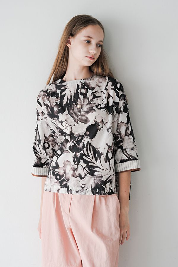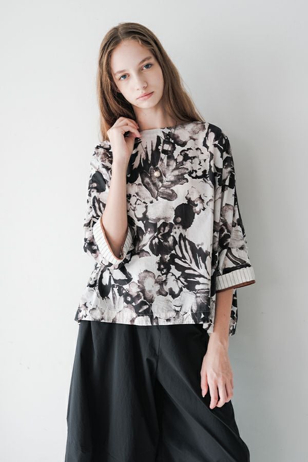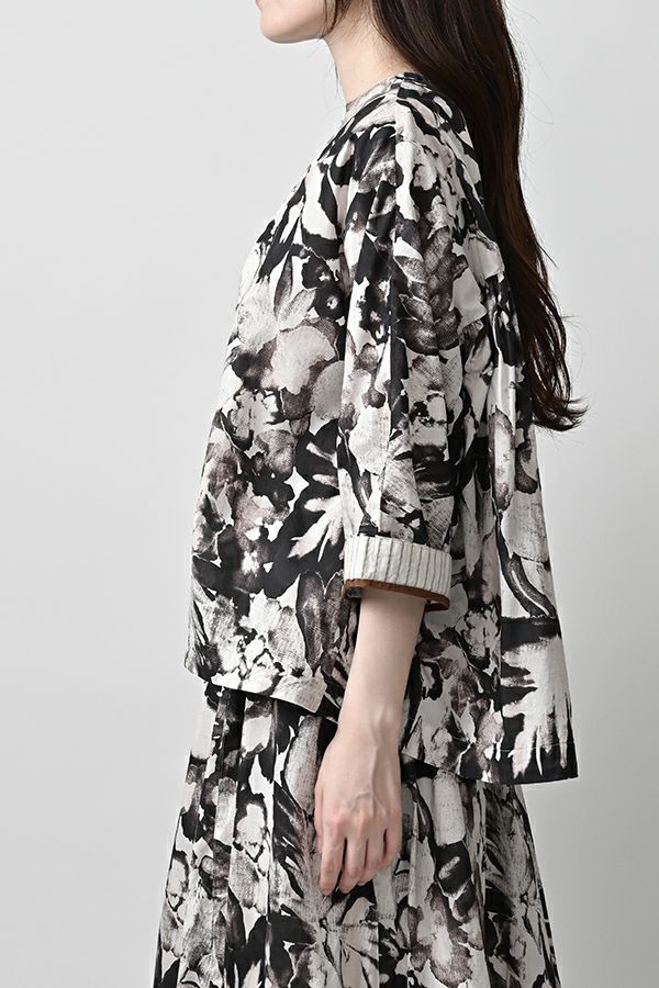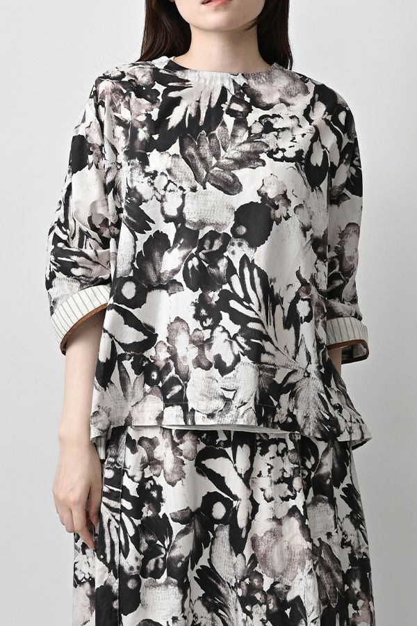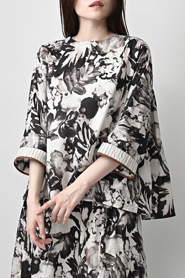 後ろ姿まで美しい、大人のガーデンプリントブラウス。 後ろ身頃にたっぷりとギャザーを施すことで、ふんわりとした立体的なシルエットが生まれ、動くたびに揺れる柔らかなボリューム感が魅力です。袖口を折り返すとちらりとストライプ柄がのぞき、遊び心のあるアクセントに。後ろの涙あきはほんのり斜めにデザインされていて、後ろ姿にもさりげないニュアンスを。さらに背中の見返しにも同柄をあしらい、ハンガーにかけたときも美しい表情をキープします。 素材には毎年人気の薄手80綿ローンを使用。軽やかで爽やかな着心地が春の装いにぴったりです。オンブレー調(同系色)の自然豊かなガーデンプリントは、大人の女性に似合う上品な華やかさを演出。 パンツにもスカートにも合わせやすい丈感で、シンプルにデニムと合わせるだけでも春らしいスタイリングが完成します。前からも後ろからも美しいフォルムを楽しめる、一枚で主役になるブラウスです。 ●オリジナルテキスタイル