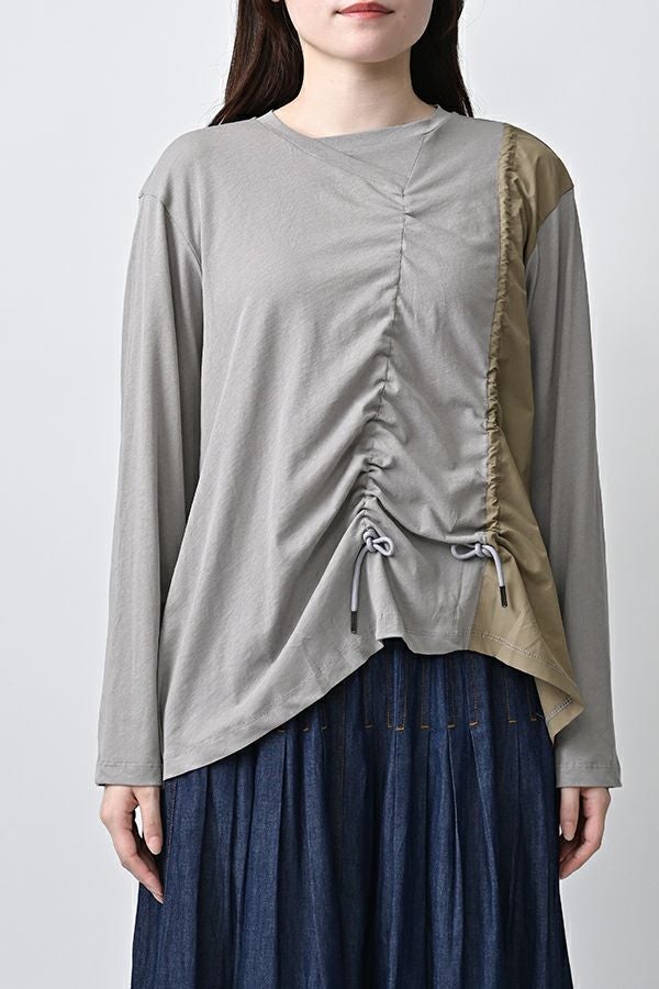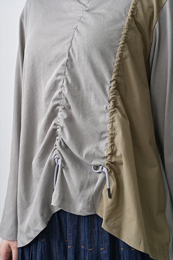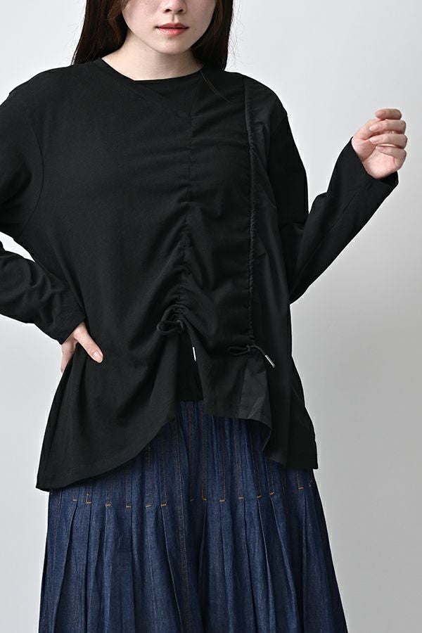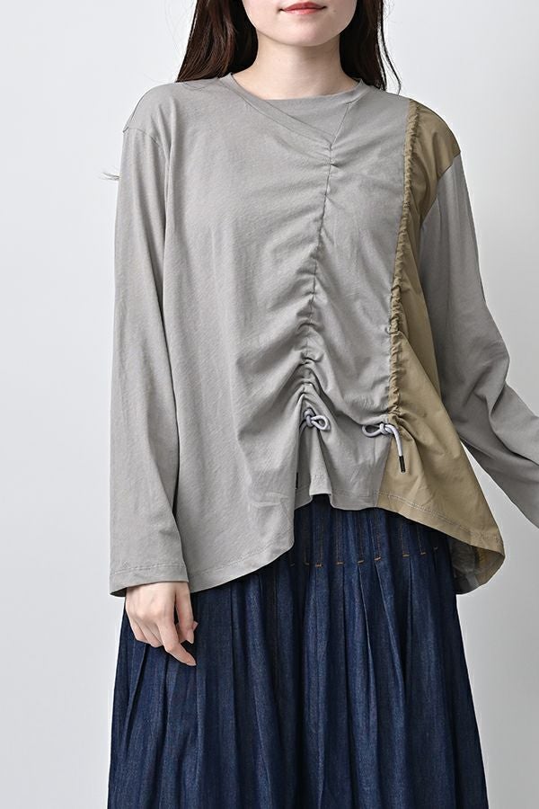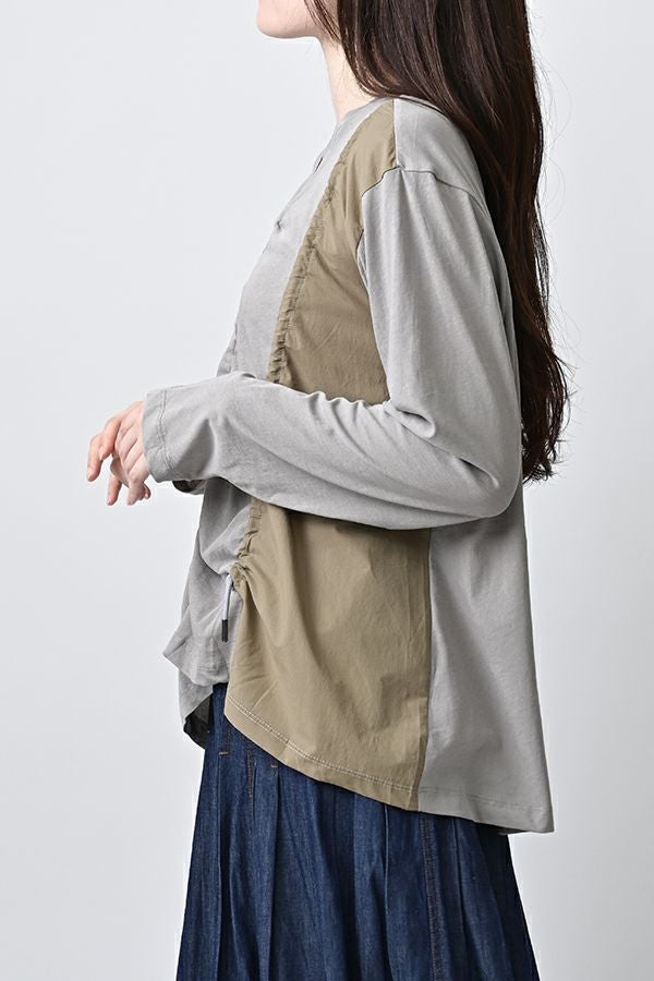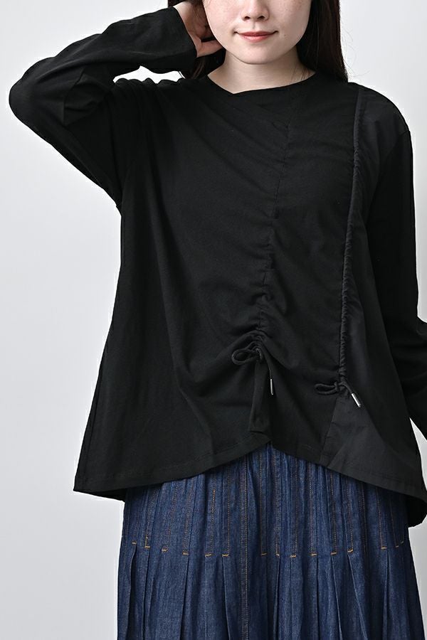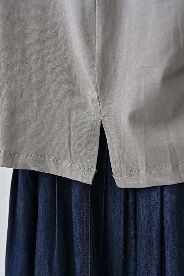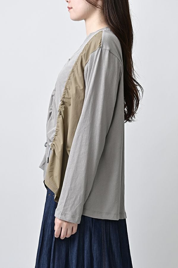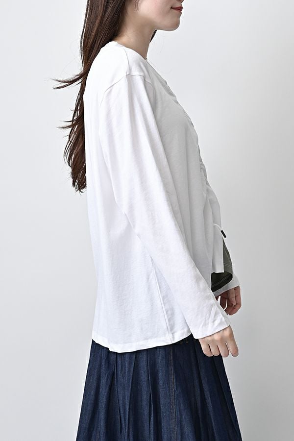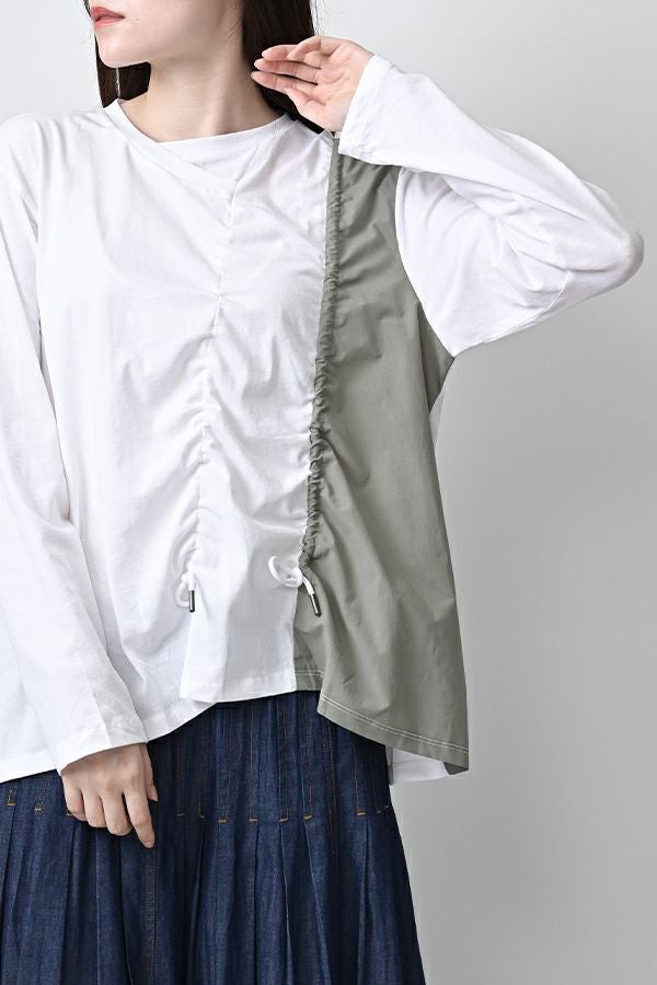 清涼感と美シルエットを叶える、重ね着風ドレープカットソープルオーバー。 綿の細番手の強く撚られた糸で編まれたカットソー素材は、肌触りは柔らかく、程よいシャリ感が心地よい一枚。肌に触る部分も細かな凹凸感があるので、清涼感のある着心地を実現。強撚糸ならではのしなやかさで、着るほどに体に馴染み、年間を通してシーズンレスに活躍します。 重ね着風の衿ぐりラインのデザインと、身頃の紐シャーリングがポイント。 自然なドレープとゆとりを生み出し、体型カバーにも優れた設計です。 シンプルながらも計算されたディテールが、着るだけで上品で大人のこなれた印象を演出します。