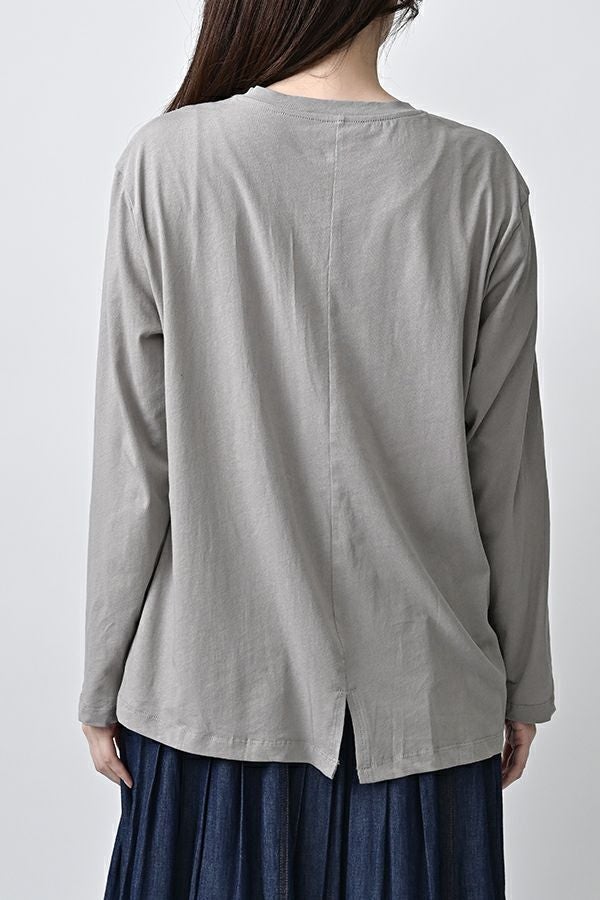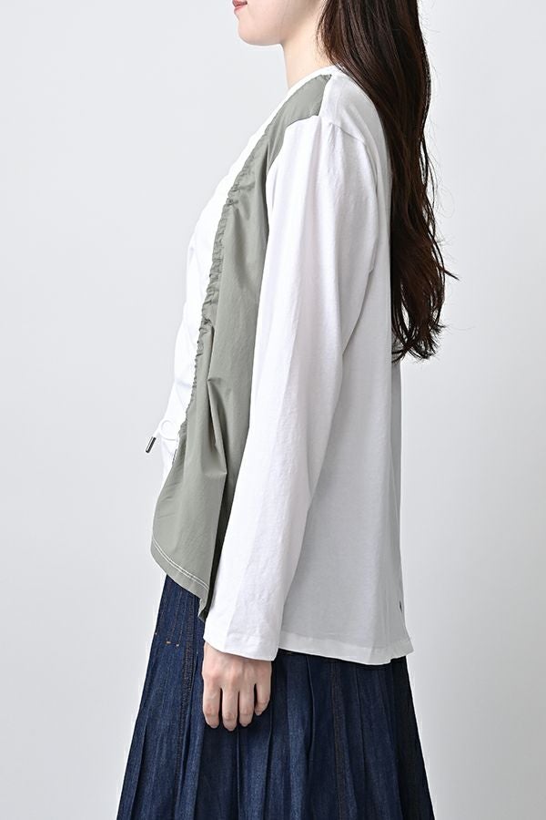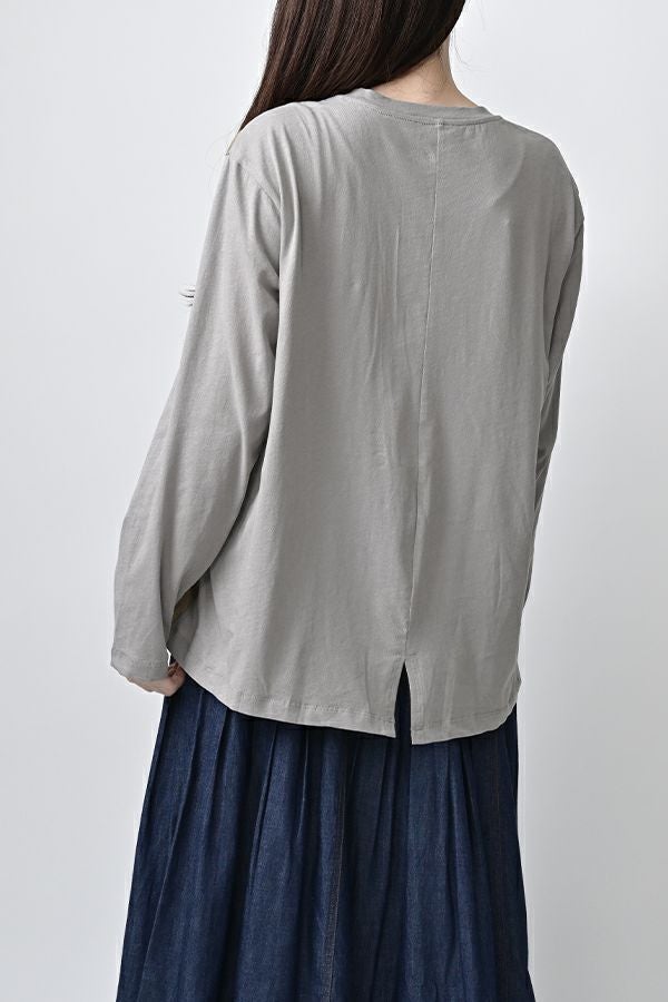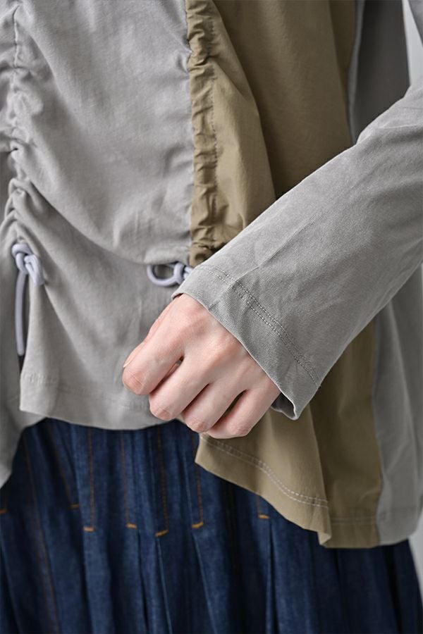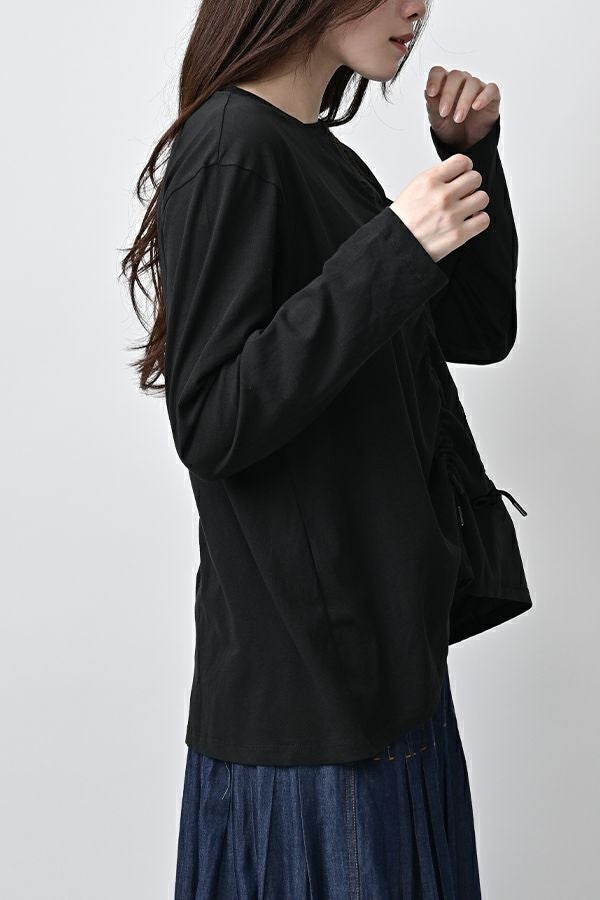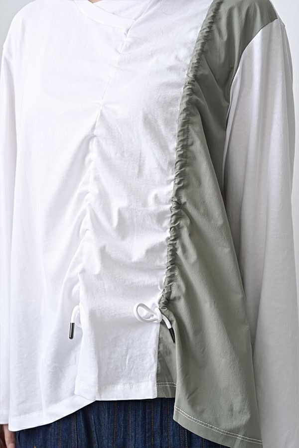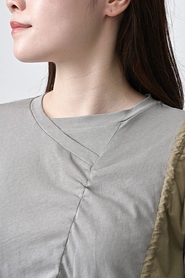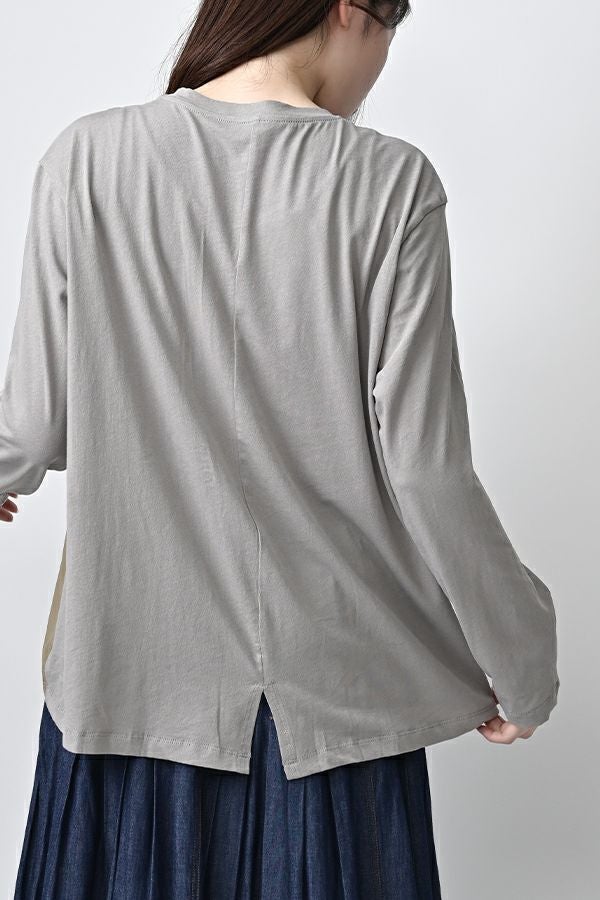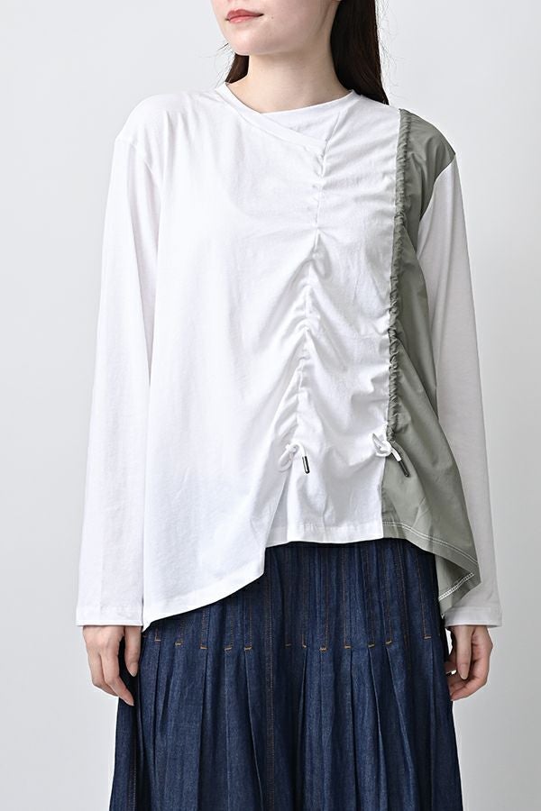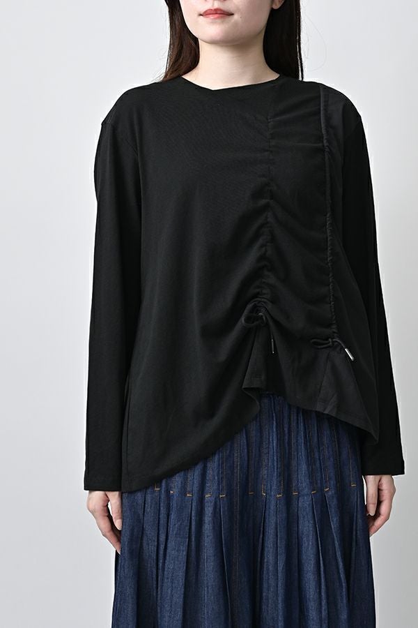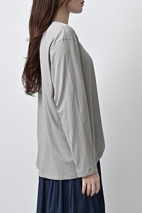 清涼感と美シルエットを叶える、重ね着風ドレープカットソープルオーバー。 綿の細番手の強く撚られた糸で編まれたカットソー素材は、肌触りは柔らかく、程よいシャリ感が心地よい一枚。肌に触る部分も細かな凹凸感があるので、清涼感のある着心地を実現。強撚糸ならではのしなやかさで、着るほどに体に馴染み、年間を通してシーズンレスに活躍します。 重ね着風の衿ぐりラインのデザインと、身頃の紐シャーリングがポイント。 自然なドレープとゆとりを生み出し、体型カバーにも優れた設計です。 シンプルながらも計算されたディテールが、着るだけで上品で大人のこなれた印象を演出します。