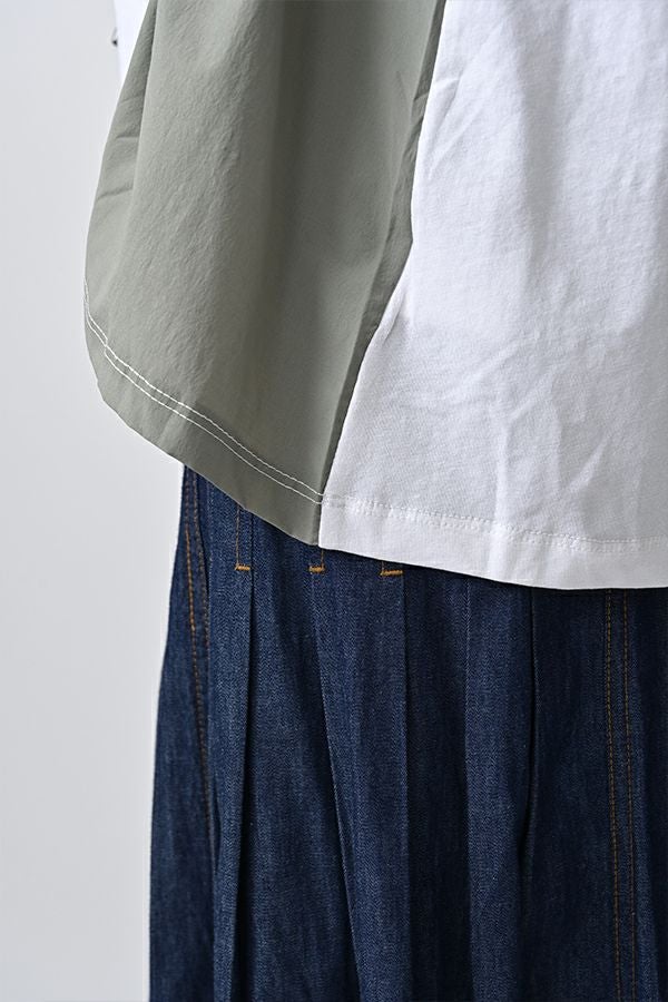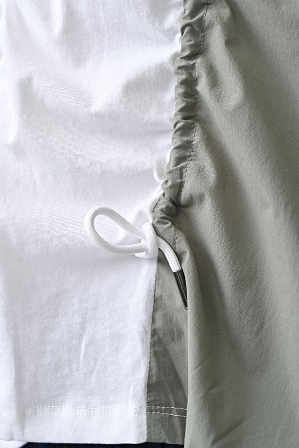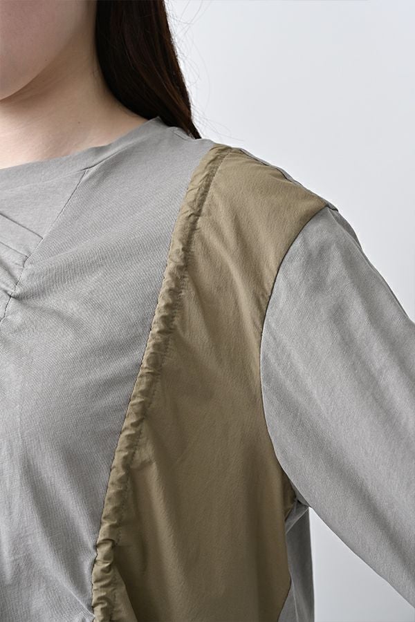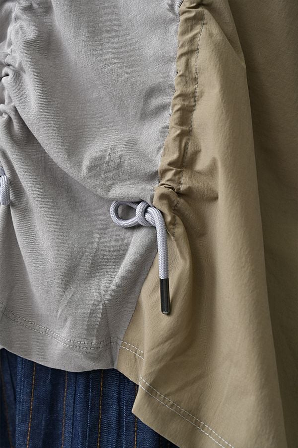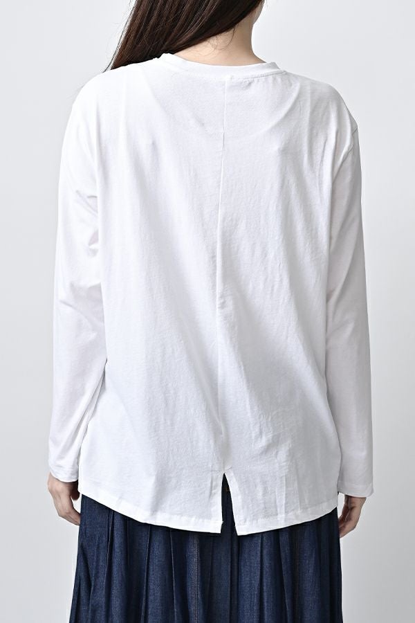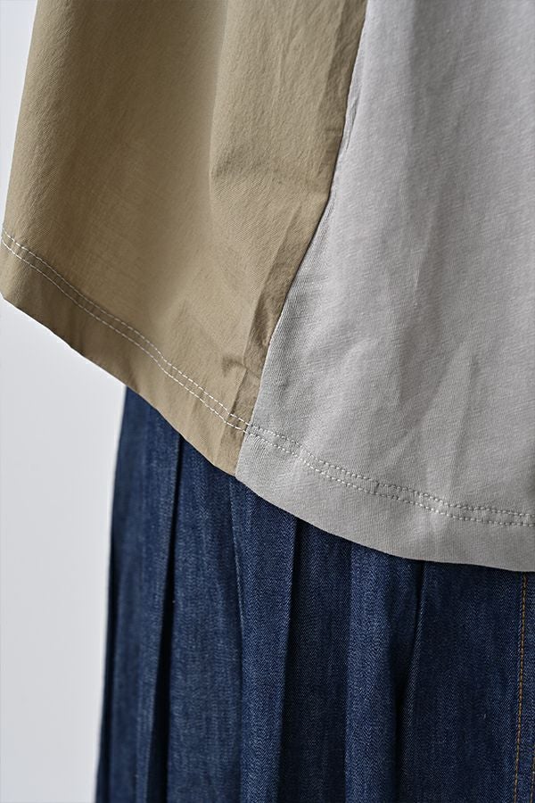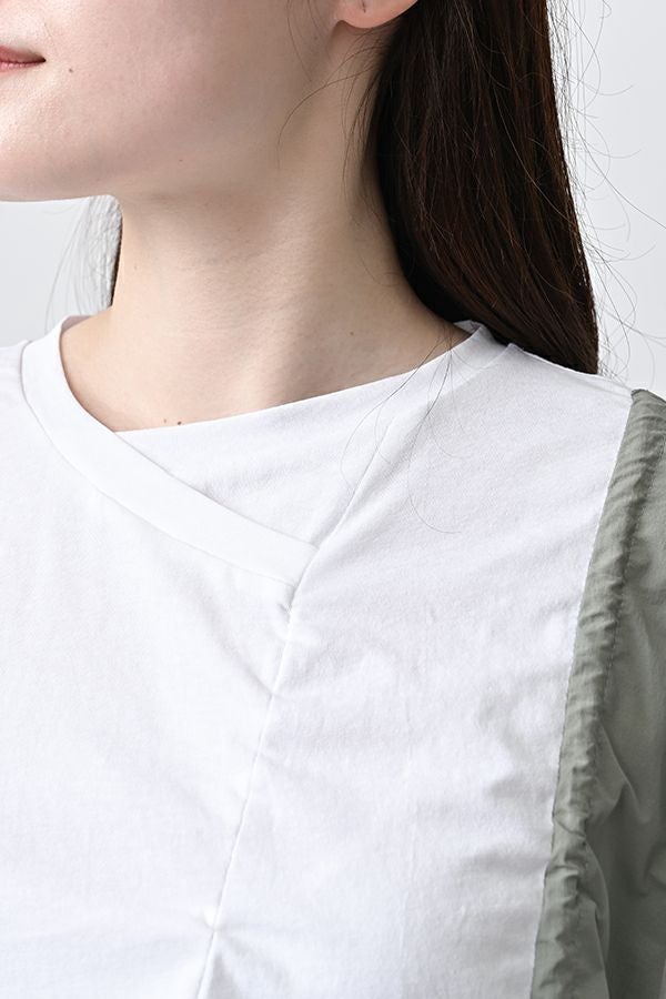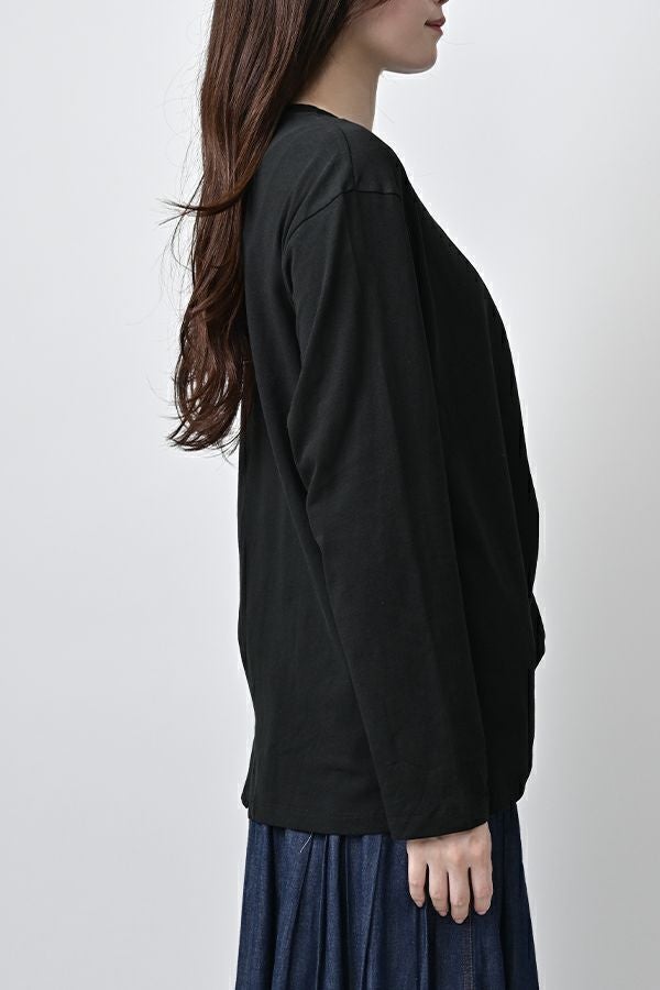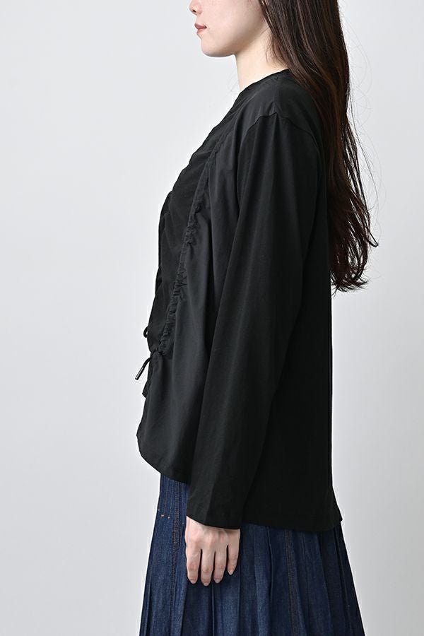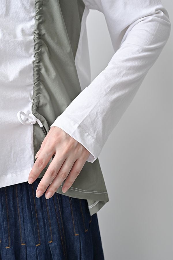 清涼感と美シルエットを叶える、重ね着風ドレープカットソープルオーバー。 綿の細番手の強く撚られた糸で編まれたカットソー素材は、肌触りは柔らかく、程よいシャリ感が心地よい一枚。肌に触る部分も細かな凹凸感があるので、清涼感のある着心地を実現。強撚糸ならではのしなやかさで、着るほどに体に馴染み、年間を通してシーズンレスに活躍します。 重ね着風の衿ぐりラインのデザインと、身頃の紐シャーリングがポイント。 自然なドレープとゆとりを生み出し、体型カバーにも優れた設計です。 シンプルながらも計算されたディテールが、着るだけで上品で大人のこなれた印象を演出します。