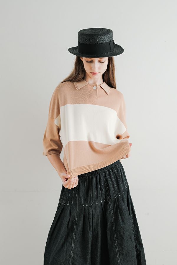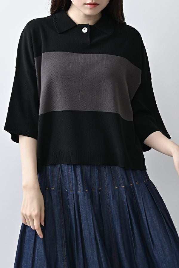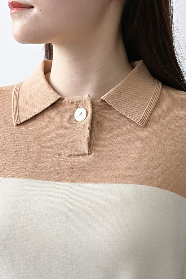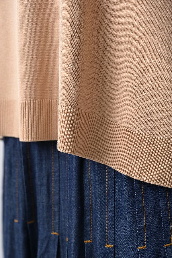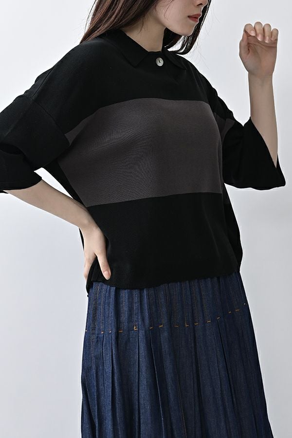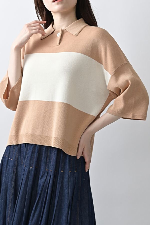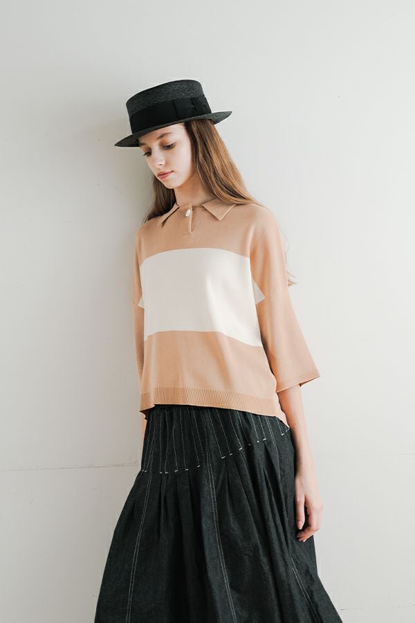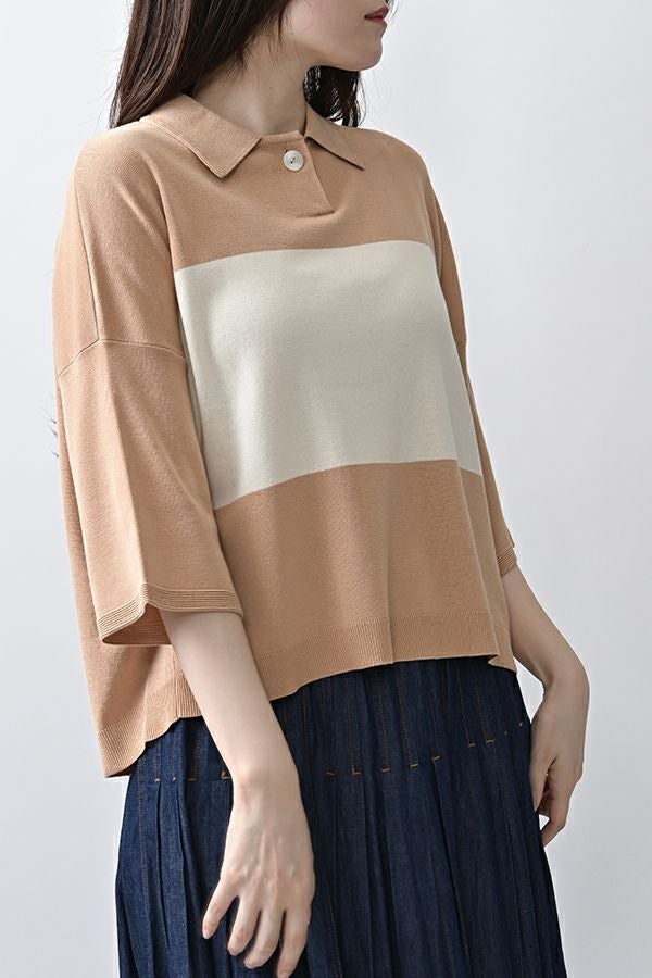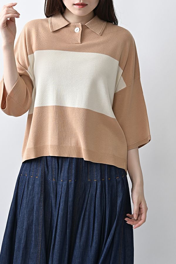 光沢ととろみで魅せる、シャツ襟ニットプルオーバー。 コットンのドライタッチにアセテートのしなやかな光沢を加え、とろみ感の肌当たりはうっとりする着心地の一着。総針編みの美しいシルエットに、きちんと感の漂うシャツ襟をあしらいながらも、オーバーサイズでリラクシーな着心地を実現しました。 コンパクトな丈は女性らしい雰囲気が漂い、胸もとのバイカラーアクセントは、ウエストより上に視線を誘導し、スタイリッシュな印象をプラス。サッと着るだけでビジネスシーンにも映え、きちん感のあるニットです。 リラクシーな着用感のトップスは、ジャストウエストのスラックスやハイウエストタイトスカートと合わせることで、こなれ感ある大人の着こなしに。 上質素材と計算されたデザインが、日常のスタイリングに洗練された雰囲気をもたらします。