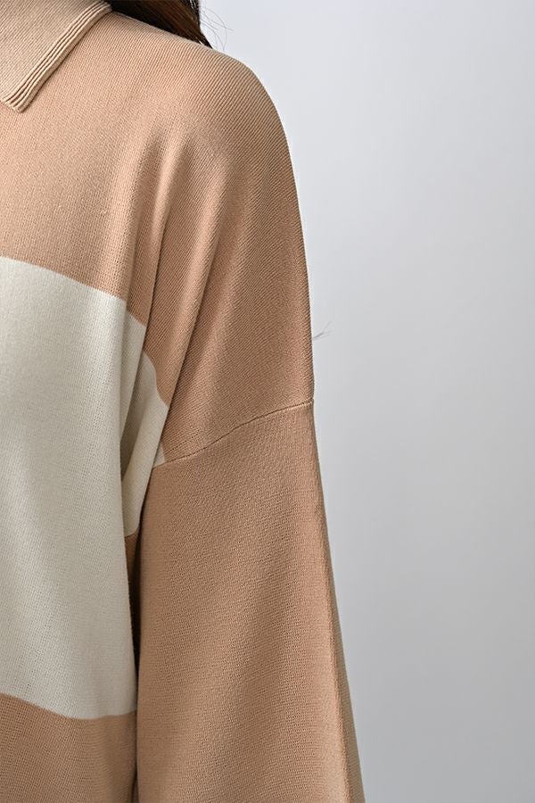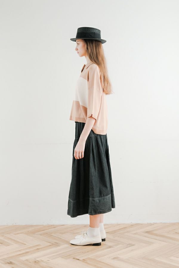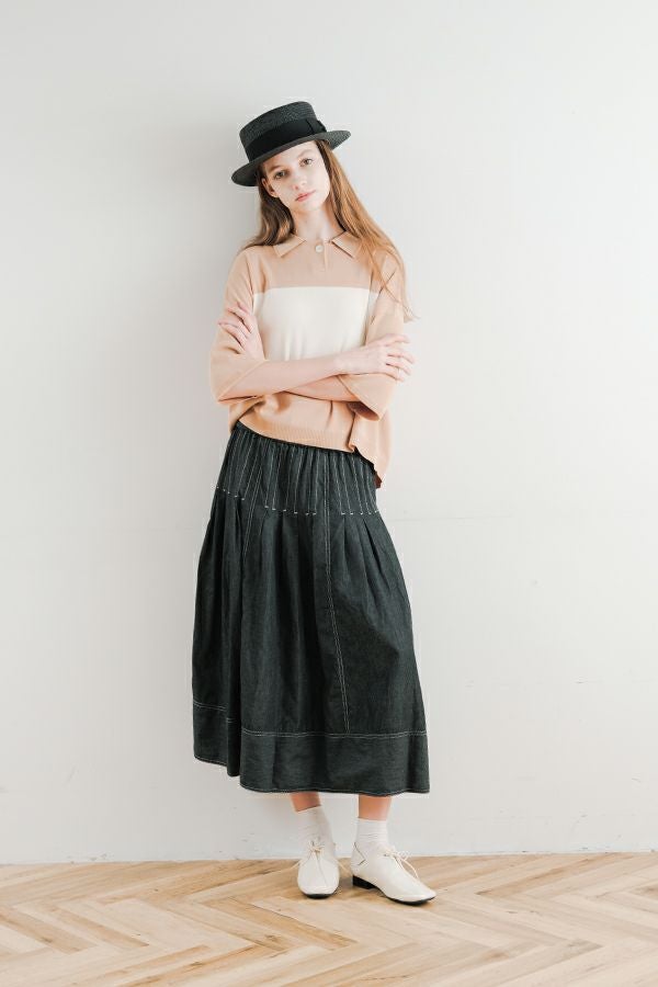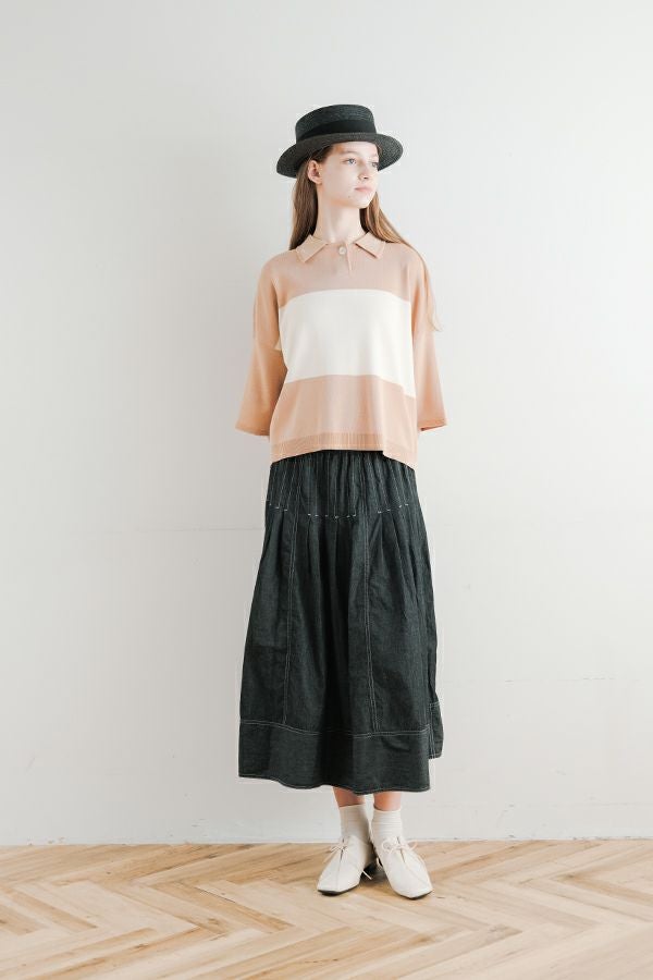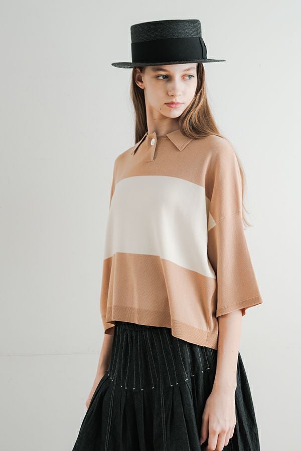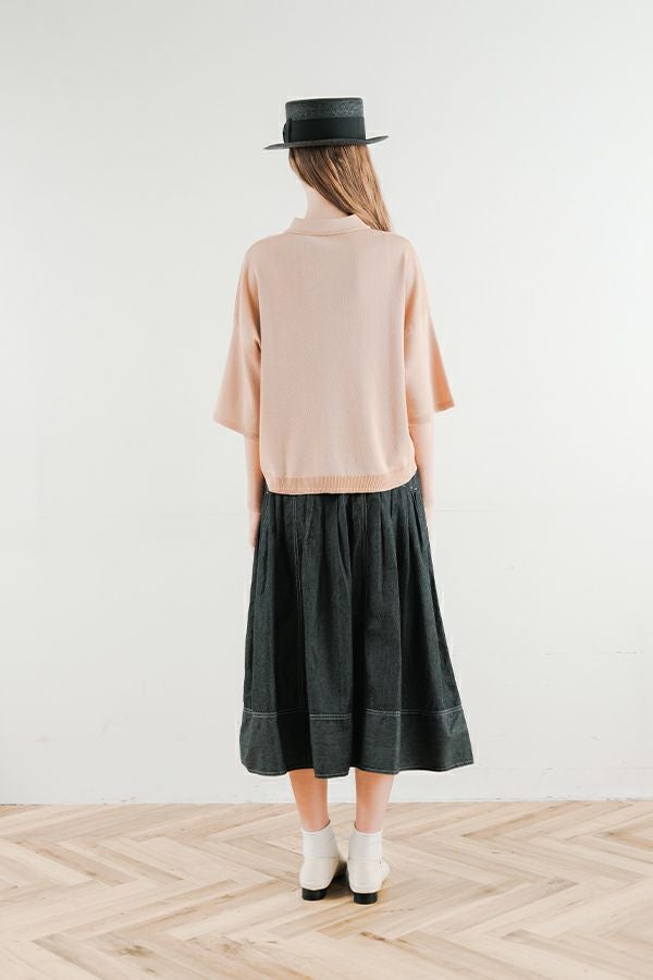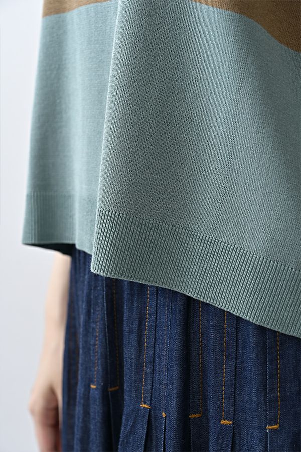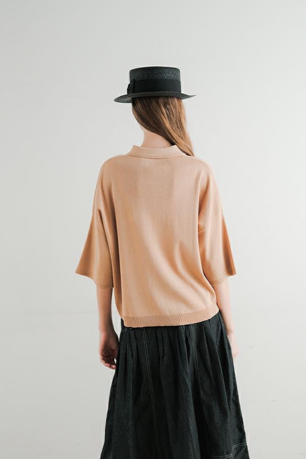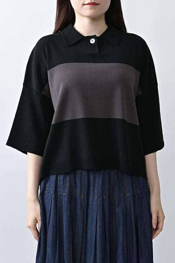 光沢ととろみで魅せる、シャツ襟ニットプルオーバー。 コットンのドライタッチにアセテートのしなやかな光沢を加え、とろみ感の肌当たりはうっとりする着心地の一着。総針編みの美しいシルエットに、きちんと感の漂うシャツ襟をあしらいながらも、オーバーサイズでリラクシーな着心地を実現しました。 コンパクトな丈は女性らしい雰囲気が漂い、胸もとのバイカラーアクセントは、ウエストより上に視線を誘導し、スタイリッシュな印象をプラス。サッと着るだけでビジネスシーンにも映え、きちん感のあるニットです。 リラクシーな着用感のトップスは、ジャストウエストのスラックスやハイウエストタイトスカートと合わせることで、こなれ感ある大人の着こなしに。 上質素材と計算されたデザインが、日常のスタイリングに洗練された雰囲気をもたらします。