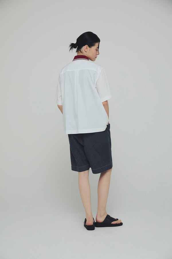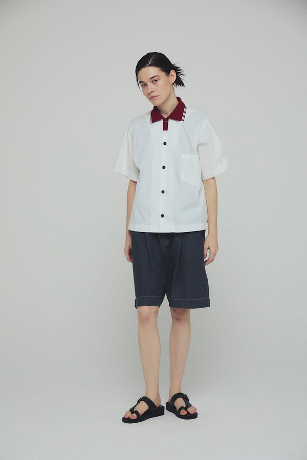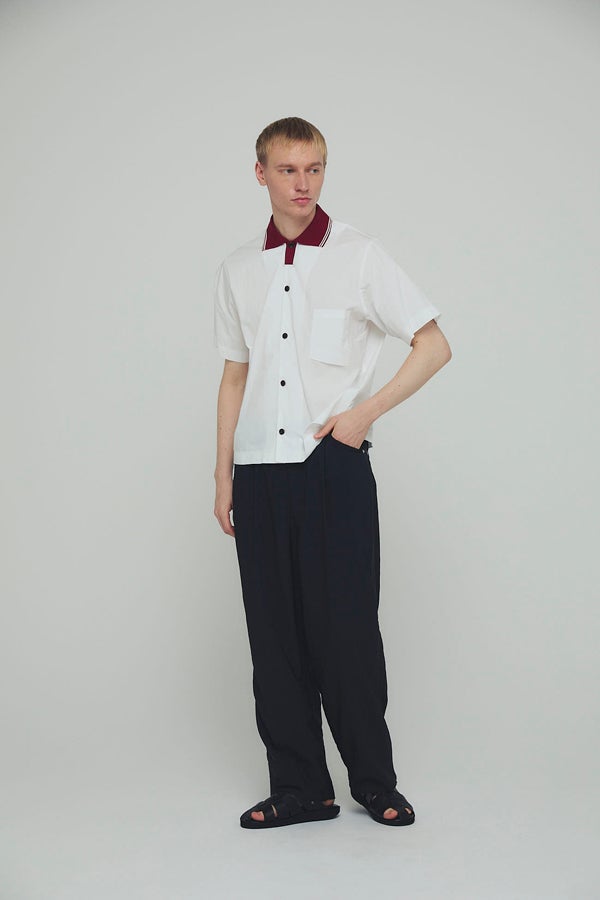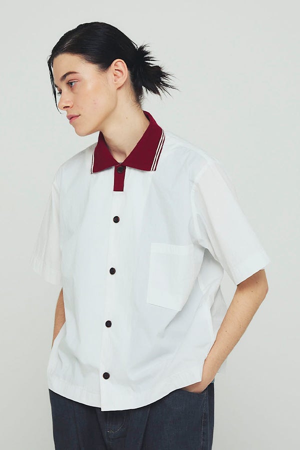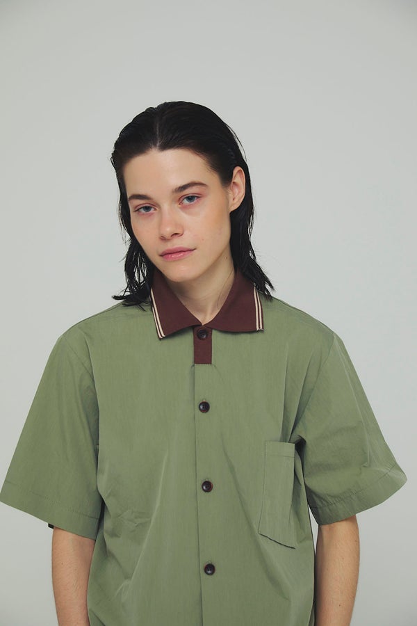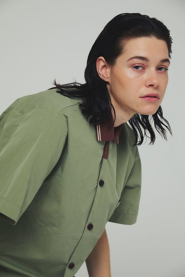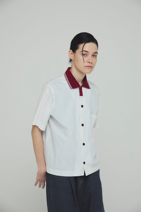素材には、ハリ感のある布帛に洗いをかけ、独特な表情を引き出したウェザー生地を使用。編み立ての配色ニット襟をドッキングし、ありそうでなかったポロシャツに仕上げています。