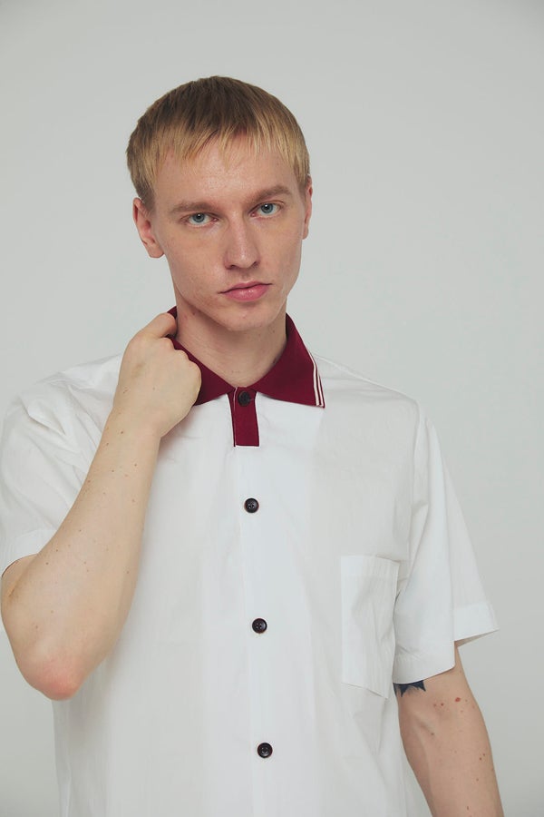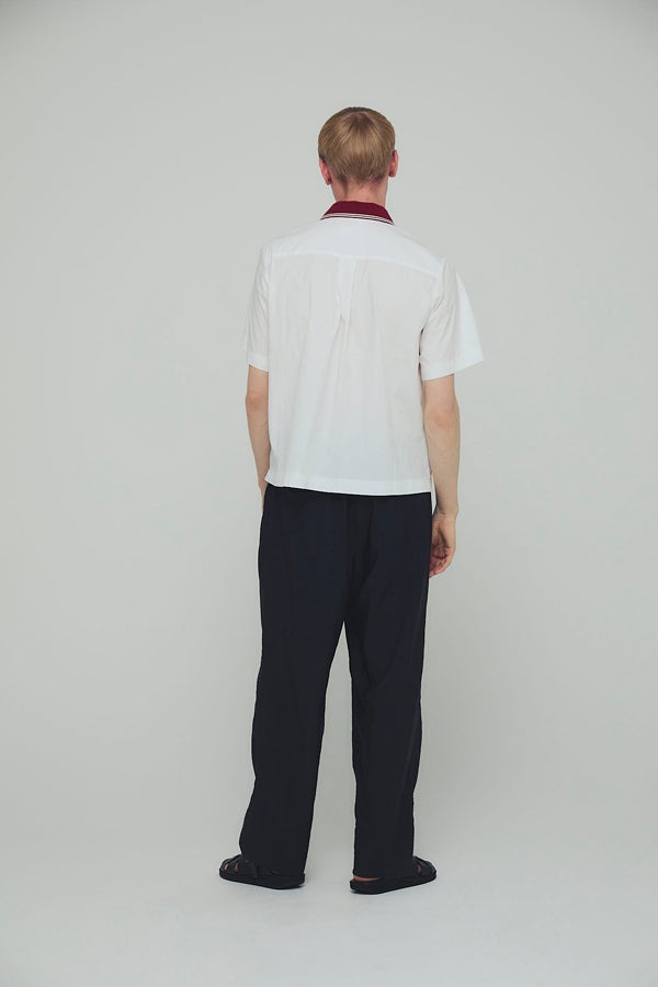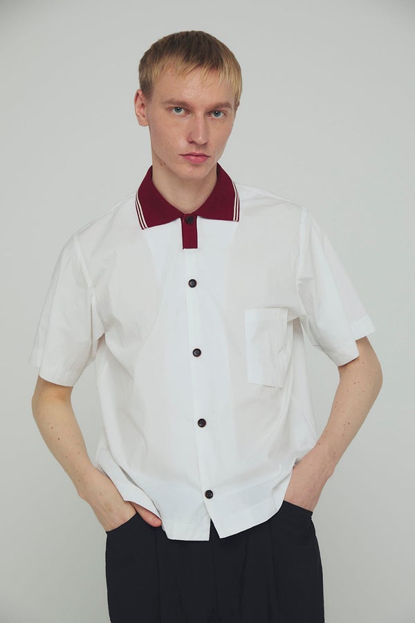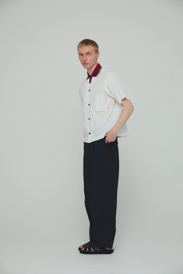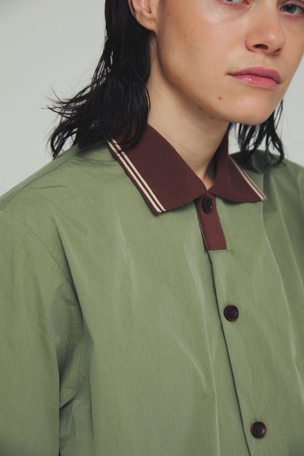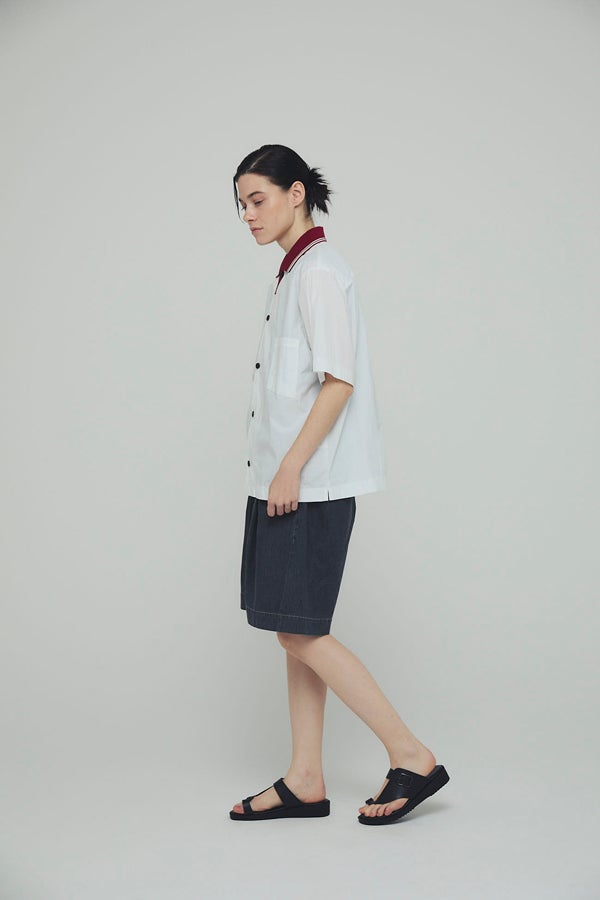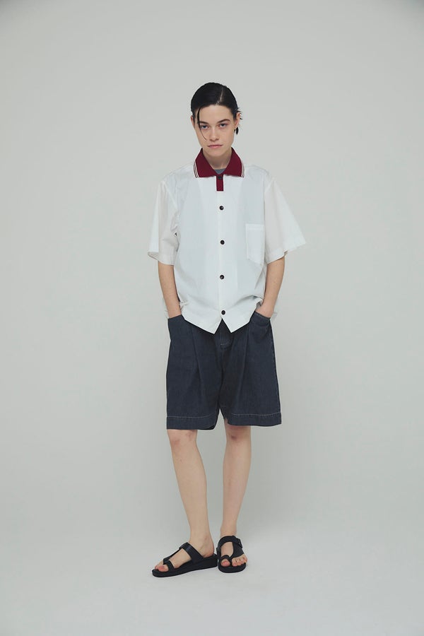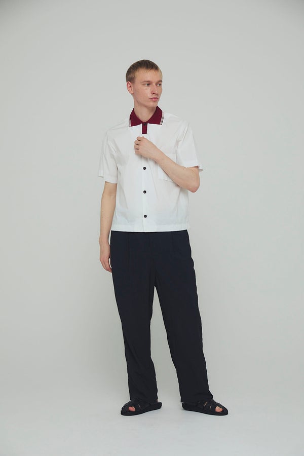 素材には、ハリ感のある布帛に洗いをかけ、独特な表情を引き出したウェザー生地を使用。編み立ての配色ニット襟をドッキングし、ありそうでなかったポロシャツに仕上げています。