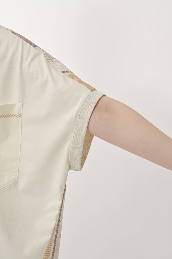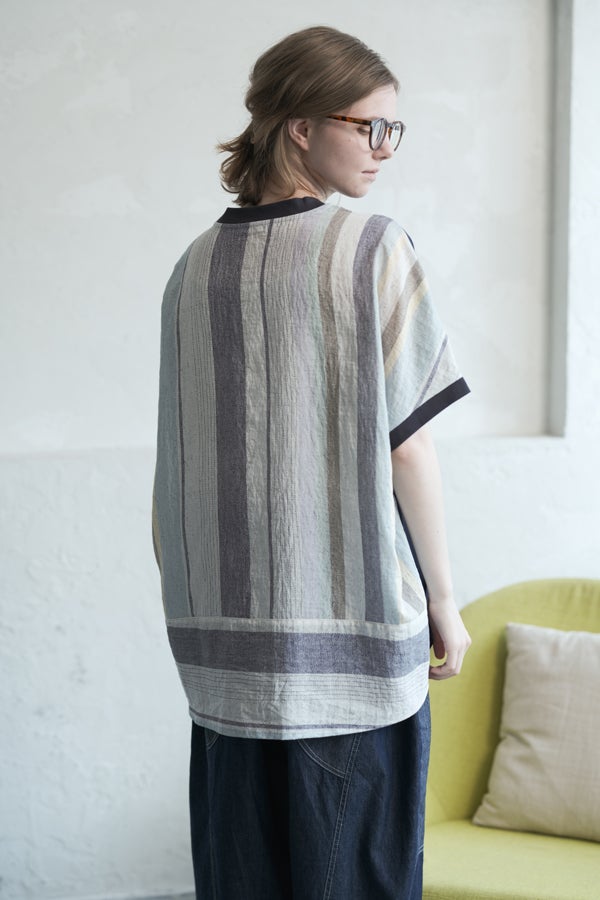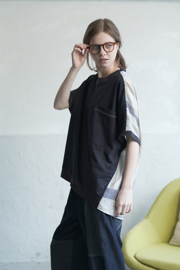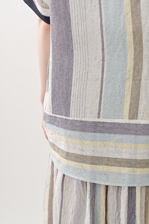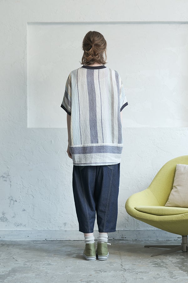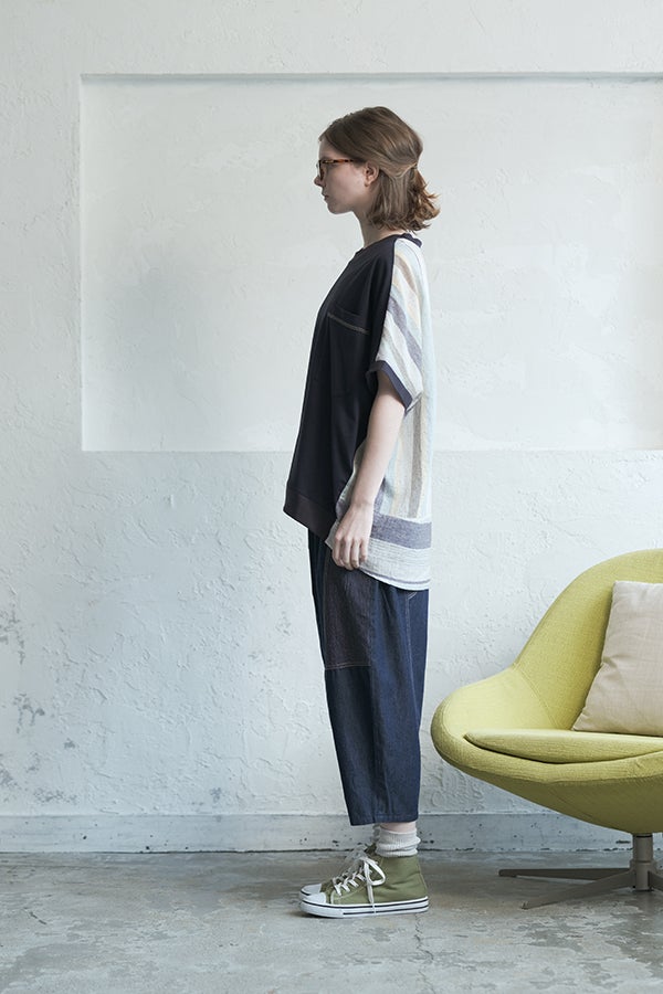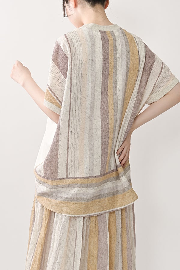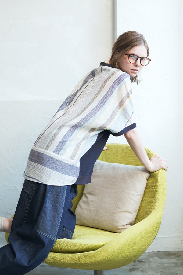 異素材の表情をまとう、ストライプコンビプルオーバー。 フロントには、肌に寄り添うような滑らかなカットソー。バックには、akaneオリジナルの膨らみとシャリ感のあるプリントストライプ素材を使用。前後で質感が切り替わることで、シンプルな中に個性が宿る、大人のためのコンビデザインです。 身幅はワイドでゆったり。肩のラインに自然と沿うドルマンシルエットが、抜け感をつくりながらも動きやすさを確保。衿・袖口・裾にはリブを配し、大きめの胸ポケットを添えてカジュアルダウンしつつ、きれいめにも着こなせる絶妙なバランスに。 今年らしいオーバーシルエットながら、脇線を斜めに処理することで、体のラインを美しく見せる大人仕様に仕上げています。 同素材のスカートとのセットアップはもちろん、ライトデニム切替パンツ(26168-9687B-R)を合わせれば、すっきりとした大人カジュアルが完成。オン・オフどちらにも寄り添う、表情豊かなプルオーバーです。 ●ストライプタックスカート(26168-8090C-R)とセットアップ可 ●オリジナルプリント(ストライプ)