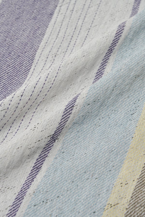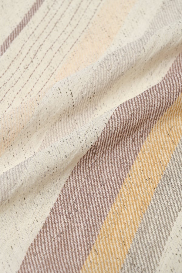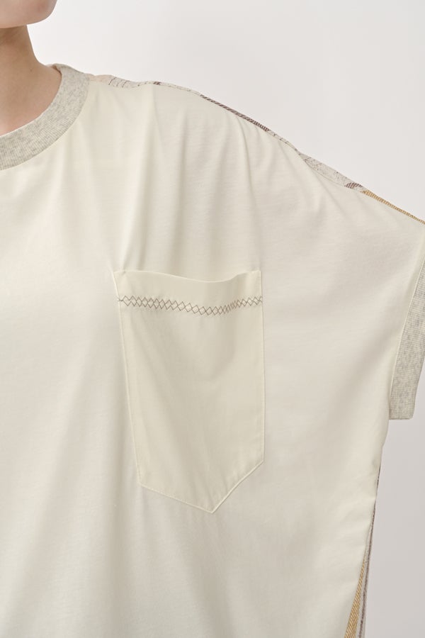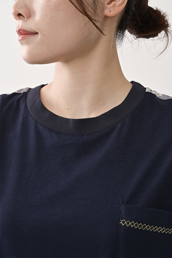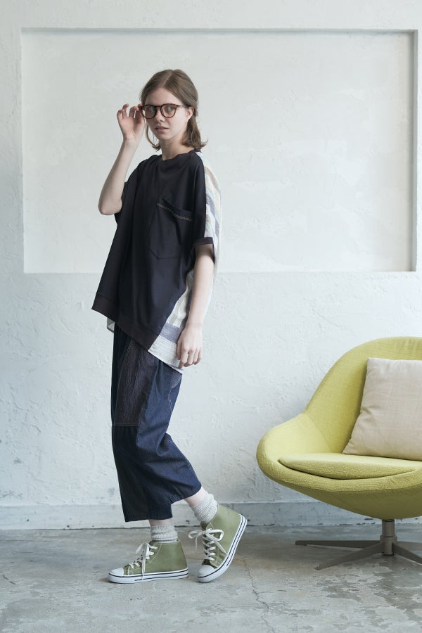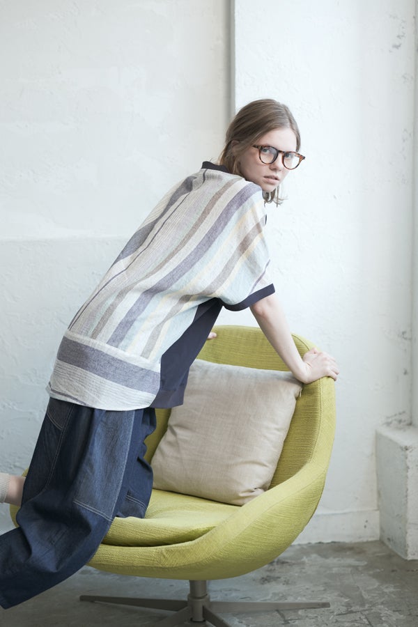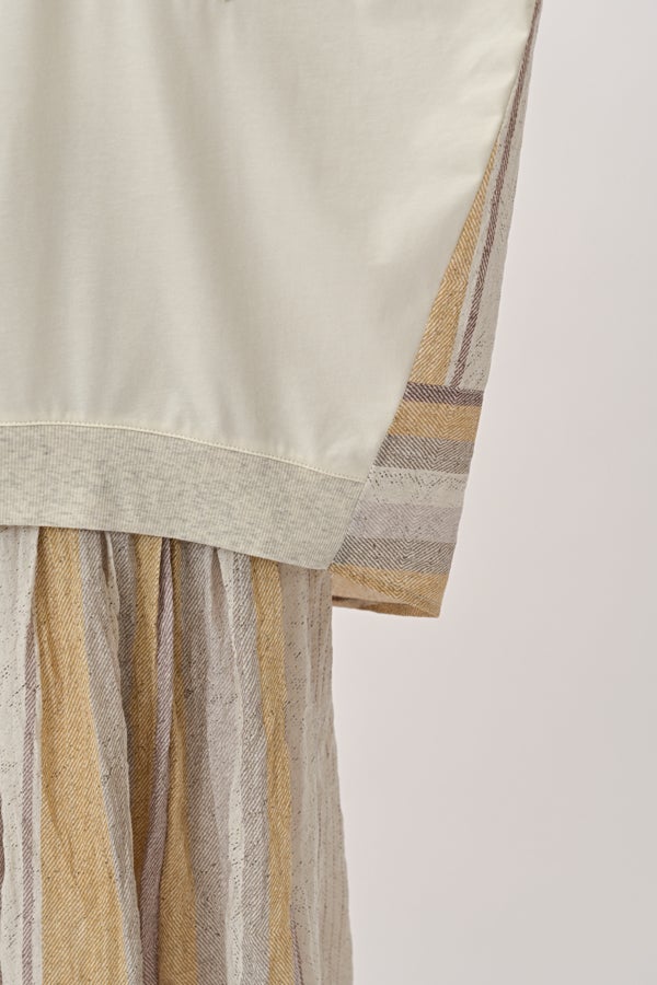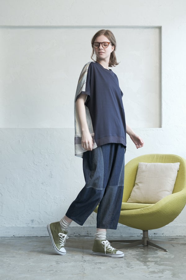 異素材の表情をまとう、ストライプコンビプルオーバー。 フロントには、肌に寄り添うような滑らかなカットソー。バックには、akaneオリジナルの膨らみとシャリ感のあるプリントストライプ素材を使用。前後で質感が切り替わることで、シンプルな中に個性が宿る、大人のためのコンビデザインです。 身幅はワイドでゆったり。肩のラインに自然と沿うドルマンシルエットが、抜け感をつくりながらも動きやすさを確保。衿・袖口・裾にはリブを配し、大きめの胸ポケットを添えてカジュアルダウンしつつ、きれいめにも着こなせる絶妙なバランスに。 今年らしいオーバーシルエットながら、脇線を斜めに処理することで、体のラインを美しく見せる大人仕様に仕上げています。 同素材のスカートとのセットアップはもちろん、ライトデニム切替パンツ(26168-9687B-R)を合わせれば、すっきりとした大人カジュアルが完成。オン・オフどちらにも寄り添う、表情豊かなプルオーバーです。 ●ストライプタックスカート(26168-8090C-R)とセットアップ可 ●オリジナルプリント(ストライプ)