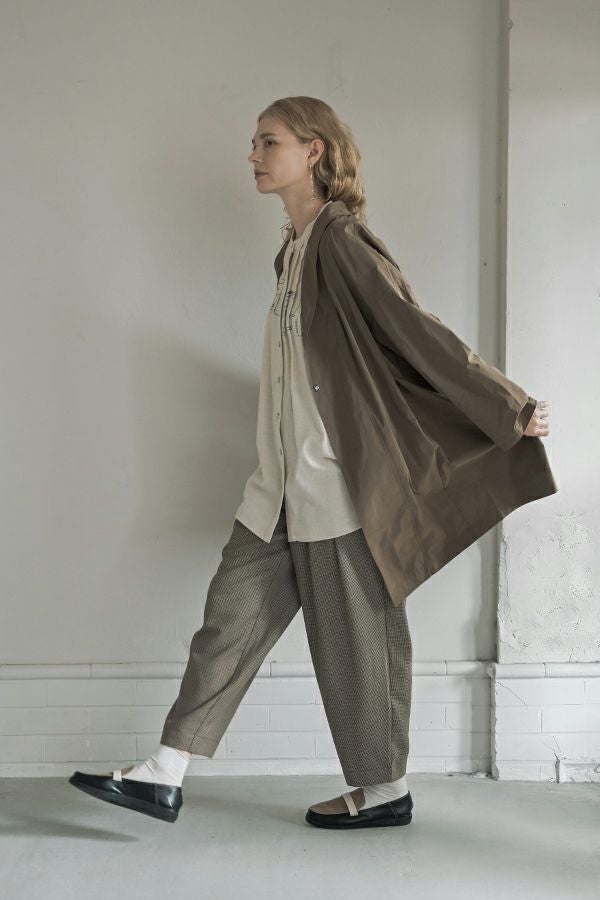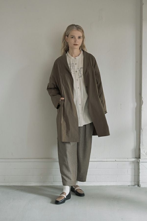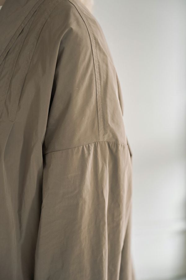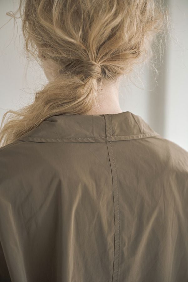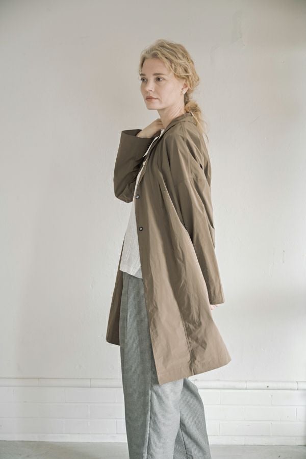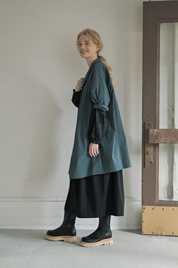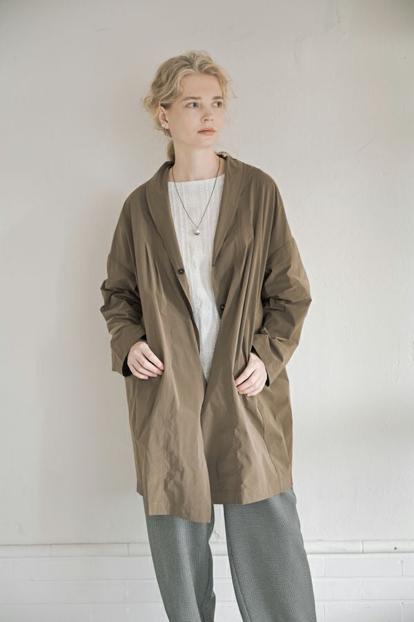 上品な光沢感が大人の着こなしに映えるドレープコート。 微光沢でハリ感のあるタフタ素材は、サラっとした風合いで 風を通さずシーズン通して快適に着用出来ます。反発感もあるのでシワにもなりにくい特徴もある優れもの。 ゆったりサイズなので、厚手でのセーター合わせも問題なし。パサっと羽織って"大人の抜け感"漂う着こなしが出来ます。