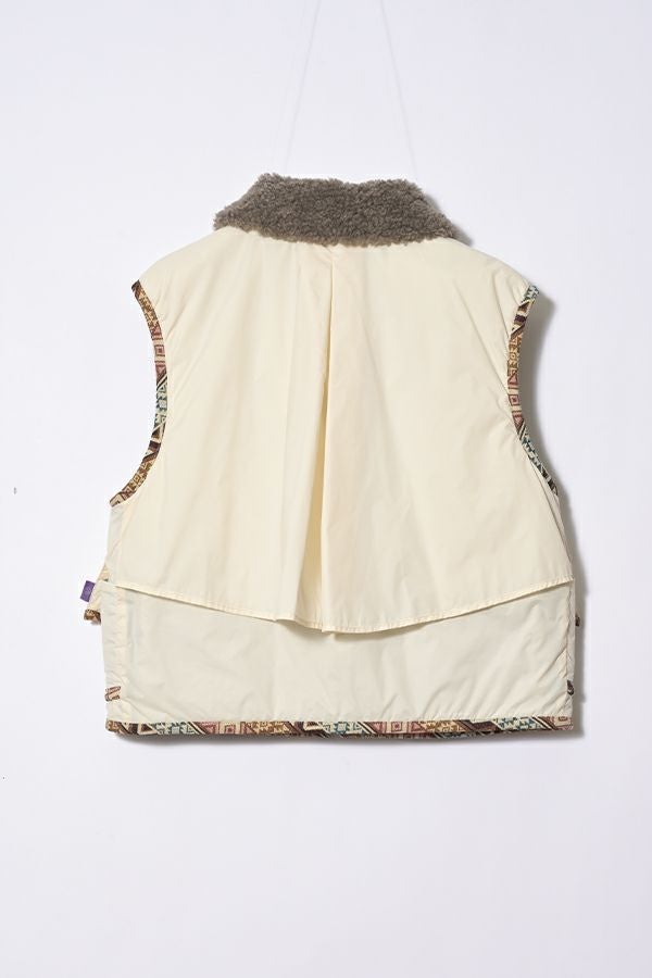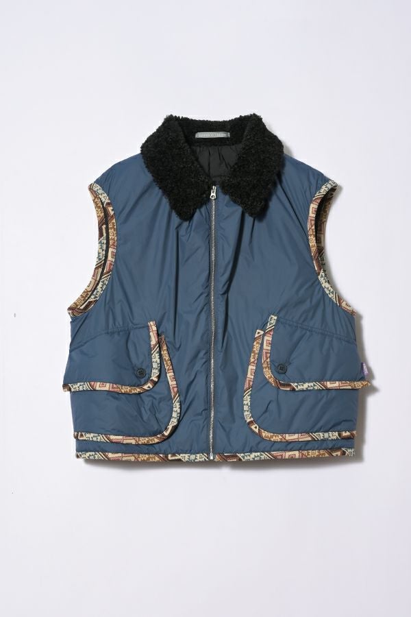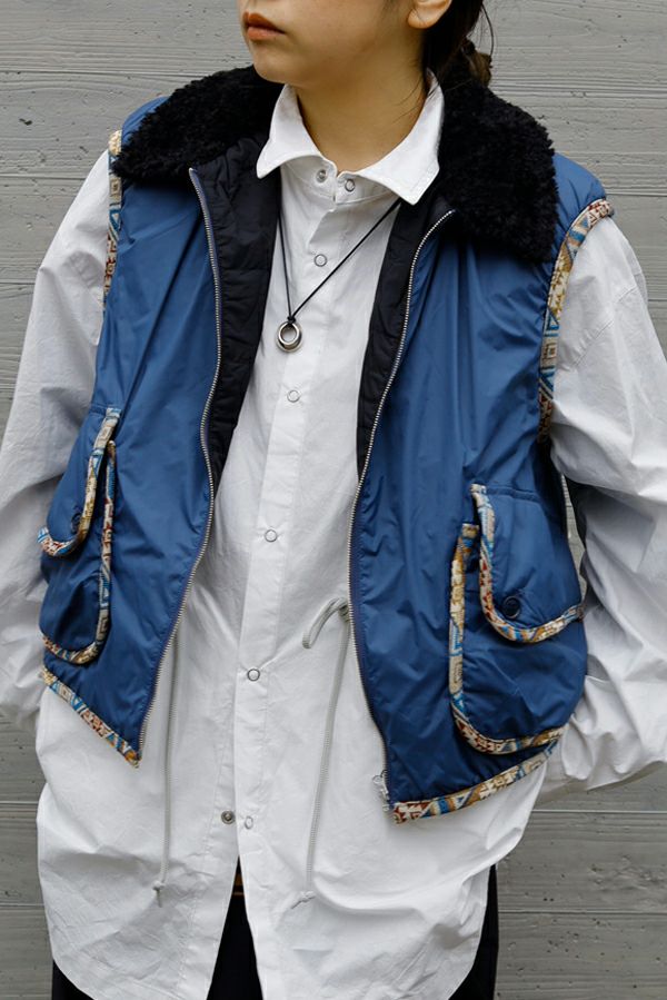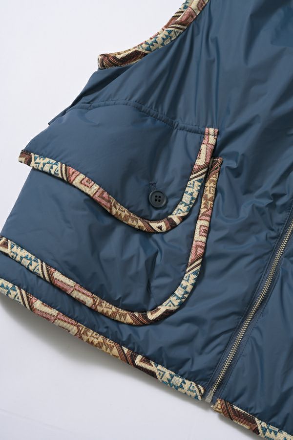 エッジの効いたパイピングが目を惹くコンパクトなベスト。 襟ぐりにギャザーを施し、ネイティブ柄のパインピングを太めに使用し雰囲気のあるデザインに。大きめのポケットはボタンを外さなくても脇から手が入る仕様にしています。ラフにロングTシャツやワンピースにも合わやすいアイテムです。 シンサレートという機能綿を使用し、中綿のゴワつきを抑えています。従来の中綿よりも薄手で、保温性があり湿気も逃す優れた綿です。「暖かいのに、厚くない」を可能にしています。