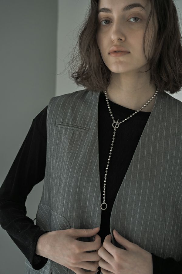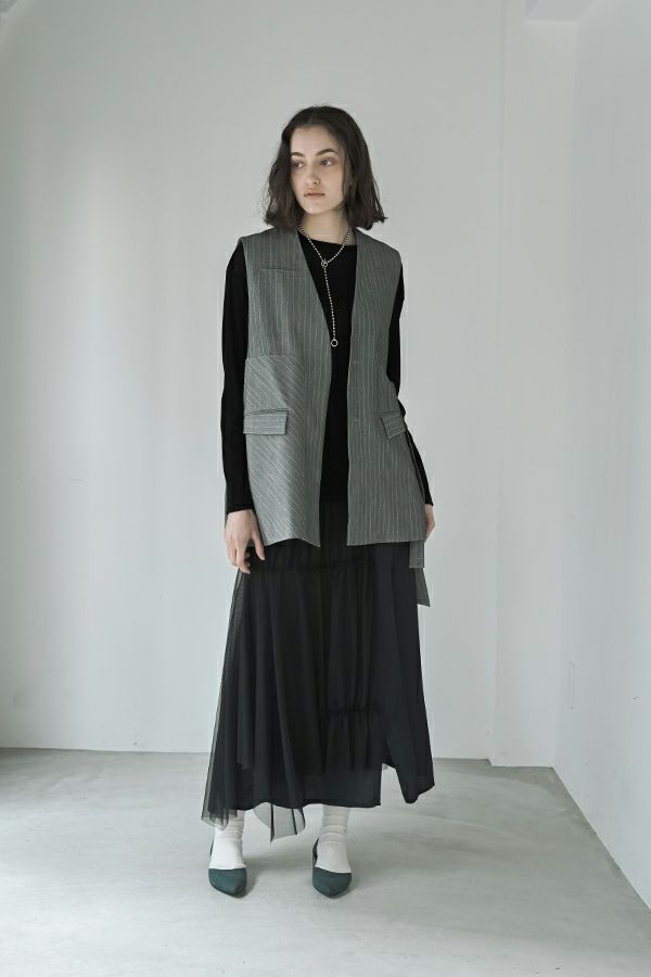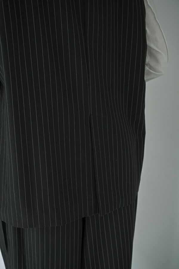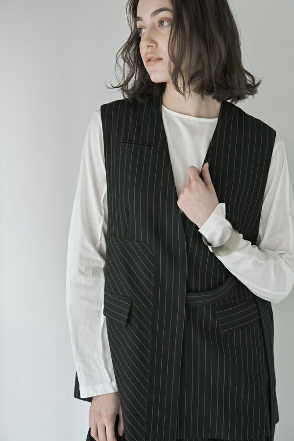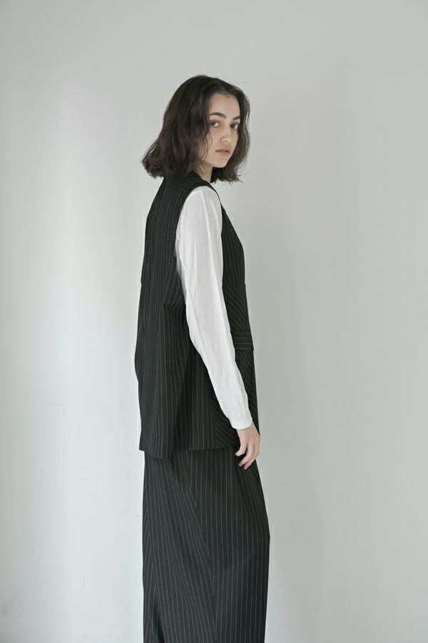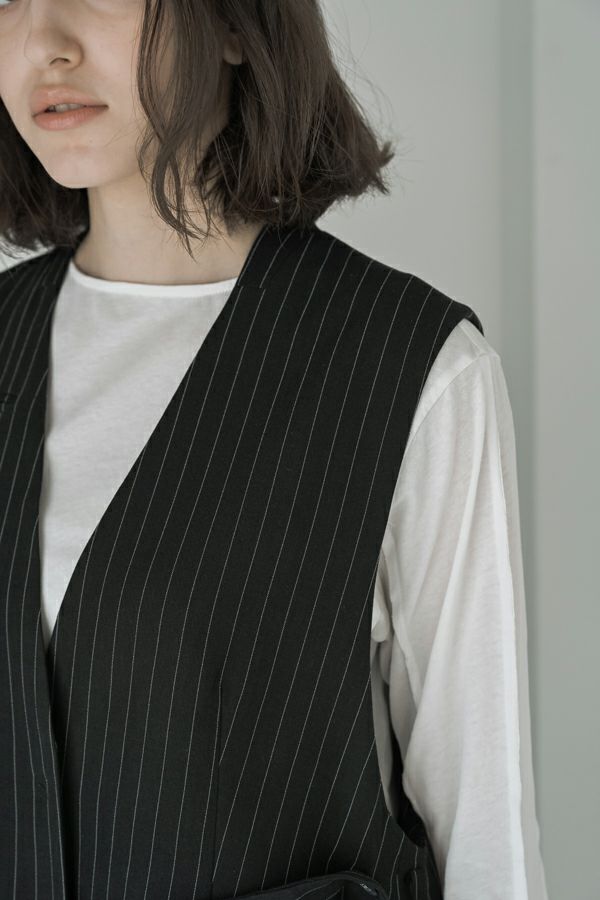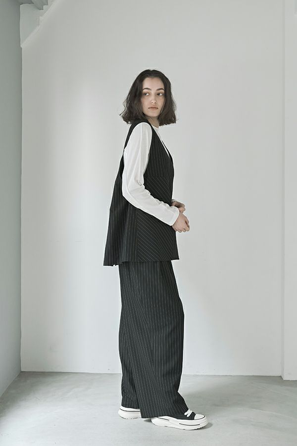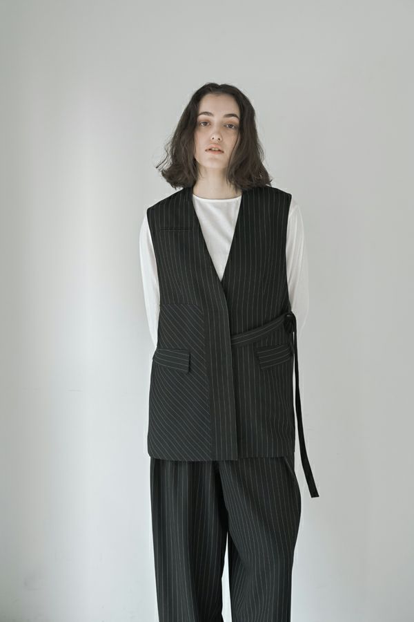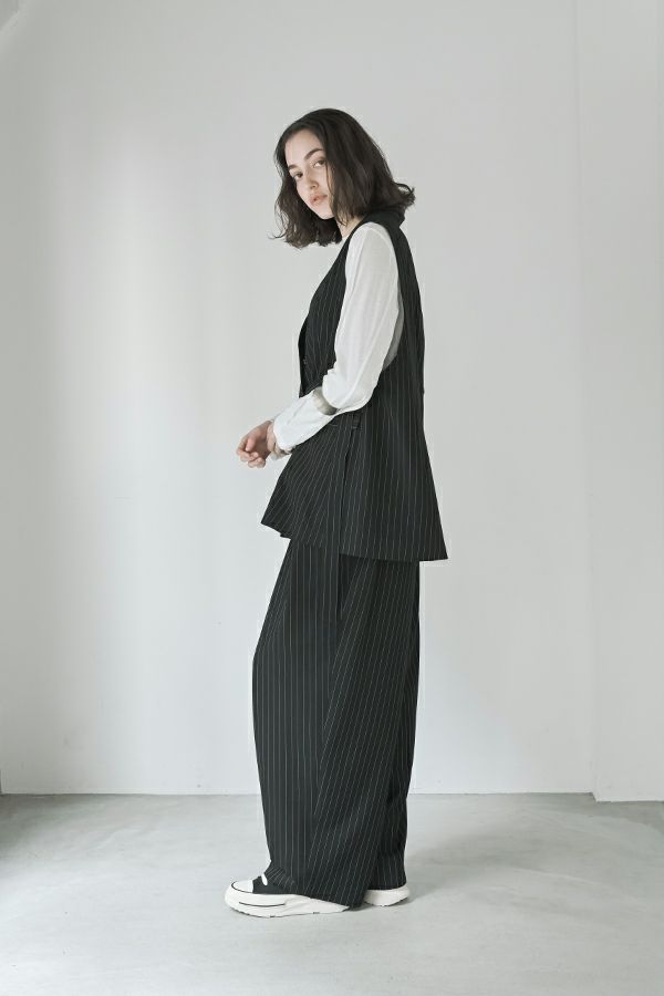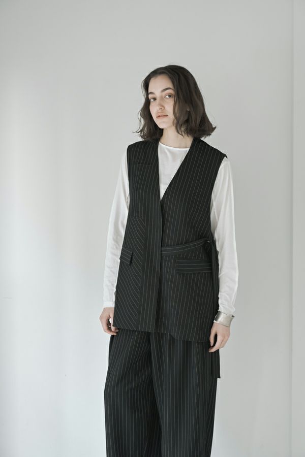 羽織るだけで決まる、マニッシュとエレガンスが絶妙なジレ。 落ち感のあるポリエステル×レーヨン素材が、マニッシュなストライプに柔らかさと上品さを添えた、ハードすぎない絶妙なバランス。 共地ベルトをベルトループに引っ掛けて後ろで軽く結んだり、ベルトループに垂らしてアクセントにしたりと、コーディネートに遊び心をプラスできます。 インナーはカットソーでもシャツでも合わせやすく、セットアップで同素材のパンツと合わせれば、よりモードな印象に。羽織るだけでサマになり、インナーを選ばない万能さが嬉しい、まさに“大人のマジックベスト”。 マニッシュなラインとエレガントな佇まいが共存する、スタイルを格上げする一着です。 ●ストライプフォールドパンツ(25228-9433D-W)とセットアップ可
