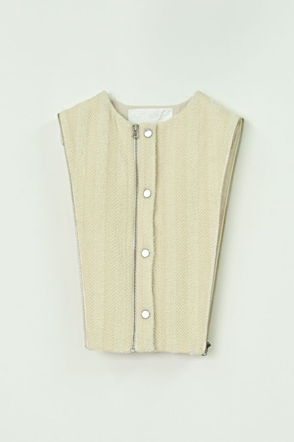 新バランスで魅せる、構築ツイードベスト。 クラシックなツイードに、メタルファスナーの無機質なシャープさを掛け合わせたアイテム。素材のコントラストが洗練された緊張感を生み出し、シンプルなスタイリングにひとさじの強さを与えます。 肩や身頃の立体的なフォルムが構築的なシルエットを生み、今季らしいモード感を演出し、着るだけでスタイルの輪郭を引き締めてくれる一枚。タートルネックやシャツとのレイヤードで袖にニュアンスを加えれば、さらに奥行きのある印象に。ワイドパンツやAラインスカートを合わせて重心を整え、モダンで都会的なバランスに仕上げるのがおすすめ。定番に甘んじない、スタイルに“エッジ”を効かせるベストです。●ウールツィード切替ハーフパンツ(25233-9732E)とセットアップ可