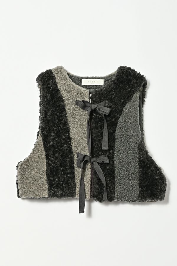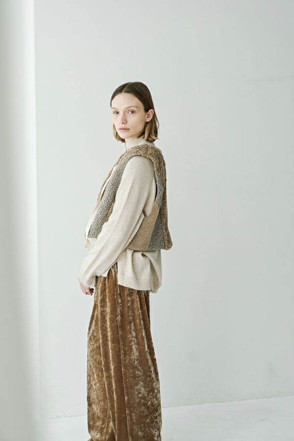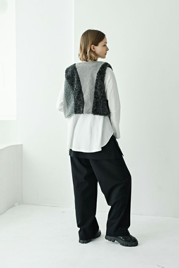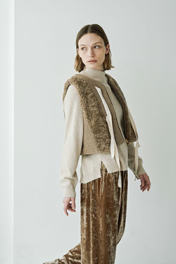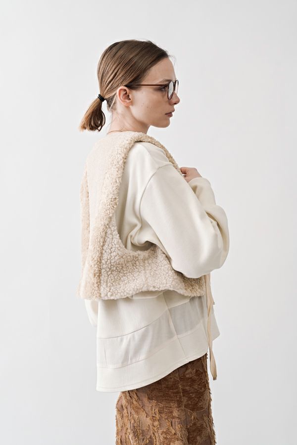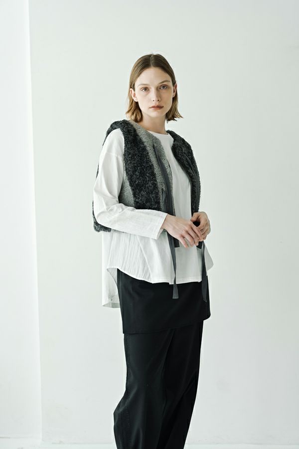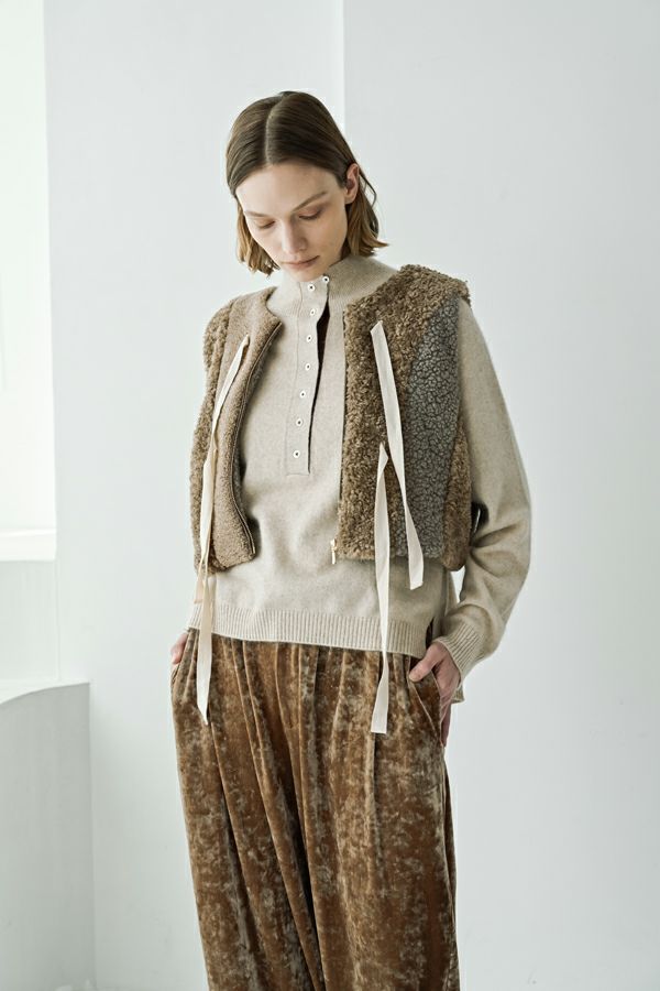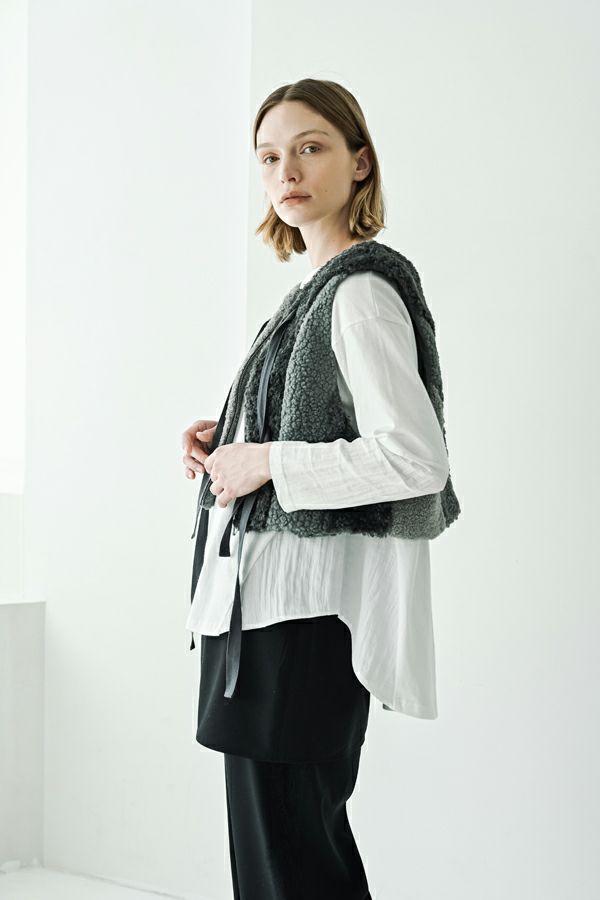 異素材ミックスが映える、洗練ショートボアベスト。 纏うだけで洒落感高まる、秋冬の主役ベスト。異素材のコントラストが引き立つデザインで、いつものコーディネートにさっと羽織るだけで季節感とスタイルに奥行きをプラスします。 ゆったりと大きめのアームホールは、ボリュームスリーブや袖広のインナーとも相性抜群。レイヤードに悩まず、自在な着こなしが叶います。フロントにはラフに結べるリボンテープをあしらい、抜け感のあるアクセントを添えました。 ワンピースに合わせて柔らかさを演出したり、デニムでカジュアルに振ったスタイリングにも好相性。ジャケットやライトアウターとの合わせも今年らしくてオススメです。