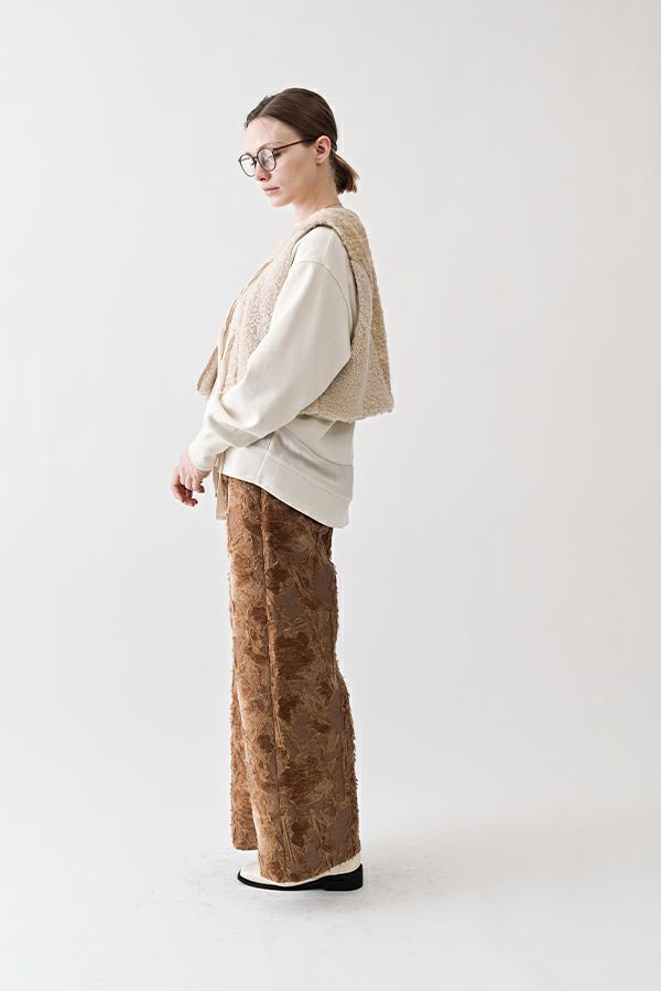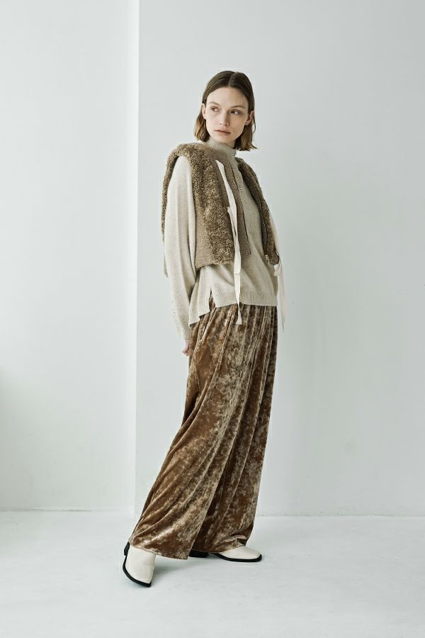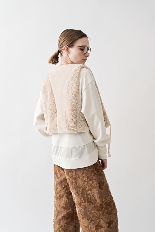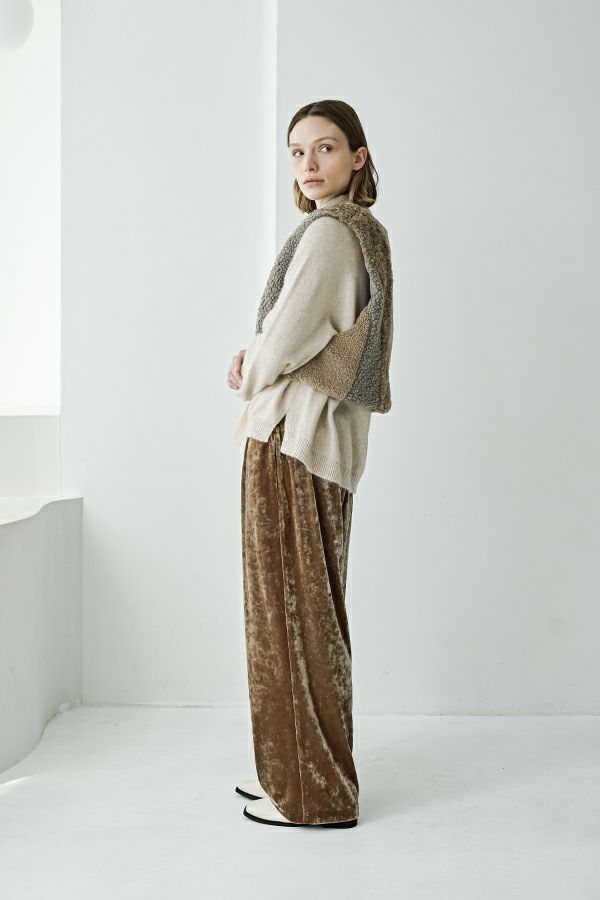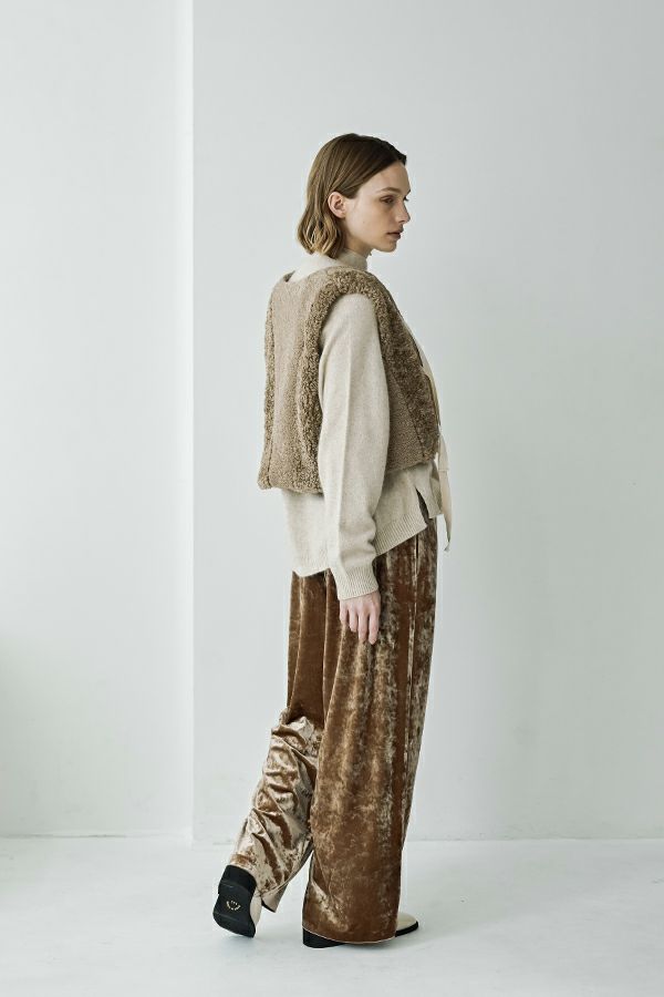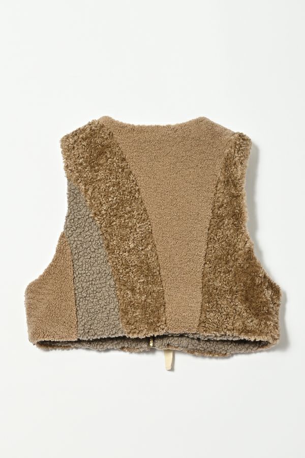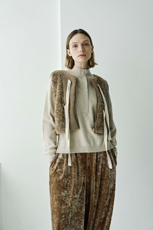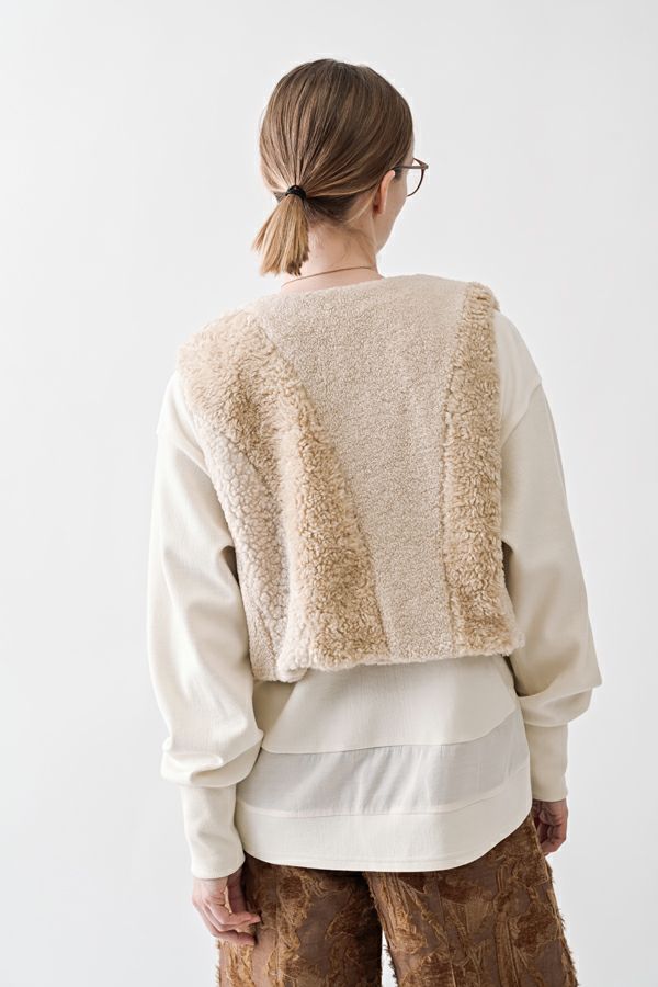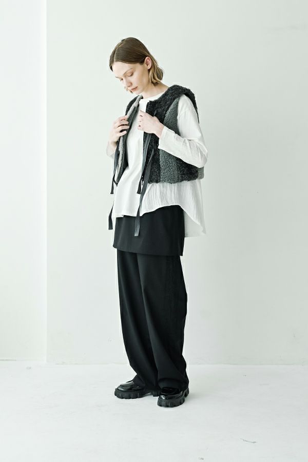 異素材ミックスが映える、洗練ショートボアベスト。 纏うだけで洒落感高まる、秋冬の主役ベスト。異素材のコントラストが引き立つデザインで、いつものコーディネートにさっと羽織るだけで季節感とスタイルに奥行きをプラスします。 ゆったりと大きめのアームホールは、ボリュームスリーブや袖広のインナーとも相性抜群。レイヤードに悩まず、自在な着こなしが叶います。フロントにはラフに結べるリボンテープをあしらい、抜け感のあるアクセントを添えました。 ワンピースに合わせて柔らかさを演出したり、デニムでカジュアルに振ったスタイリングにも好相性。ジャケットやライトアウターとの合わせも今年らしくてオススメです。