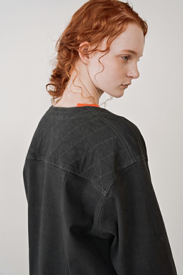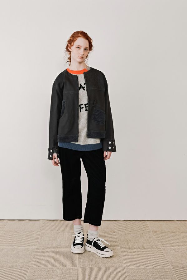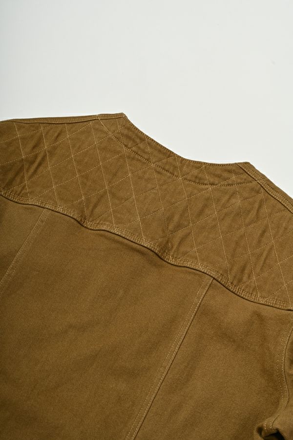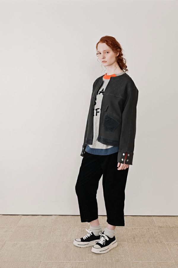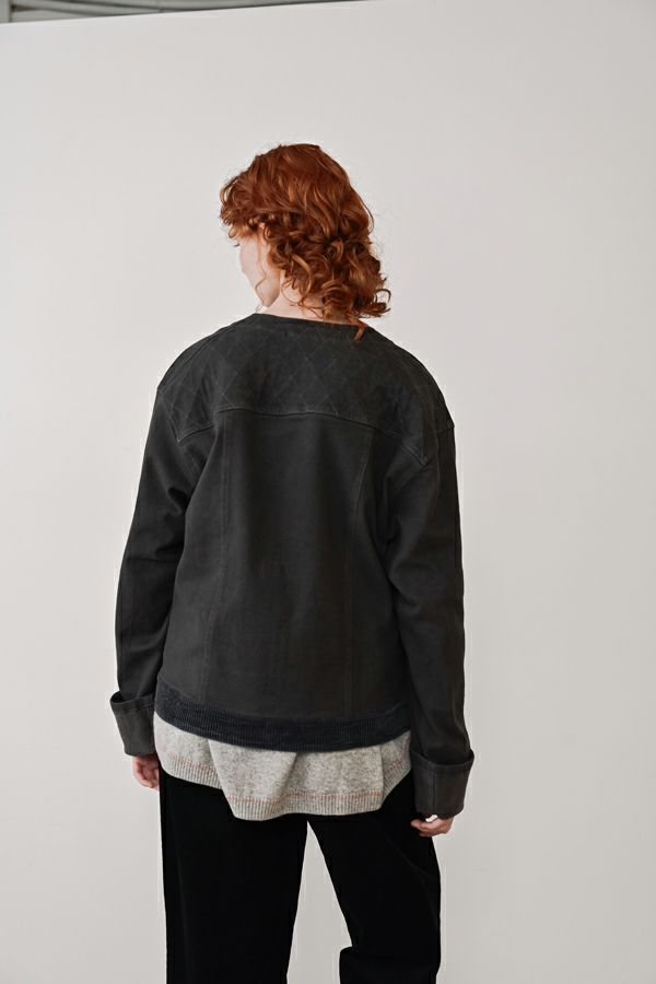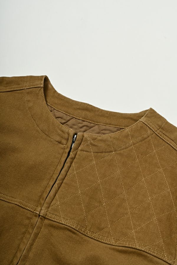 さりげなく、こなれて。女らしさも叶える大人ジャケット。 中肉の裏起毛ストレッチ素材を使用し、製品洗いをかけることで、ほどよい温もりとやわらかな着心地を両立。ツイル地の奥行きある表情に、ヴィンテージライクなこなれ感が宿り、ナチュラルながらも洗練された佇まいに仕上がりました。 すっきりとしたノーカラーと、ほどよくゆとりのあるシルエットは、アウターとしてもコートインでも着回し自在。左肩と後ろヨークに施したキルティング切り替えが、さりげない立体感を添え、バックスタイルまで印象的に。 どんなボトムともバランスよく合わせられるボックスシルエットは、カジュアルにもきれいめにもフィットします。シーズンの端境期にこそ頼れる、ワードローブに加えておきたい万能ジャケットです。 ●裏起毛ストレッチパンツ(25238-9628M-R)とセットアップ可