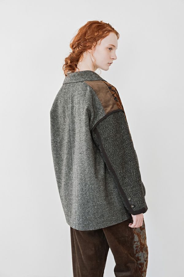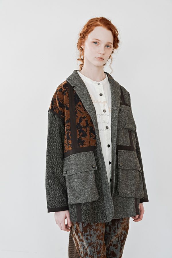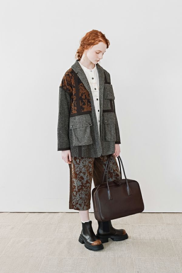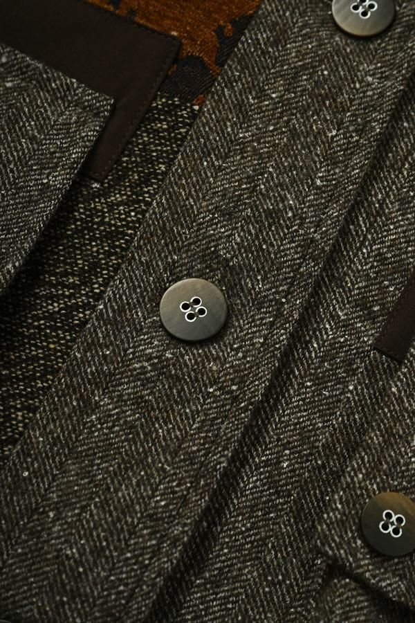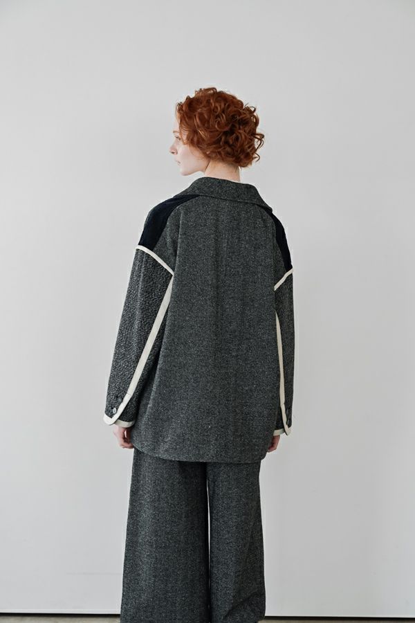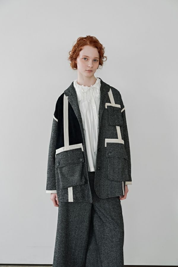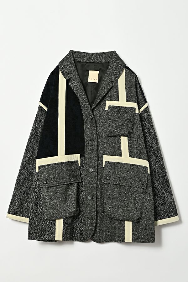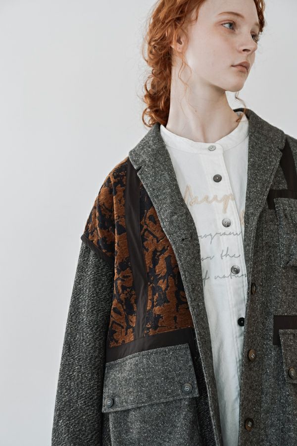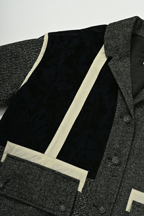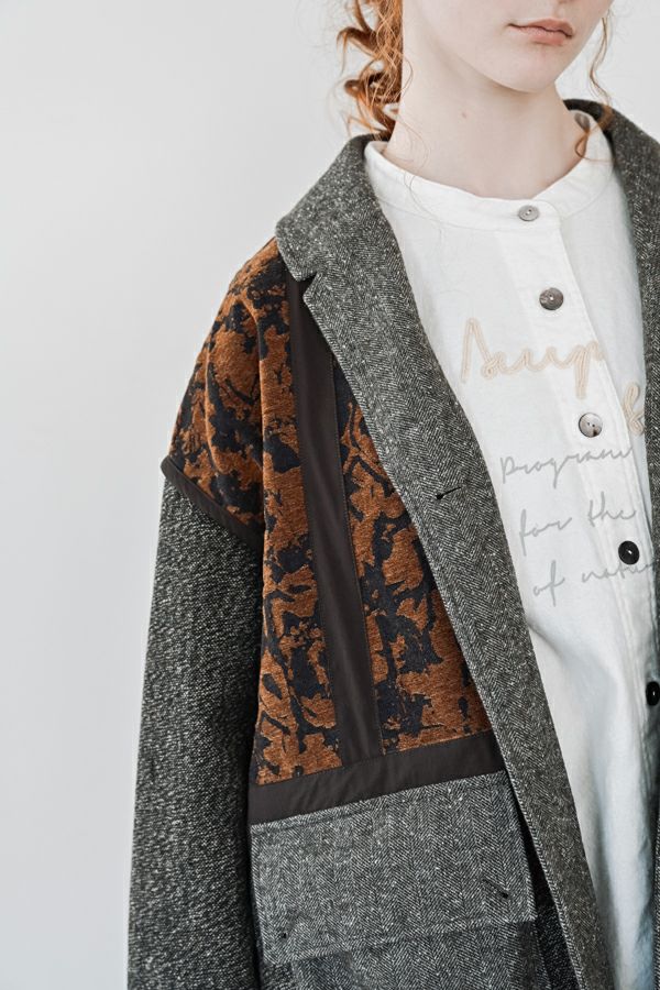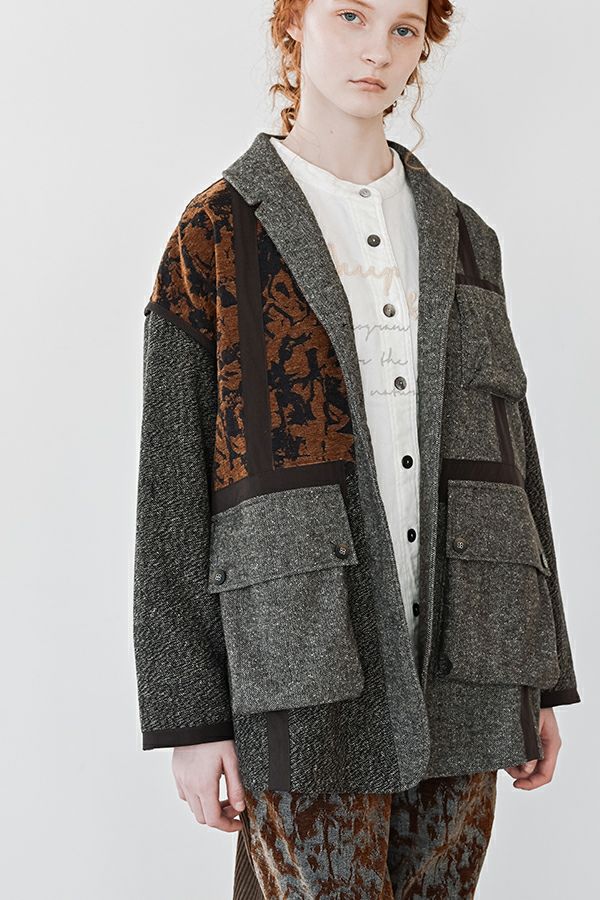 異素材の余韻が光る、感性を纏うデザインジャケット。 5種類の異なる素材を巧みに組み合わせた、唯一無二の存在感を放つ一着。 ミリタリーテイストを感じさせるアウトポケットに、モードなエッセンスを効かせたデザインは、羽織るだけで洗練された大人のスタイルを演出してくれます。 ボクシーなシルエットにゆとりを持たせつつ、配色テープやディテールで引き締め、ほどよく辛口に。袖にあしらった配色ラインテープは視覚的に腕をすっきり見せ、袖口ベンツはボタンを外して折り返しも可能なデザイン。後ろ裾は丸みをとって跳ね上がらない仕様で、動きやすさと美しいラインを両立させました。 感性を刺激する素材使いと、機能性を備えたディテール。大人のワードローブに、新しい表情を加える一着です。 ●異素材の縮率が違うためシルエットの崩れと色落ちを防ぐため、必ずクリーニングに出して下さい。 ●ヘリンボンAラインパンツ(25238-9597B-R)とセットアップ可 ●フロッキーデニム8分丈パンツ(25238-9598B-R)とセットアップ可 ●フロッキーデニムコクーンパンツ(25238-9516B-R)とセットアップ可