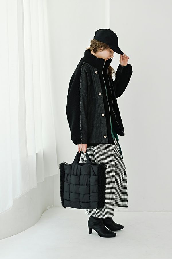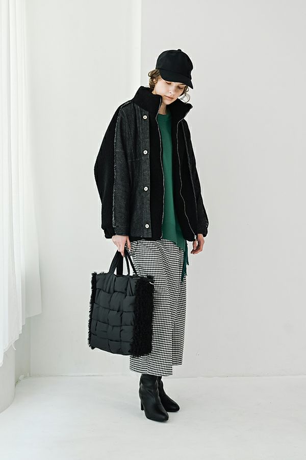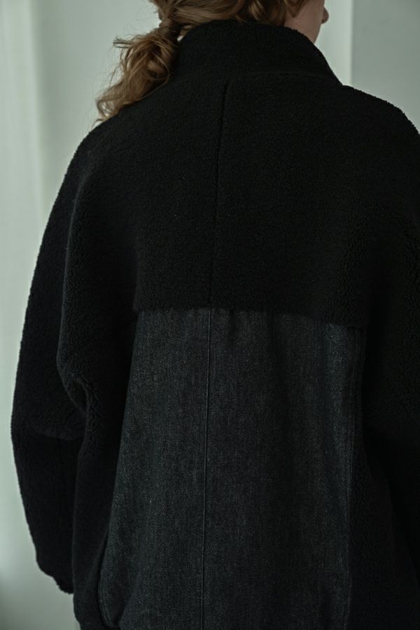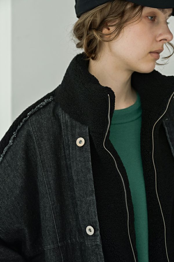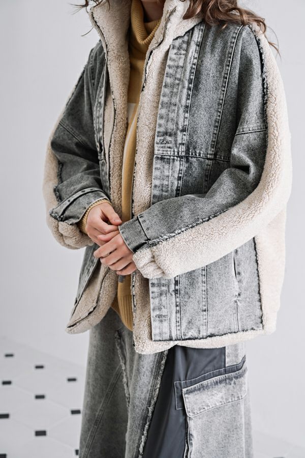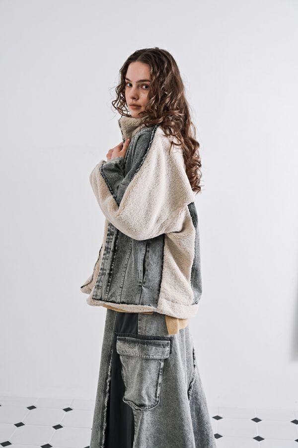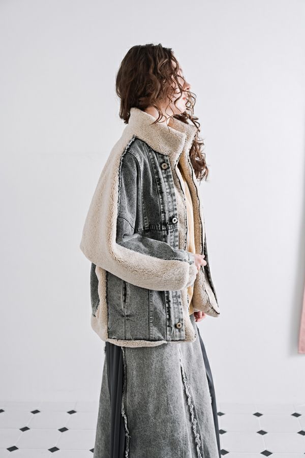 ラフさに宿る、洗練の余裕。異素材で魅せる大人カジュアルなジャケット。 ケミカルデニムとアンティーク調のボアを掛け合わせた、表情豊かな異素材コンビ。後ろ身頃はあえて重くなりすぎないよう、中心にデニムを切り替え、軽やかな動きと奥行きをプラス。ヒップが隠れる長めの丈感で、抜け感と安心感を両立させました。 フロントはファスナーを閉めずに、タック釦だけで留めるスタイルもおすすめ。 ゆったりとしたサイズ感と暖かく包み込むボアの風合いが、大人のアクティブカジュアルを惹き立てます。ほどよいラフさとモード感が交差する、デイリーに頼れる洗練ジャケットです。 ●デニムスカート(25238-8090P-W)とセットアップ可