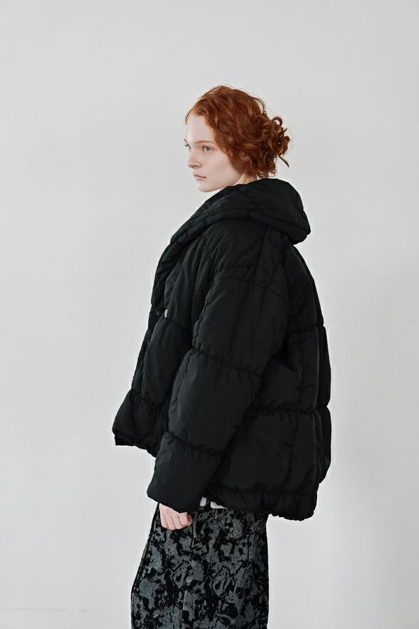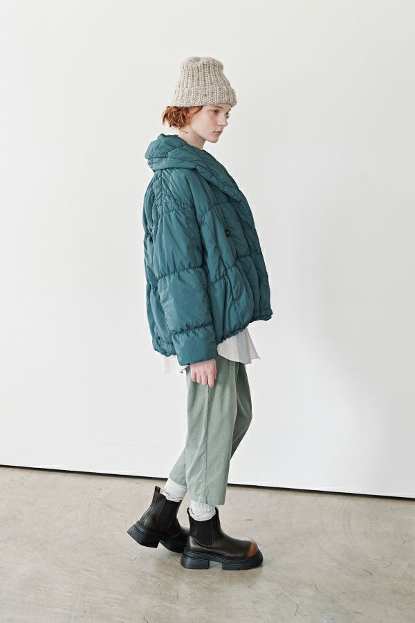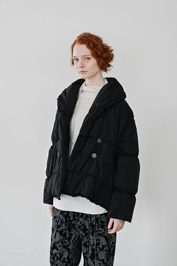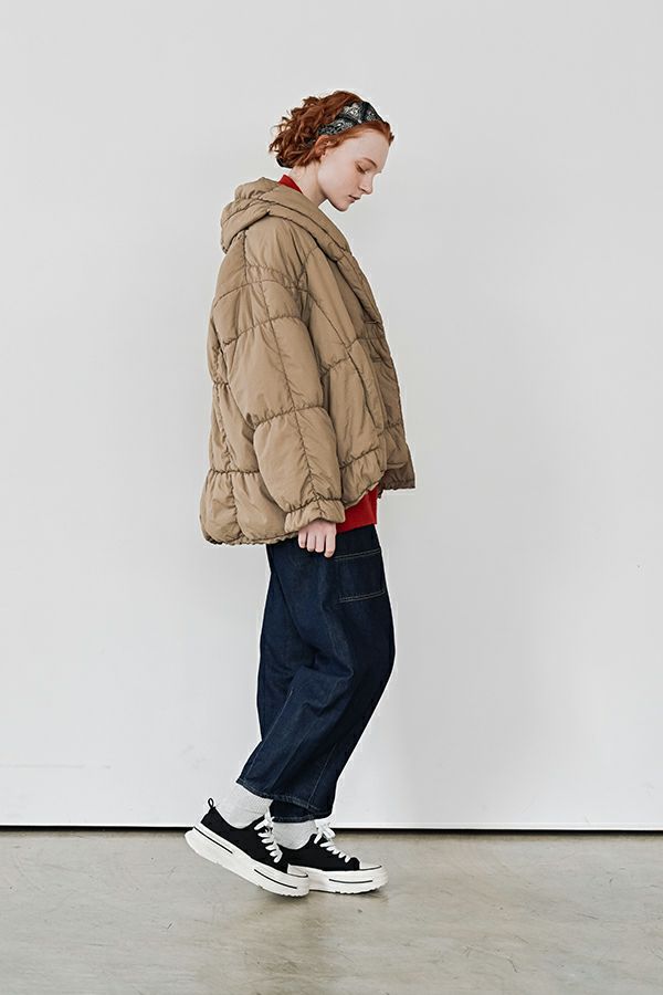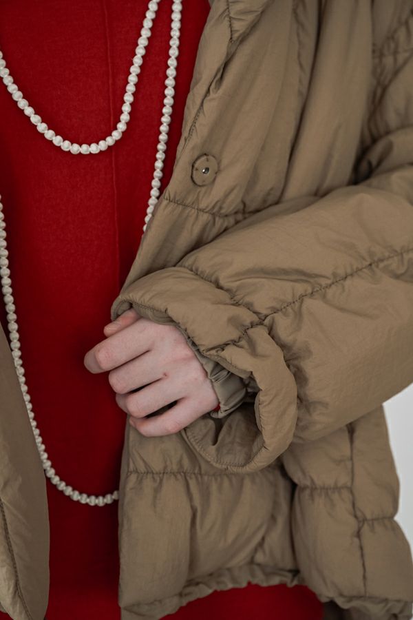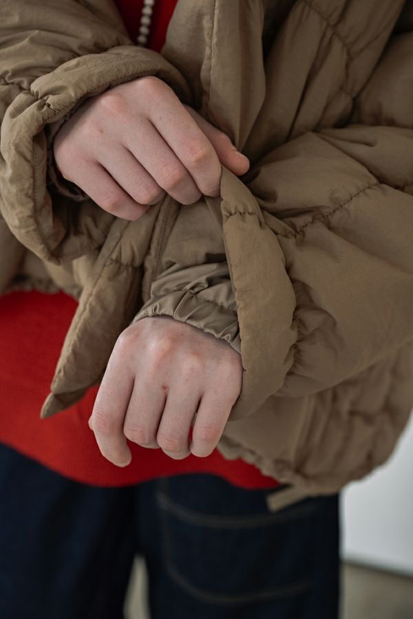 空気を纏うような軽やかさ。品よく暖かい、大人のシャーリングコート。 20デニールのナイロンを使用し、akane史上もっとも軽やかで柔らかな着心地を実現した一着。生地と中綿を一緒にギャザー加工することで生まれた独特の凹凸感が、奥行きのあるニュアンスを演出。ボリュームのあるシルエットながら、驚くほど軽く、しっかりとした防寒性も兼ね備えています。 上品なショールカラーは、首元まで閉じても開けても美しく決まり、スタイリングに合わせて印象を変えられる優秀デザイン。裾のドロスト仕様でシルエットをアレンジすれば、気分に寄り添う着こなしが完成します。 エレガンスと機能性を両立した一着は、この冬、きっと手放せなくなる存在に。 ●家庭洗濯では中綿が偏ってシルエットがきれいにならないので必ずクリーニングに出して下さい。