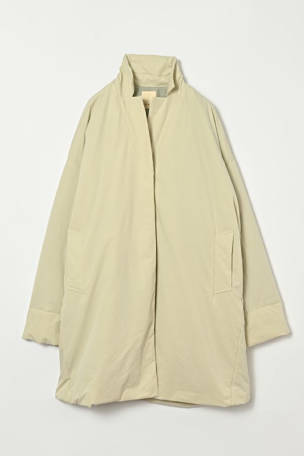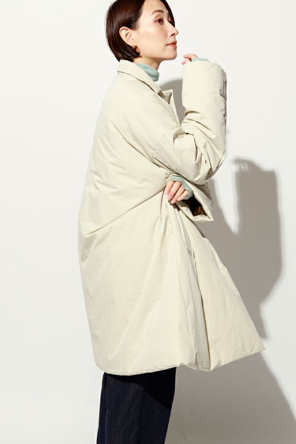 軽やかに纏う、洗練されたシンプル。着まわし力で選ぶ、大人コート。 ドロップした肩まわりには程よいゆとりをもたせ、裾にかけて緩やかに落ちるソフトコクーンシルエットが、ナチュラルな女性らしさを惹き立てます。ペーパーライクな質感と柔らかな光沢を併せ持つ生地は、シワになりにくく、長時間の着用でも着崩れしにくいのが魅力。 小さめの衿とラペルが顔まわりをすっきりと見せ、大きめのクルミボタンがさりげないアクセントに。ゆとりのあるシルエットで中に厚手のニットも楽に重ねられ、季節の変わり目から真冬まで、着まわしの効く万能コートです。 ●配色パッチ中綿コート(25238-7652G-R)の無地タイプ:着丈は8cm短い90cm丈 ●家庭洗濯では中綿が偏ってシルエットがきれいにならないので必ずクリーニングに出して下さい。