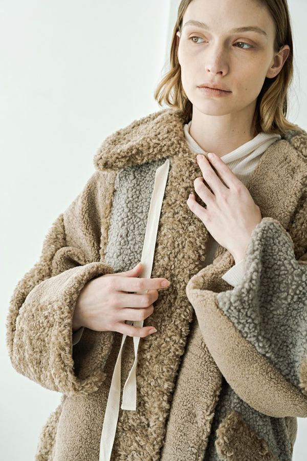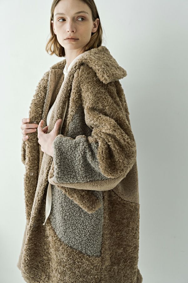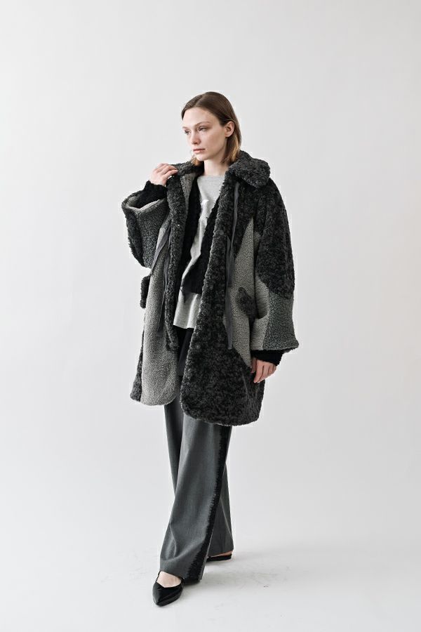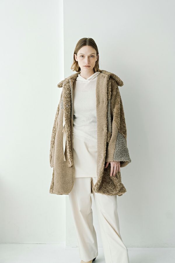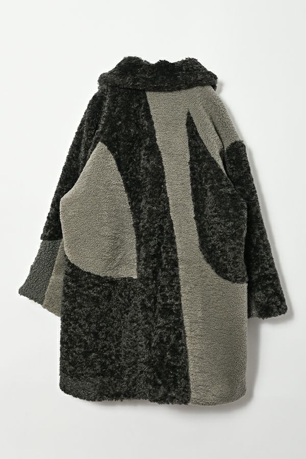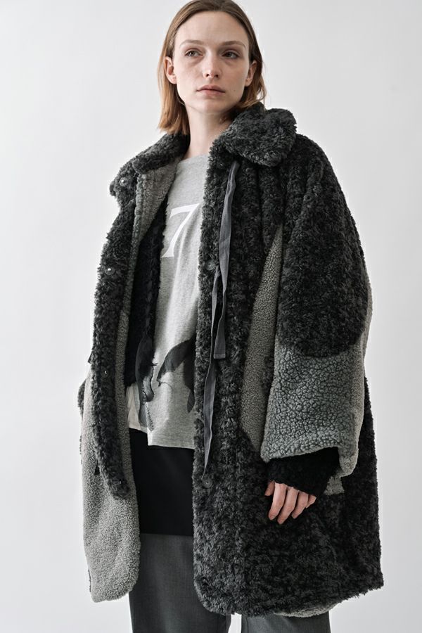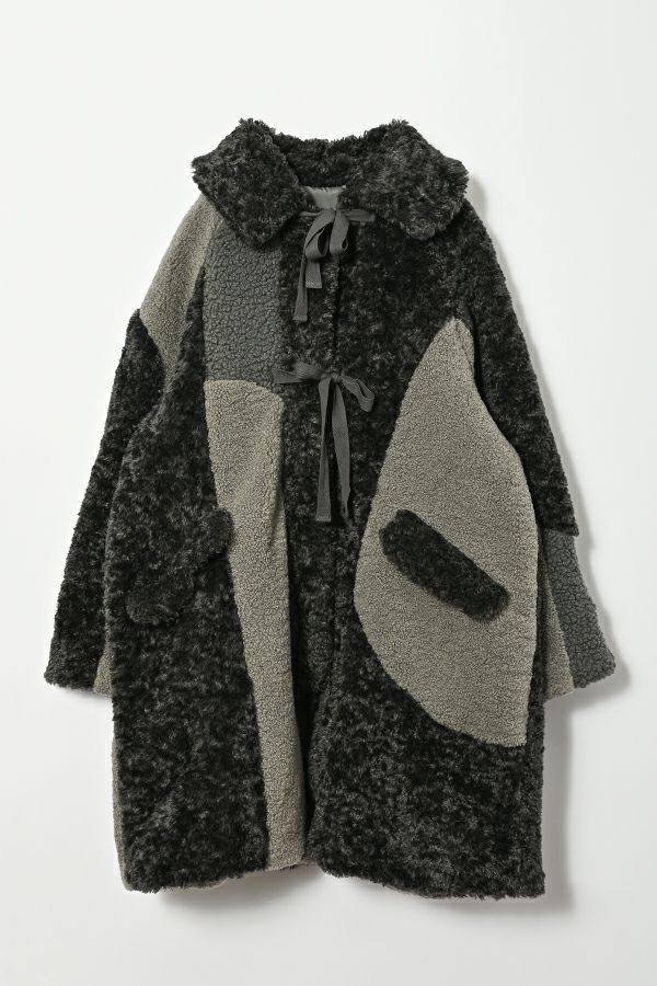 感性を纏う。存在感で魅せるボアパッチワークコート。 3種の異なるフェイクボアをアシンメトリーに切り替え、感度の高いパッチワークデザインに仕上げた一着。全体をゆったりと包み込むオーバーシルエットに、大きめのステンカラーが顔まわりをふんわりと包み、リラックス感とモードな存在感を両立。 フロントはスナップボタンと太幅のリボンテープを添えて、ラフに留めるだけでニュアンスのある佇まいに。羽織るだけでスタイリングが決まる、主役級アウターです。 デニムやカーゴパンツなどカジュアルなボトムとも相性良いです。スウェット×デニムにさっと羽織れば、こなれた大人のカジュアルに。シャツ×スラックスに合わせれば、洗練されたエフォートレスなスタイルが完成