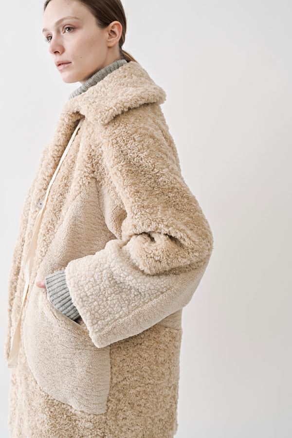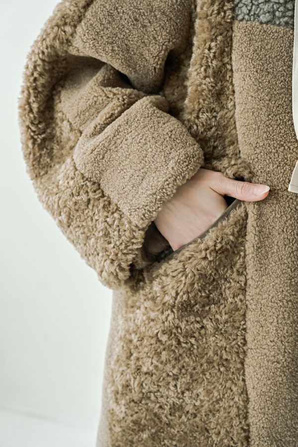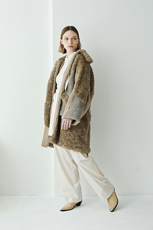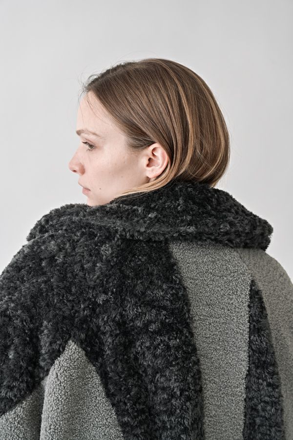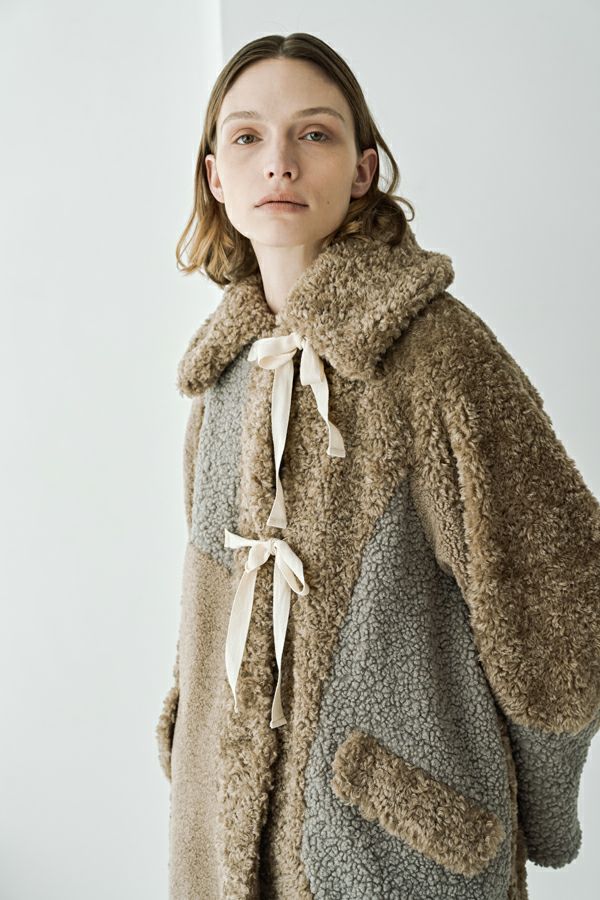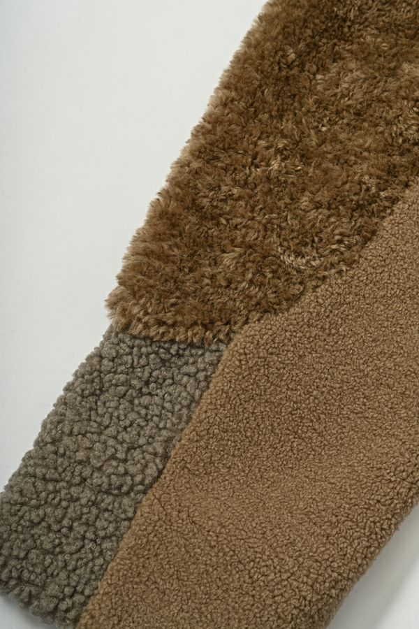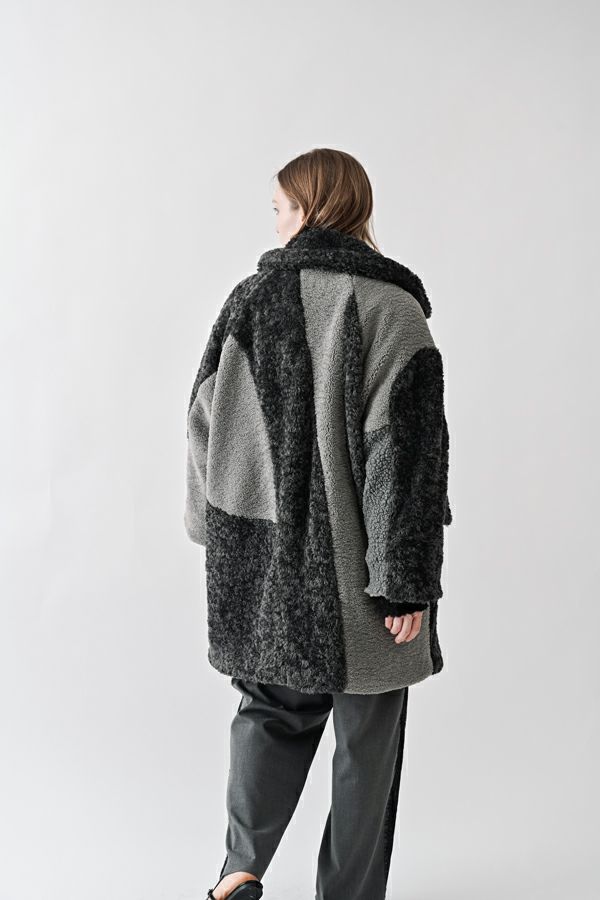 感性を纏う。存在感で魅せるボアパッチワークコート。 3種の異なるフェイクボアをアシンメトリーに切り替え、感度の高いパッチワークデザインに仕上げた一着。全体をゆったりと包み込むオーバーシルエットに、大きめのステンカラーが顔まわりをふんわりと包み、リラックス感とモードな存在感を両立。 フロントはスナップボタンと太幅のリボンテープを添えて、ラフに留めるだけでニュアンスのある佇まいに。羽織るだけでスタイリングが決まる、主役級アウターです。 デニムやカーゴパンツなどカジュアルなボトムとも相性良いです。スウェット×デニムにさっと羽織れば、こなれた大人のカジュアルに。シャツ×スラックスに合わせれば、洗練されたエフォートレスなスタイルが完成