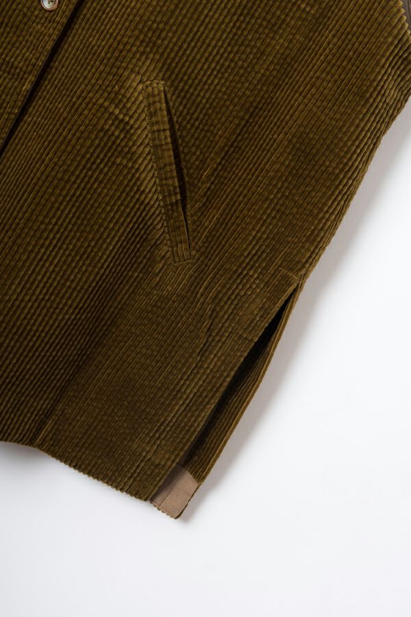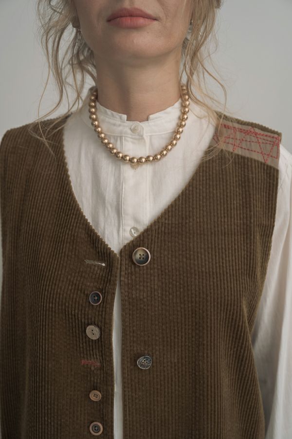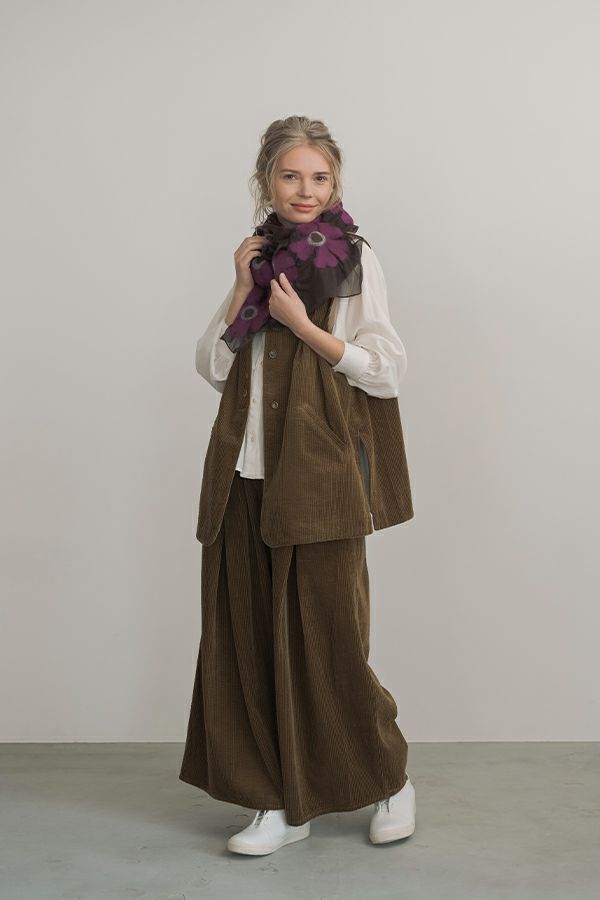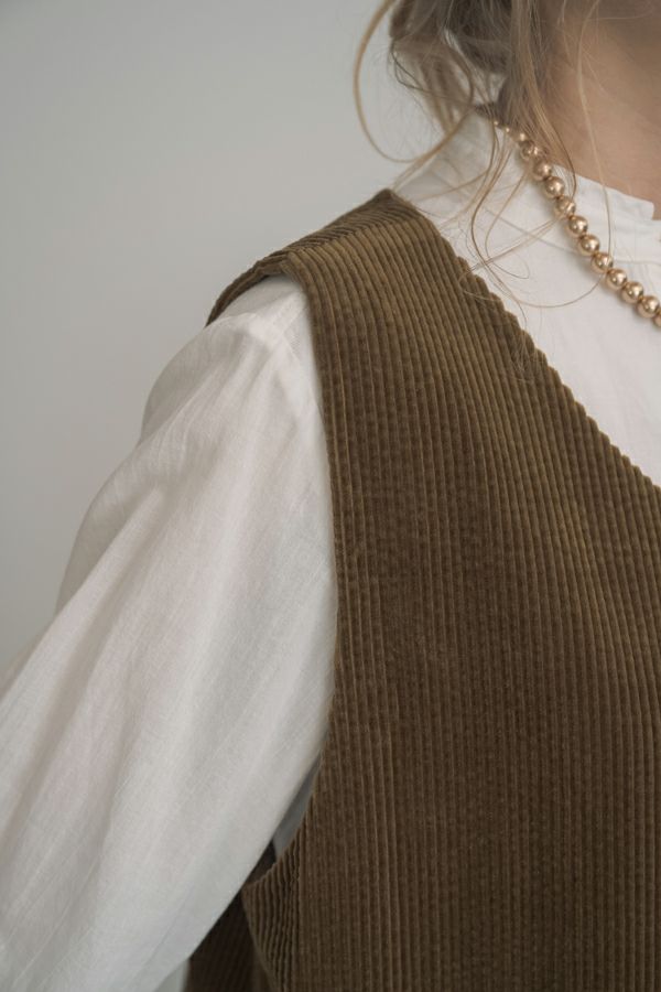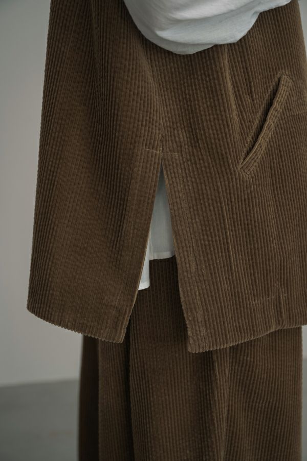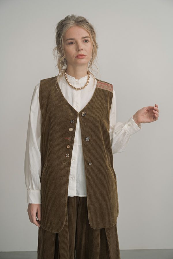 akane売れ筋の太コーデュロイ素材は光沢感とソフトで着心地抜群です。 裏地付きなので暖かく冬までOK、プラスのコーディネートに便利です。ヒップの隠れる丈ですが深いスリットが腰のラインを出さず足さばきも良く深くくった袖ぐりはインナーを選びません。 沢山のお洒落な釦使いや配色の釦ホールと左肩のステッチ刺繍とカラーリンクしています。長めでゆったりシルエットなのでショート丈のインナーと相性が良く、ギャザーブラウスがピッタリ!