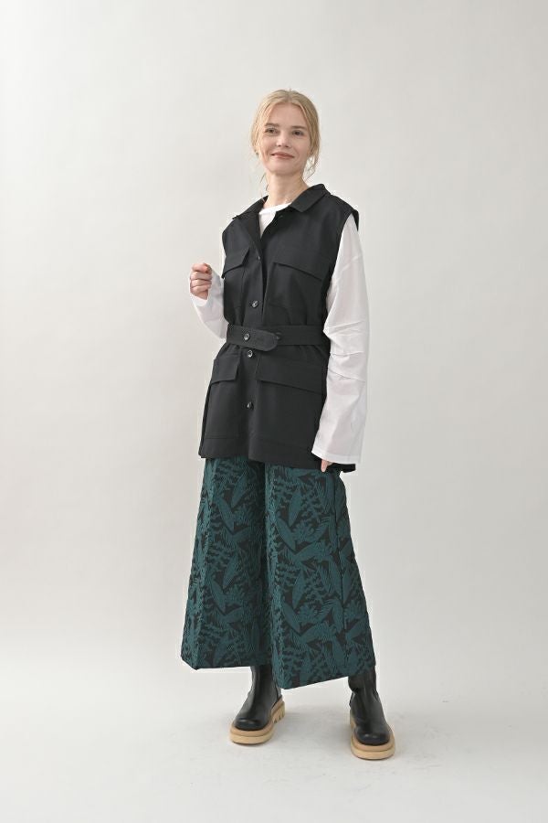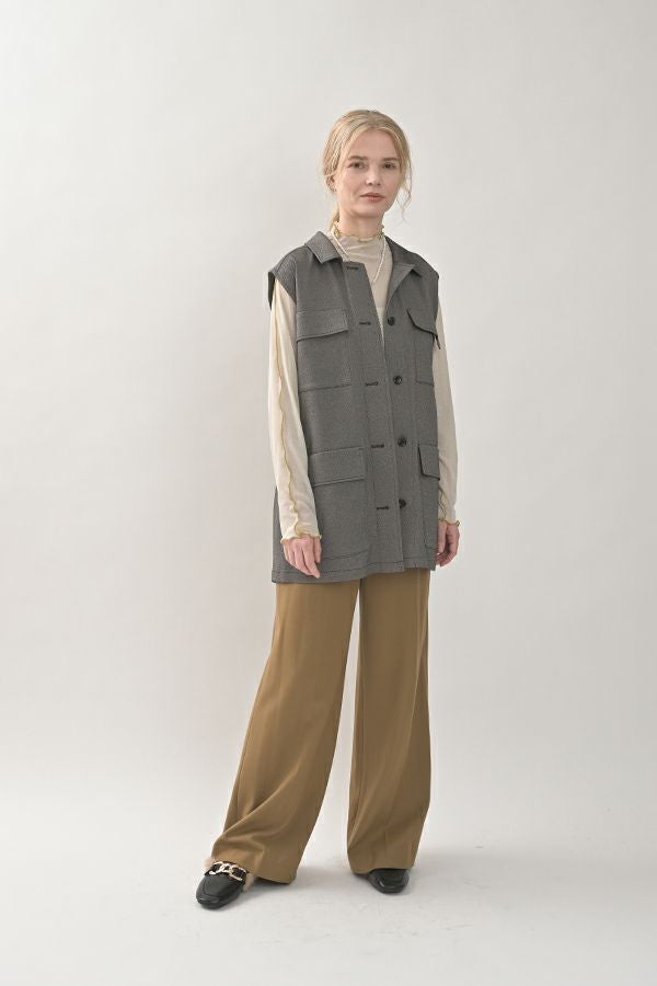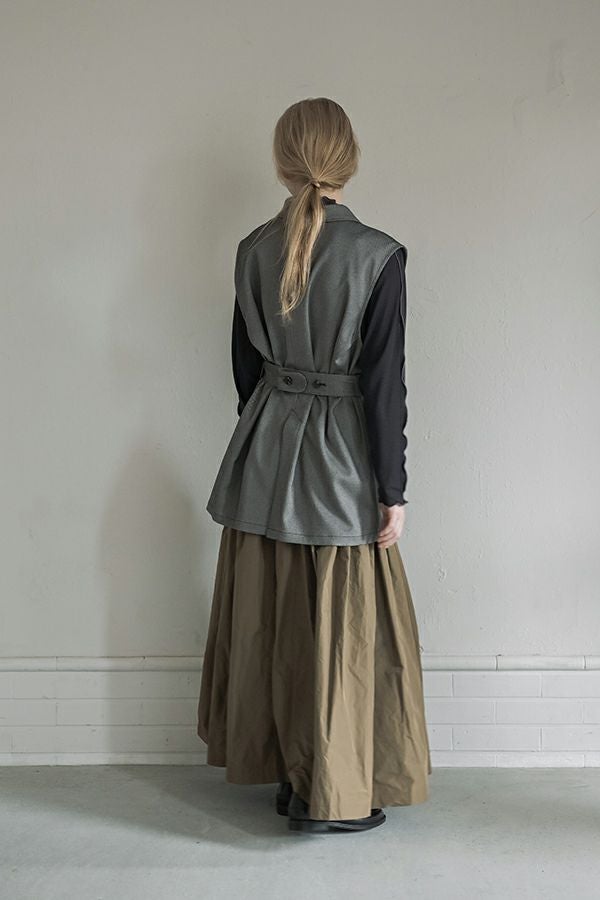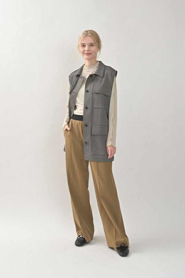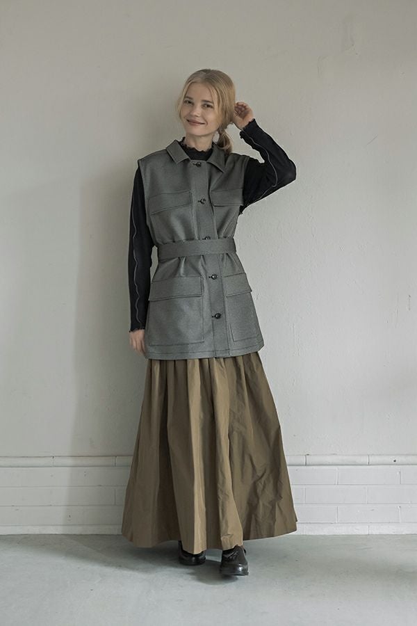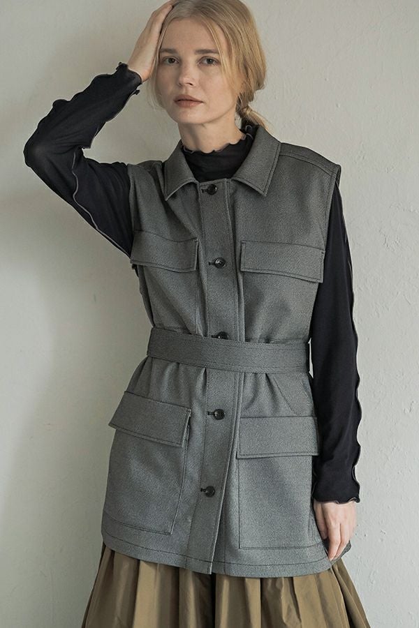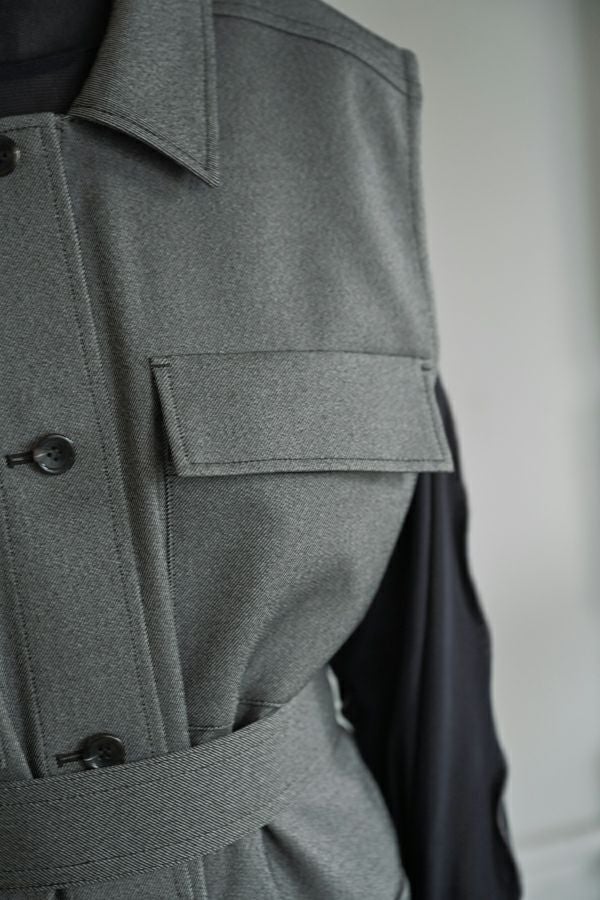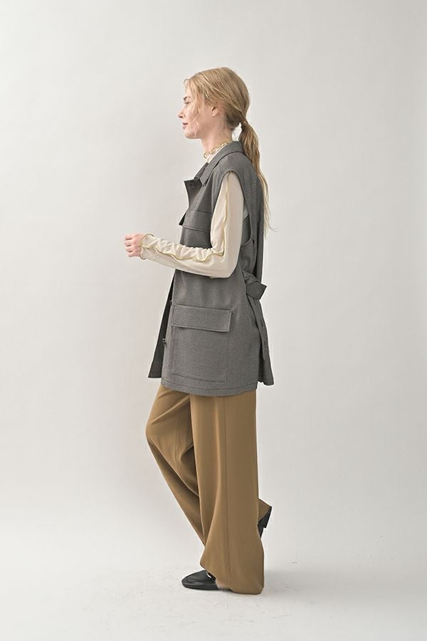 旬のワークテイストなディテールを取り入れたジレベスト。 ポリエステル100%のサラッとした着心地でインナーに合わせる素材を選びません。 トレンドの大きめなボックスポケットに、きれいめなステンカラーのデザインを組合せることで、カジュアル過ぎずクリーンな印象に。 ウエストには取り外し可能なベルト付きで、ベルトを前にも後ろにも留める事が出来き、絞ると よりスタイルアップ見えします。後ろアームにタックを入れて、コクーン型のバックシルエットもデザインポイント。 シャツやブラウスを合わせた上品な着こなしはもちろん、シンプルなTシャツを合わせてカジュアルに着こなすのもおすすめです。甘めのテイスト合わせにも相性が良く、スタイリングに上品さがプラスされます。 ●日本製生地使用