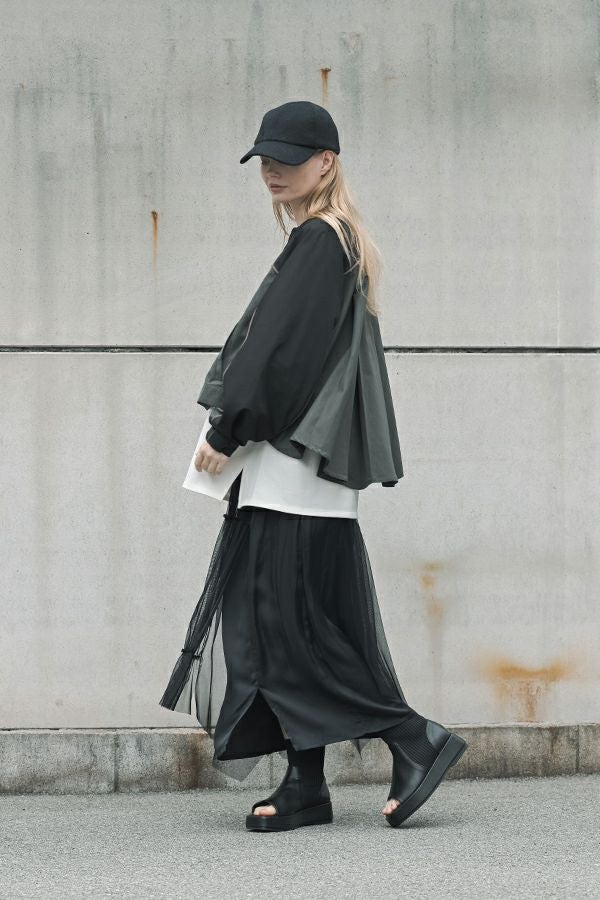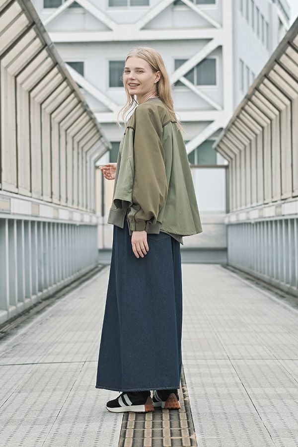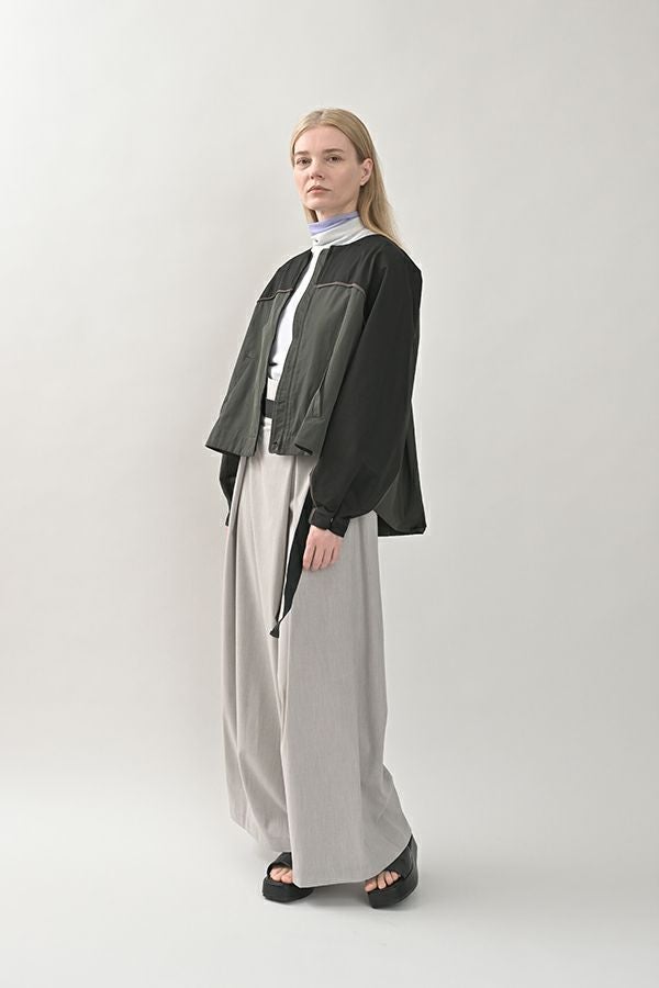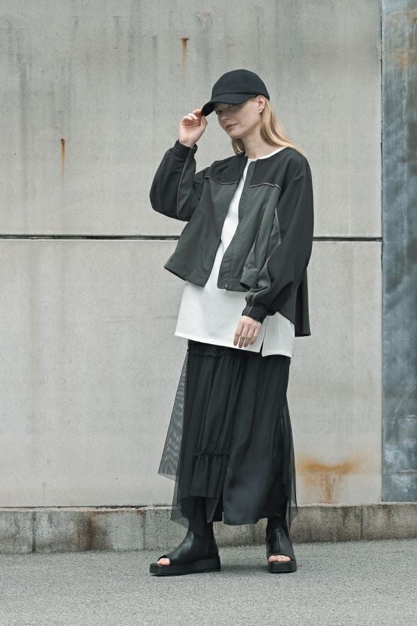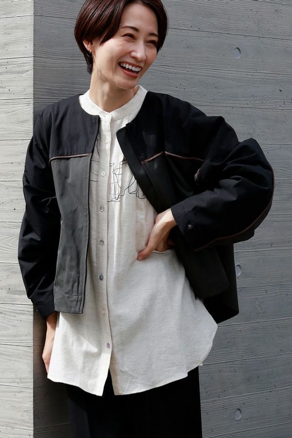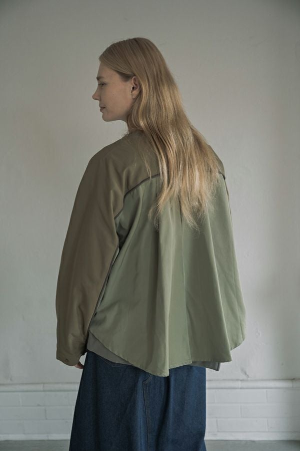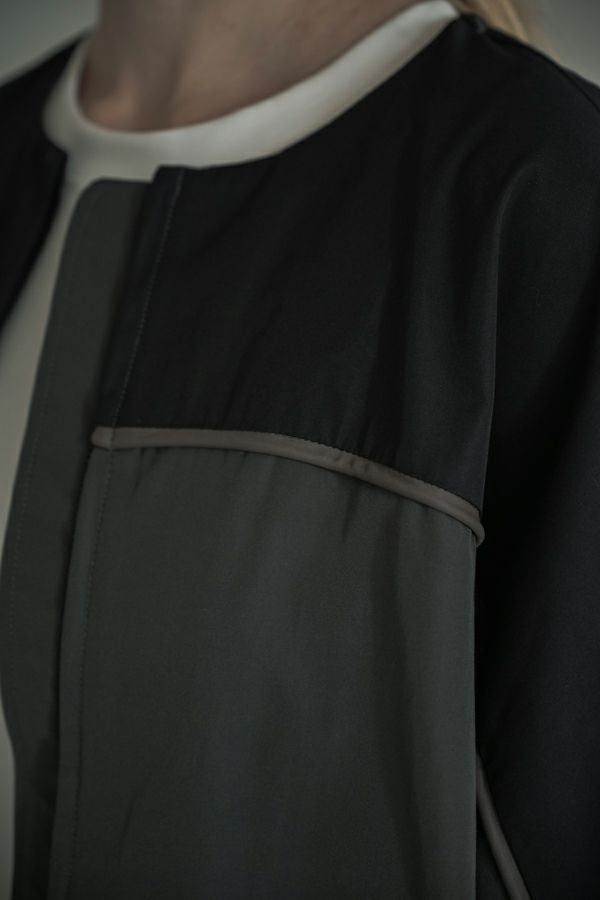 女性らしいシルエットと2トーン配色が効果的なデザインジャケット。 前はショート丈でスッキリ見せ、後ろ下がりのシルエットはボックスタックとタックの組合せでヒップが隠れるデザインに。肩にアームホールの縫い目のないエポーレット袖で、身頃の切替えにコードの入ったパイピングがシャープさと、袖のボリューム感がモードっぽさを表現。袖口も拘りが溢れたデザイン仕様です。 合わせるボトムによってモードにもきれいめにも対応できる優秀アウターです。
