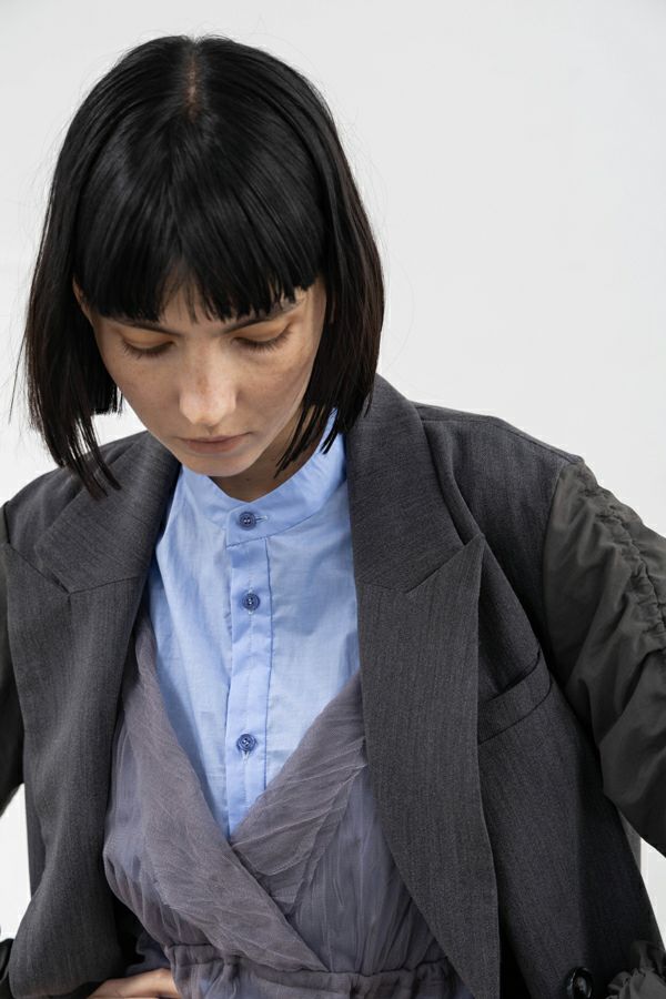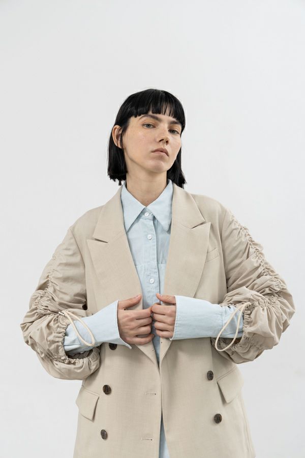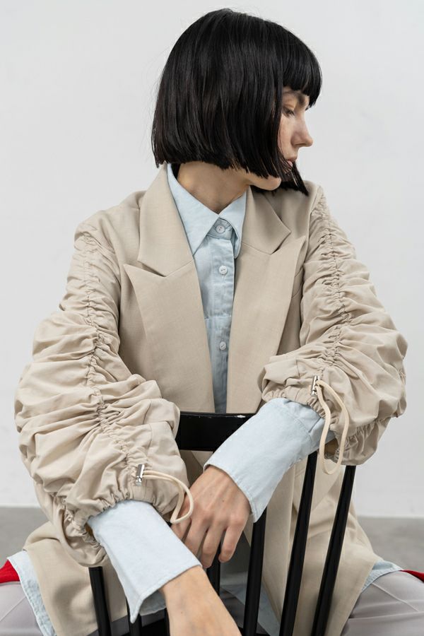 袖のギャザーが目を惹くデザインジャケット。 きれいなテーラードーパターンのボディに合わせた袖にナイロンが入った素材を使用することでギャザーを寄せた時の張りとボリューム感が抜群の仕上がりに。 袖に入ったコードにはストッパーが付いてますので好きな長さに調節して着用頂けるので万人に対応可能!縫い代は丁寧なパイピング始末となっており配色なのもかわいいポイントです。 インパクトだけじゃない!計算されたデザイン性のあるジャケットです。女性らしい印象的な袖のデザインですが、ボリュームのあるマニッシュなボトムとのコーディネートがANGELINAらしさが出ておすすめです!