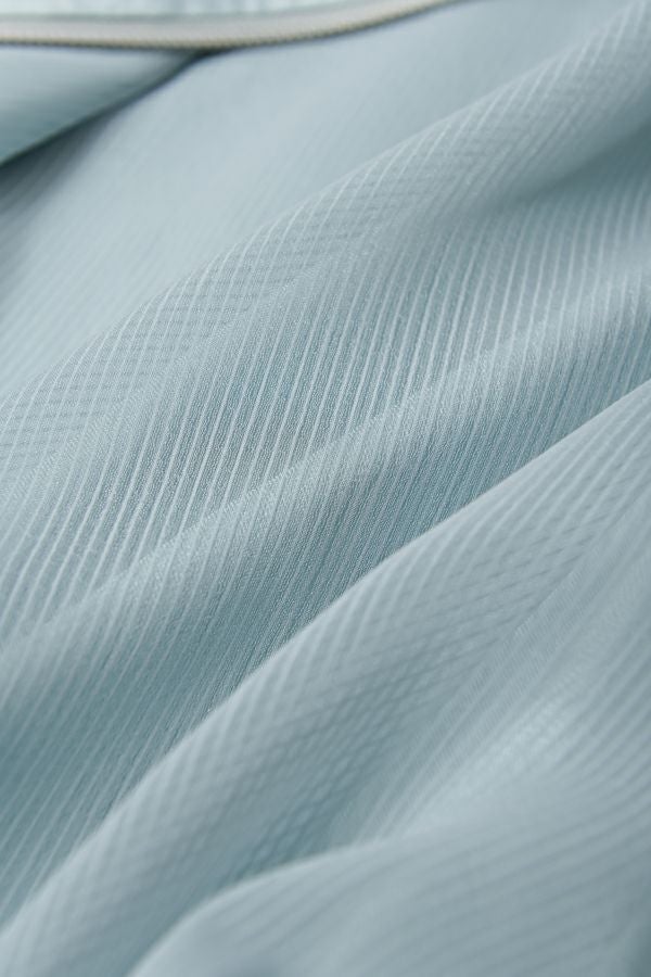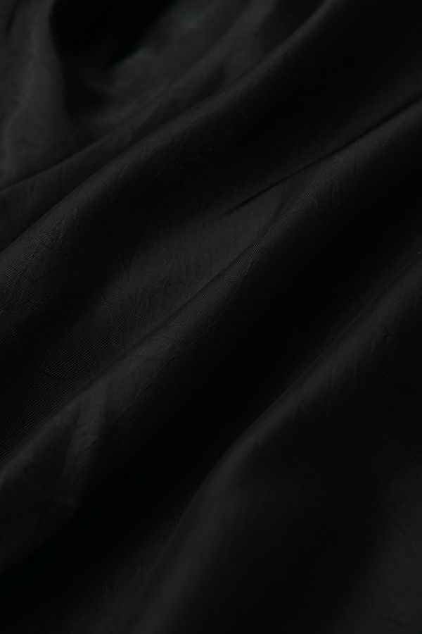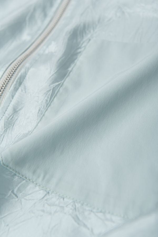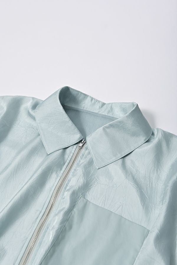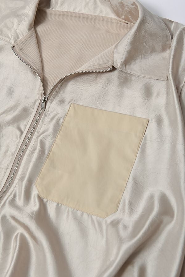 ステンカラージップ前開きショート丈ジャケット。トレンドのショート丈ジャケットで素材は光沢がキレイな柔らかいサテン地で落とし込みました。 ステンカラーで襟元にはキッチリ感を残し、裾にはゴムギャザー仕様で膨らみを持たせたバルーンシルエットが特徴的になっています。身頃のみ裏地付きで、袖カフスと左胸ポケットは異素材使いがポイントです。 薄く軽いので、カーディガン感覚でシンプルなインナーやワンピースに羽織るだけでもスタイルUPになります。また、前ファスナーを閉めてブラウスのようにも着て頂けます。