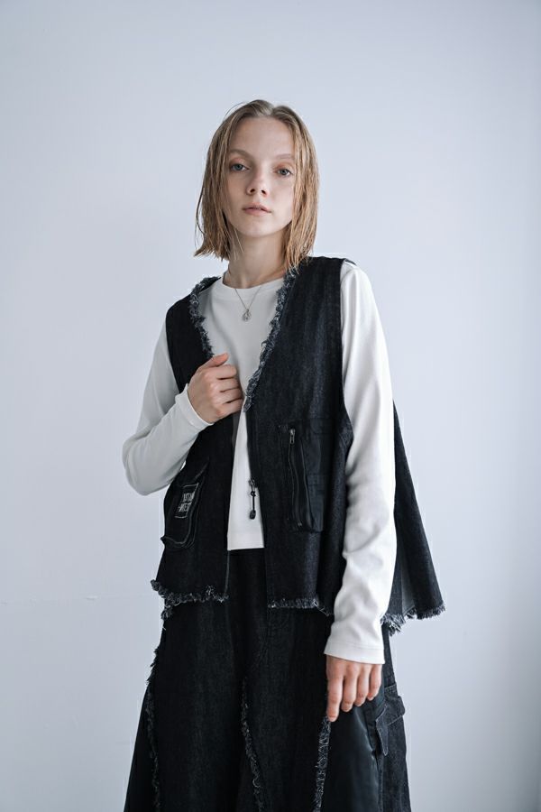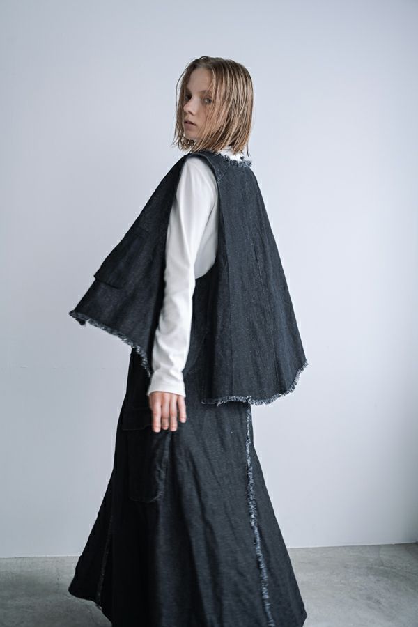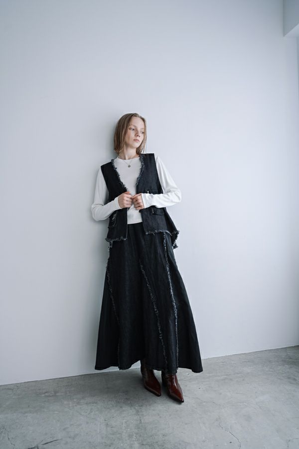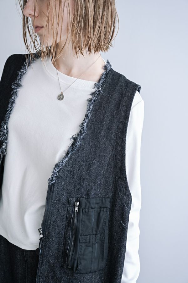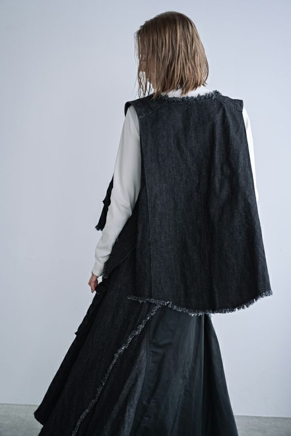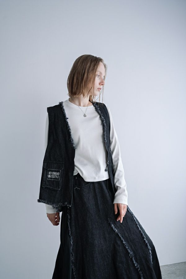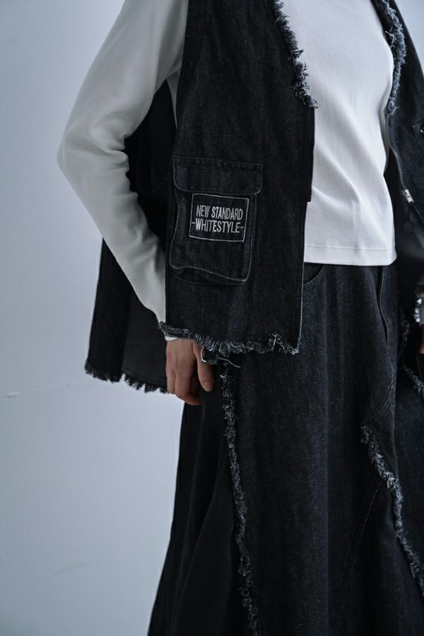 デニムフリンジが遊び心を刺激する、デザインベスト。 後ろ身頃の深いタックが特徴的で、他と差のつくシルエットを作り上げています。 デザイン性のあるポケットも魅力的。右ポケットには、デニムの刺繍入りネームを。左ポケットには、ミリタリー調のシガーポケットをそれぞれデザイン。 グレーカラーは、デニムの製品洗いのひとつで、ケミカル・ブリーチ・アウト(ケミカルウォッシュ)を採用し、究極の色落ちを楽しめます。ブラックデニムは、モード感漂う大人なイメージに。 ●同素材のデニムスカート(25158-8090P-W)とセットアップ可