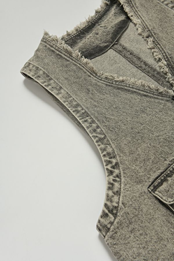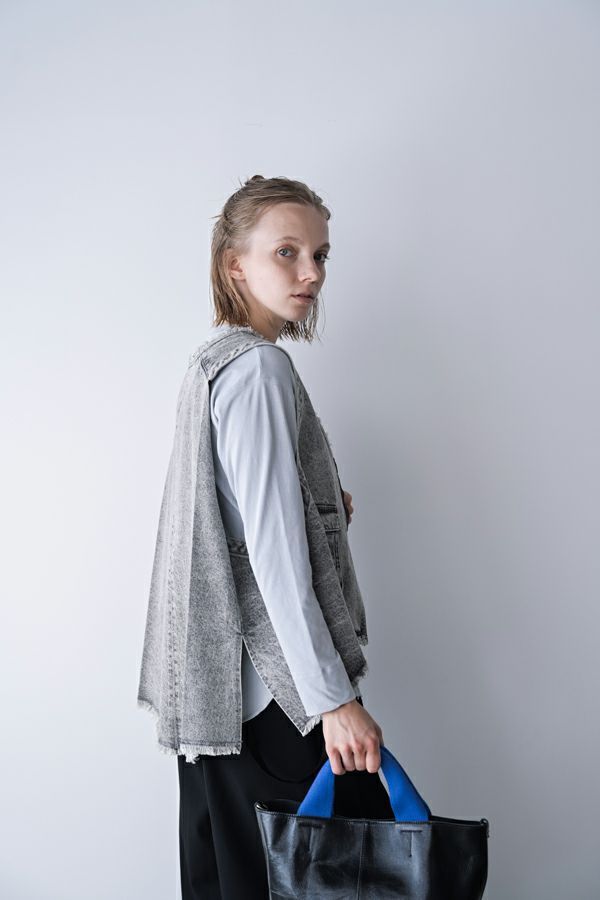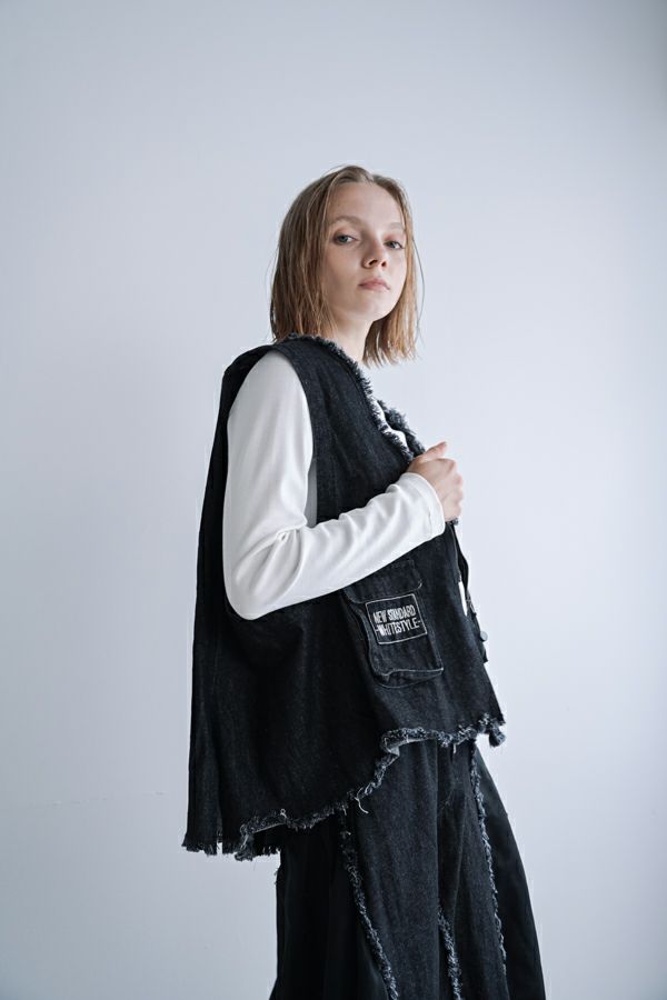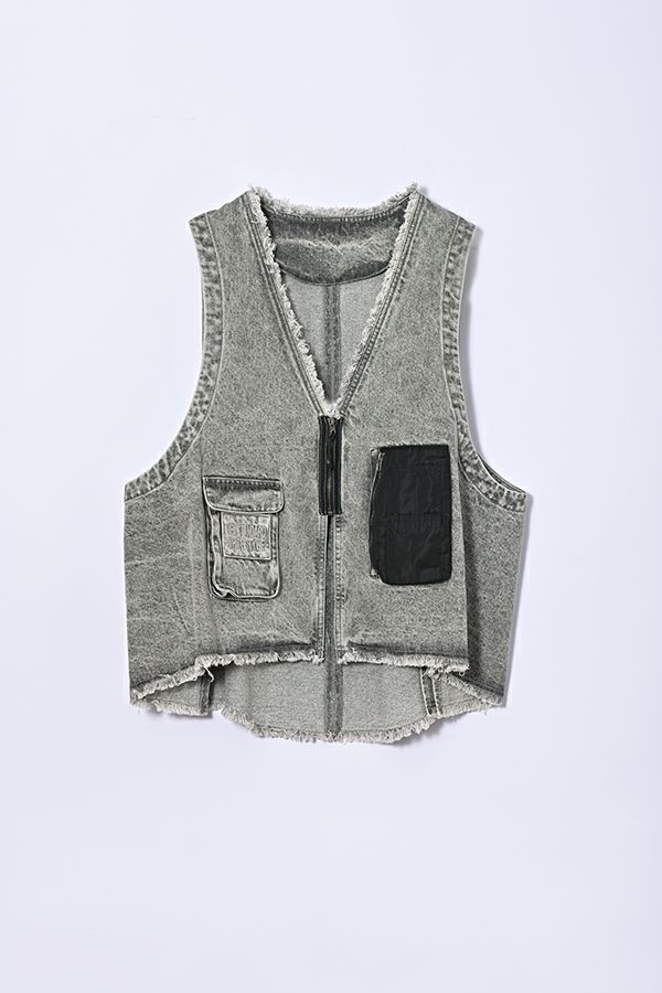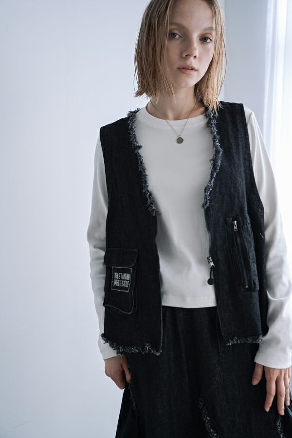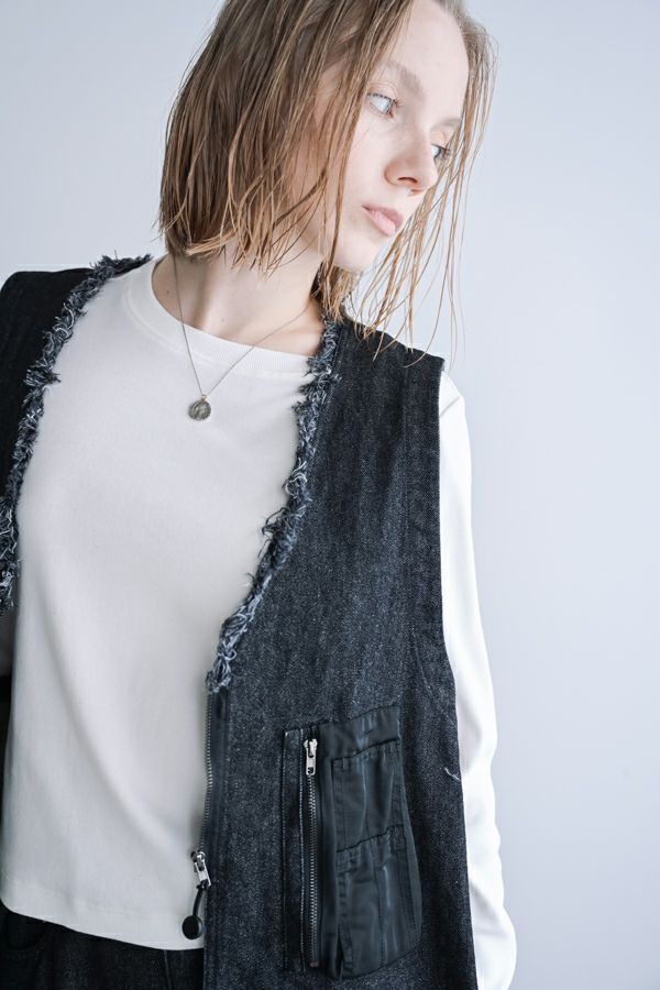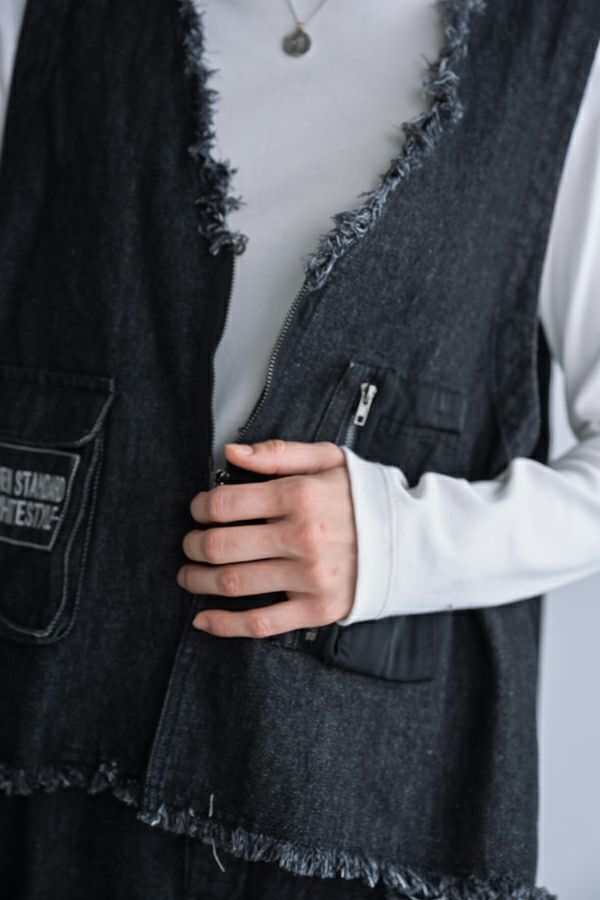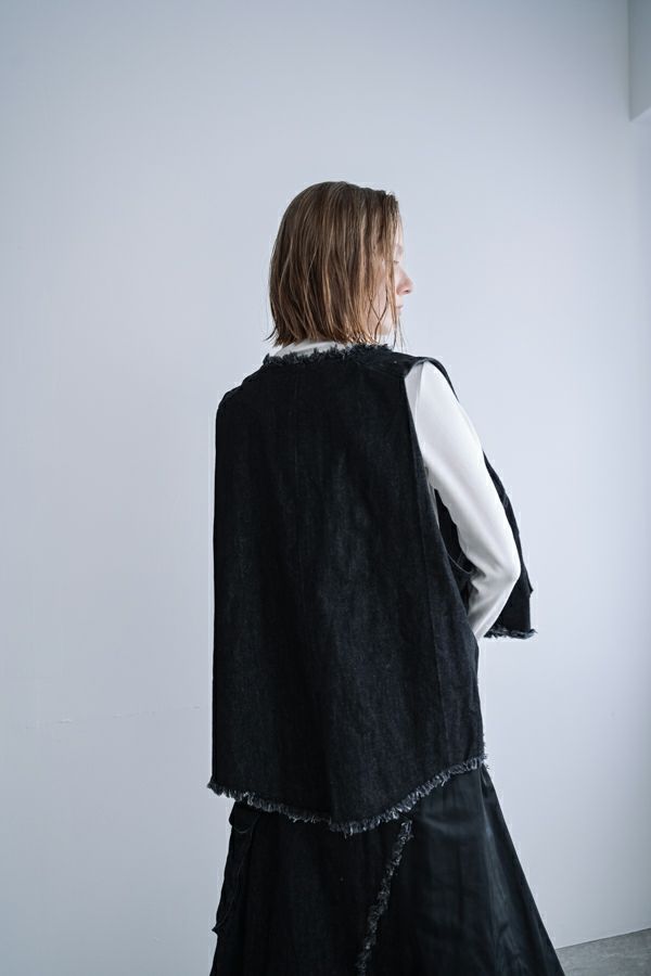 デニムフリンジが遊び心を刺激する、デザインベスト。 後ろ身頃の深いタックが特徴的で、他と差のつくシルエットを作り上げています。 デザイン性のあるポケットも魅力的。右ポケットには、デニムの刺繍入りネームを。左ポケットには、ミリタリー調のシガーポケットをそれぞれデザイン。 グレーカラーは、デニムの製品洗いのひとつで、ケミカル・ブリーチ・アウト(ケミカルウォッシュ)を採用し、究極の色落ちを楽しめます。ブラックデニムは、モード感漂う大人なイメージに。 ●同素材のデニムスカート(25158-8090P-W)とセットアップ可