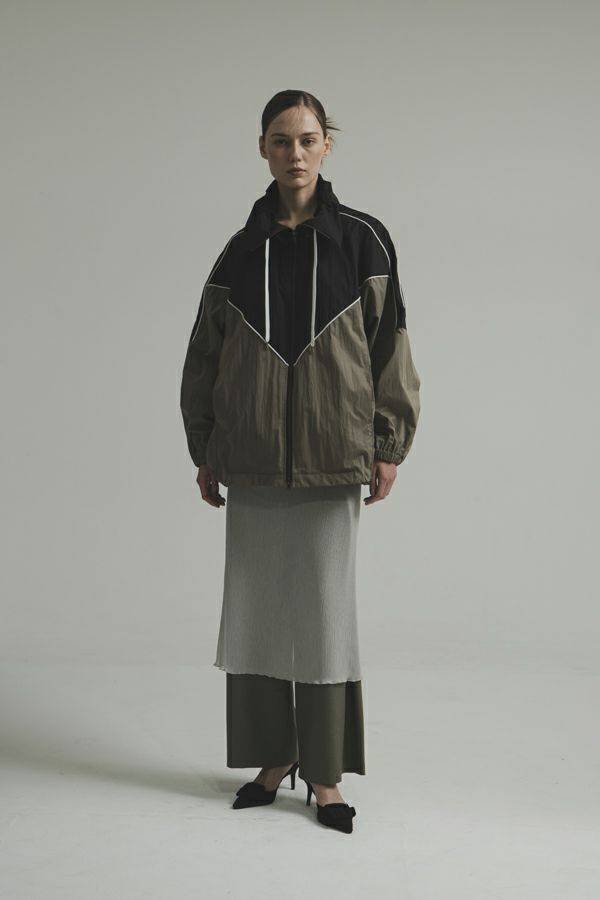 スポーティー&スタイリッシュなデザイン、ナイロンブロッキングブルゾン。 軽くて丈夫なナイロン素材を使用したこのブルゾンは、持ち運びにも便利で、乾きも早いので頻繁にお洗濯しても安心。季節の変わり目に最適なアイテムです。 ブロッキングによるカラーコンビネーションがアクセントとなり、スタイリッシュな印象を与えます。 トレンドを押さえた高さのある衿は、折り返したりコードで絞ったりとアレンジ可能。ダブルジップでさらにオリジナルな着こなしを楽しめます。スポーティーな要素にデザイン性が加わり、洗練されたアーバンカジュアルなスタイリングが完成します。スカート合わせで女性らしい装いを楽しむこともできますし、ワイドパンツやオールインワンなどアクティブなコーディネートの際には、小物やアクセサリーをうまく取り入れることで、より魅力的に仕上がります。