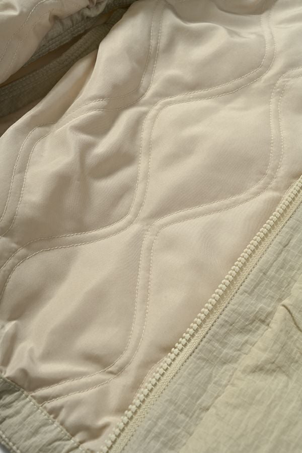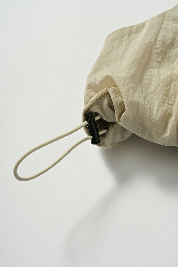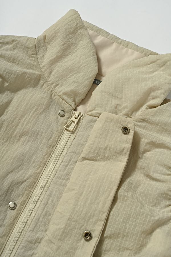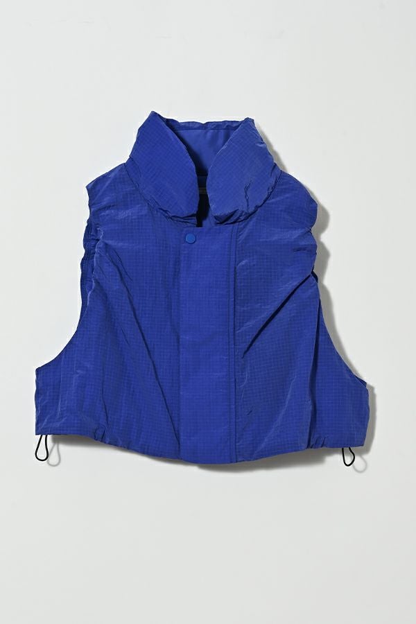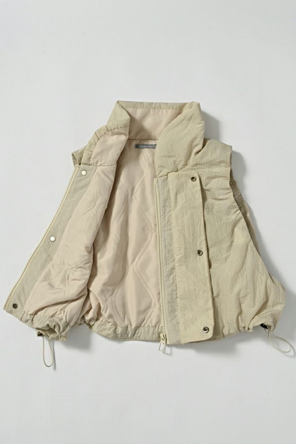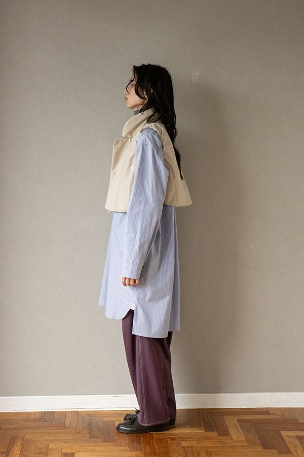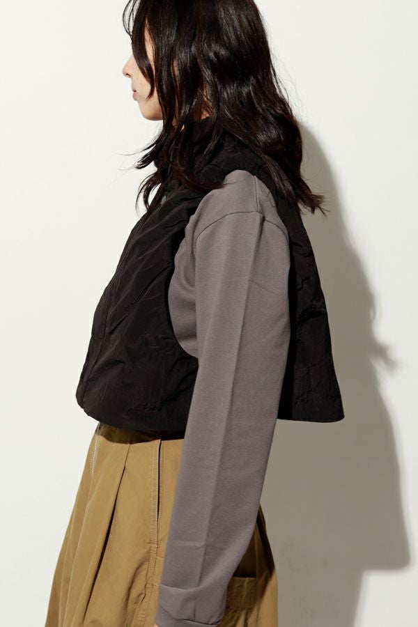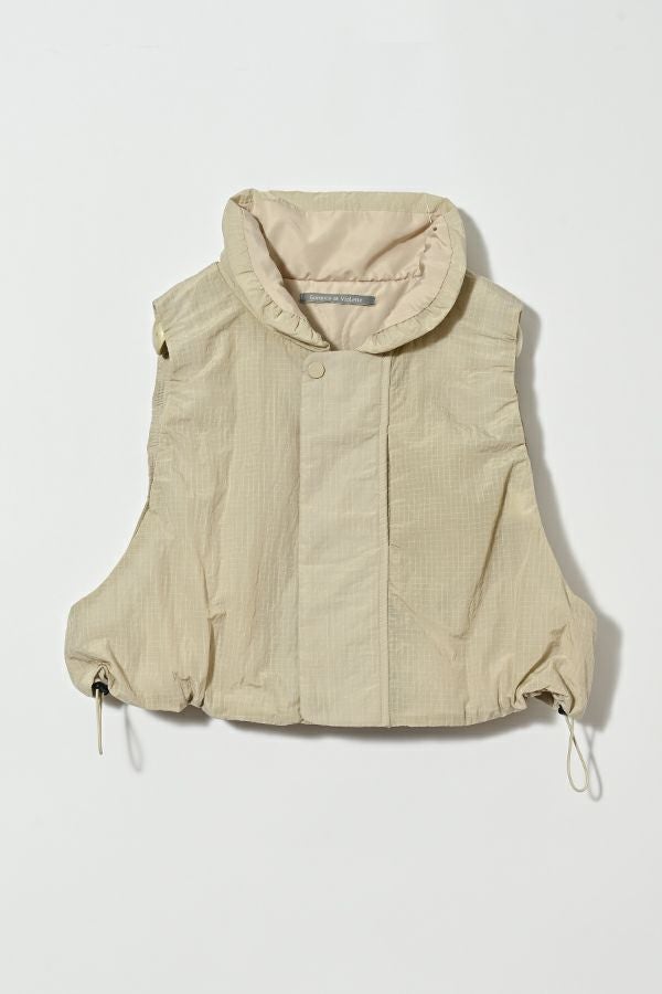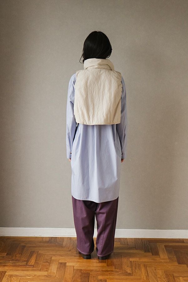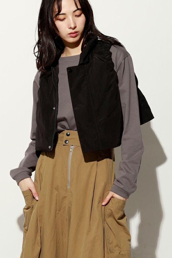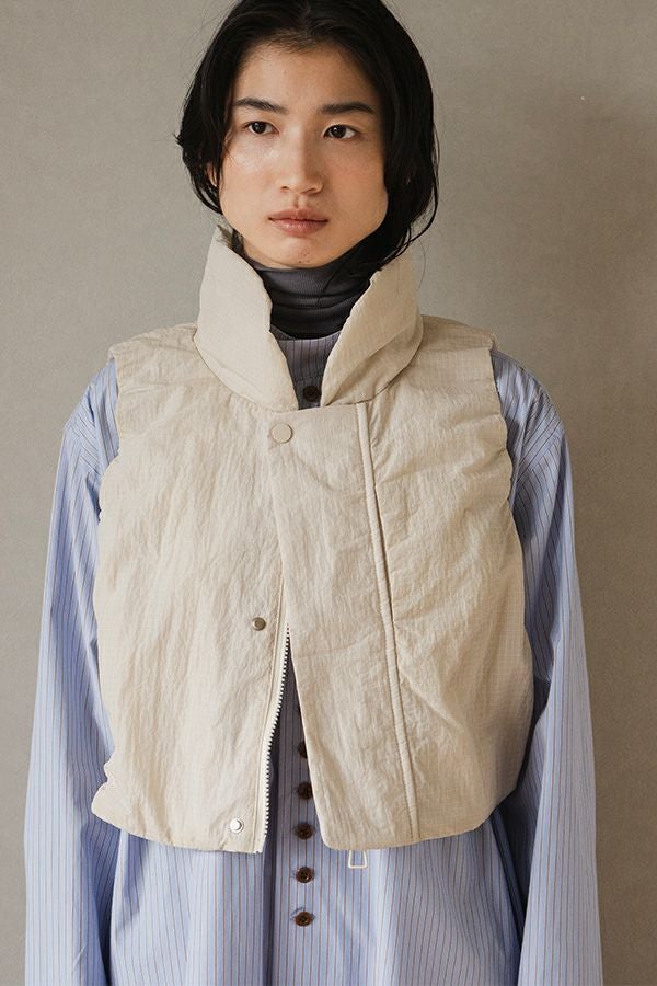 重ねるほどに新しい表情、レイヤード上手なショートベスト。 短め丈とボリューム感のあるシルエットが魅力のアイテム。ロングシャツやスウェット、アウターの上にも重ねられる大きめのアームホールで、着こなしの幅がぐんと広がります。レイヤードスタイルに奥行きを生む、まさに「重ねるための」一着です。 大きめにデザインされたスタンドカラーには程よい膨らみがあり、顔まわりに立体感とあたたかみをプラス。胸元には、シームに沿った目立ちにくいポケットを配置し、上品な佇まいを損なうことなく収納性を確保。裾のドローコードを絞ることで、シルエットに変化をつけて楽しめます。 素材には、軽やかで撥水性のあるナイロンリップストップを採用。 ナイロンならではのほのかな光沢感としなやかさがあり、アウトドアライクになりすぎず、日常のスタイリングにもすんなり馴染みます。薄手ながらも中綿入りで保温性にも優れ、寒暖差のある季節の強い味方に。トレンド感を取り入れつつも、上品で使いやすい。そんな大人のレイヤードスタイルにフィットする、着回し力の高い一着です。