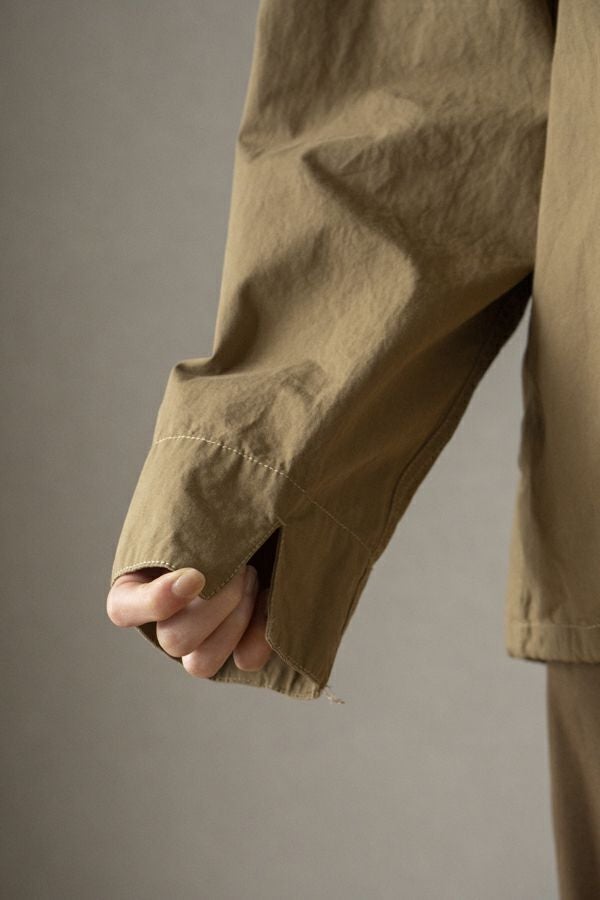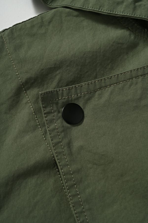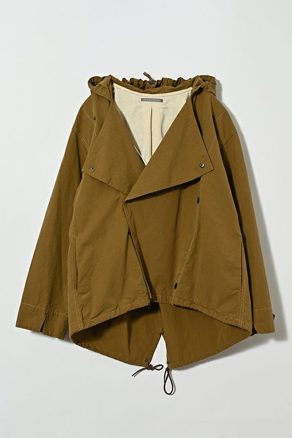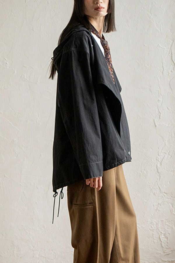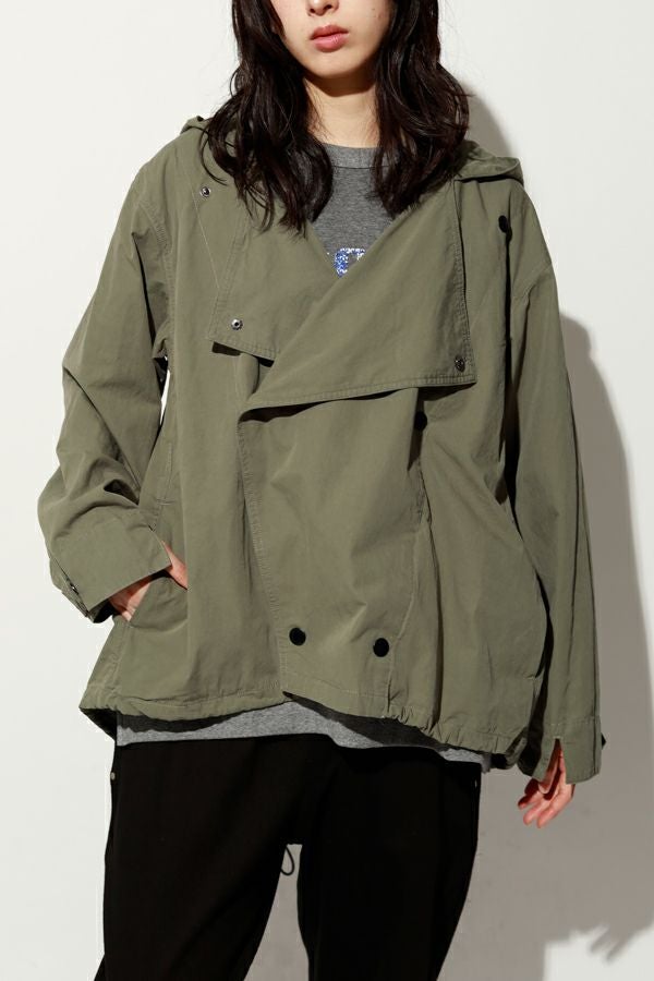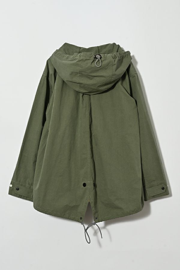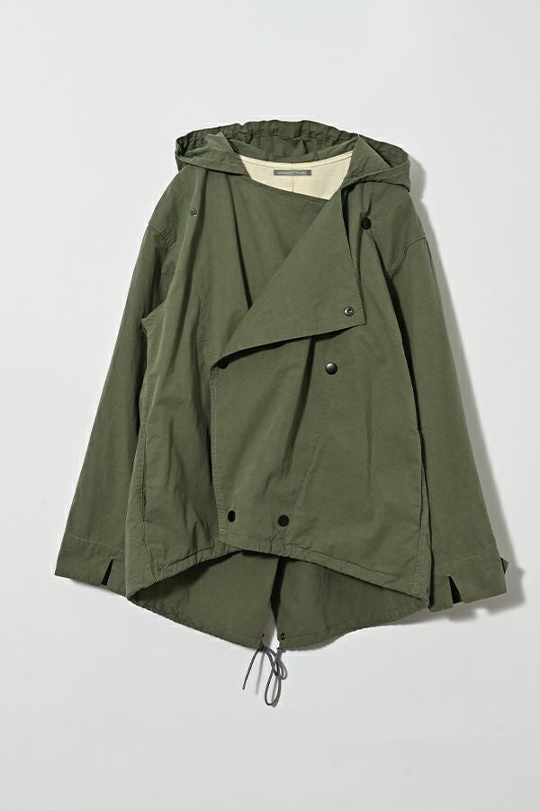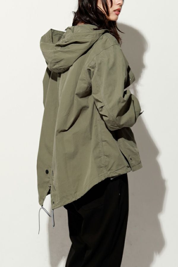 ミリタリーを今の気分で、ドレープが揺れるショートモッズパーカー。 適度なハリ感にあるミリタリー素材を着古感がでるように加工しています。洗いをかけることで、柔らかさが出て、ソフトな肌触りに。 縫製には、かつてのワーク&ミリタリーウェアに宿る、糸を交換する手間を省略するために細く長い糸を使用し強度を増すため2本取りにした“効率と工夫”のストーリーをインスピレーションにしたステッチデザインを採用。巻き縫いミシンや二本取りステッチが、無骨な雰囲気と共に、見えない手間の美しさを感じさせてくれます。