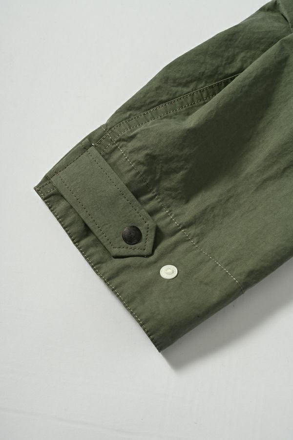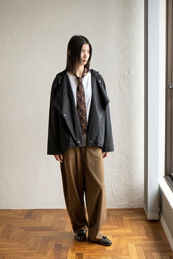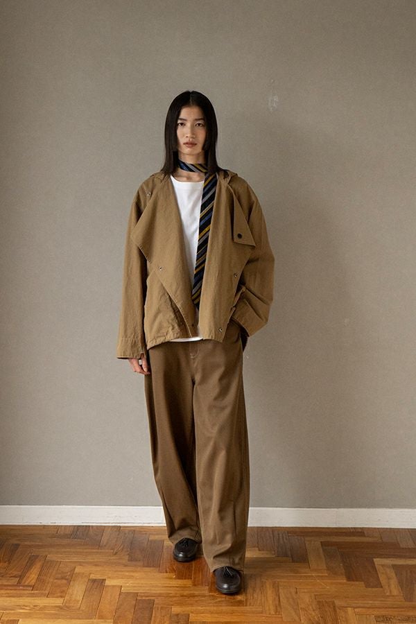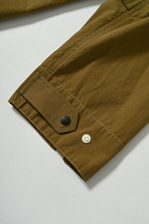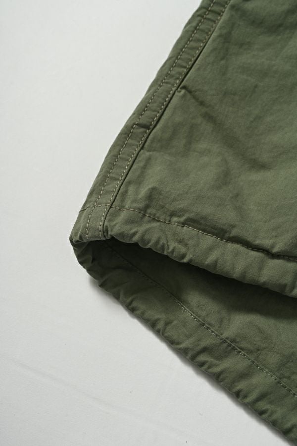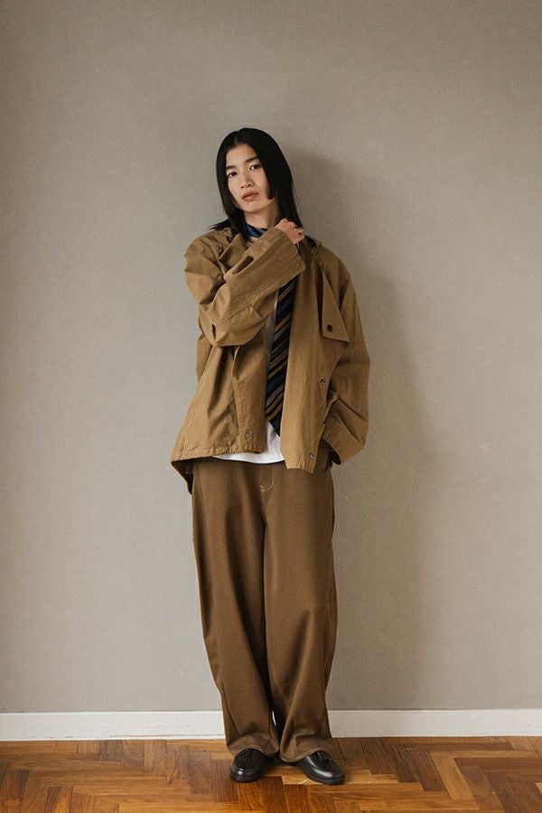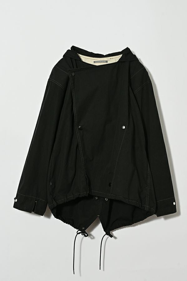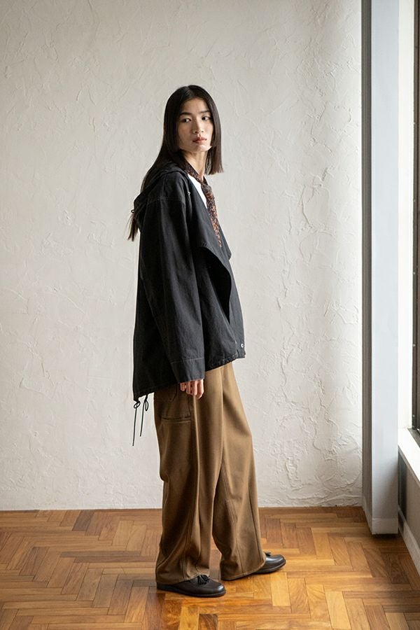 ミリタリーを今の気分で、ドレープが揺れるショートモッズパーカー。 適度なハリ感にあるミリタリー素材を着古感がでるように加工しています。洗いをかけることで、柔らかさが出て、ソフトな肌触りに。 縫製には、かつてのワーク&ミリタリーウェアに宿る、糸を交換する手間を省略するために細く長い糸を使用し強度を増すため2本取りにした“効率と工夫”のストーリーをインスピレーションにしたステッチデザインを採用。巻き縫いミシンや二本取りステッチが、無骨な雰囲気と共に、見えない手間の美しさを感じさせてくれます。