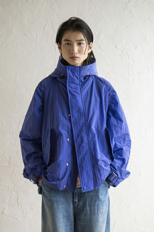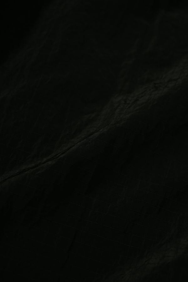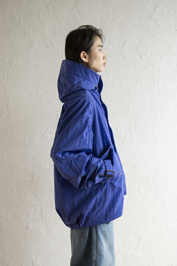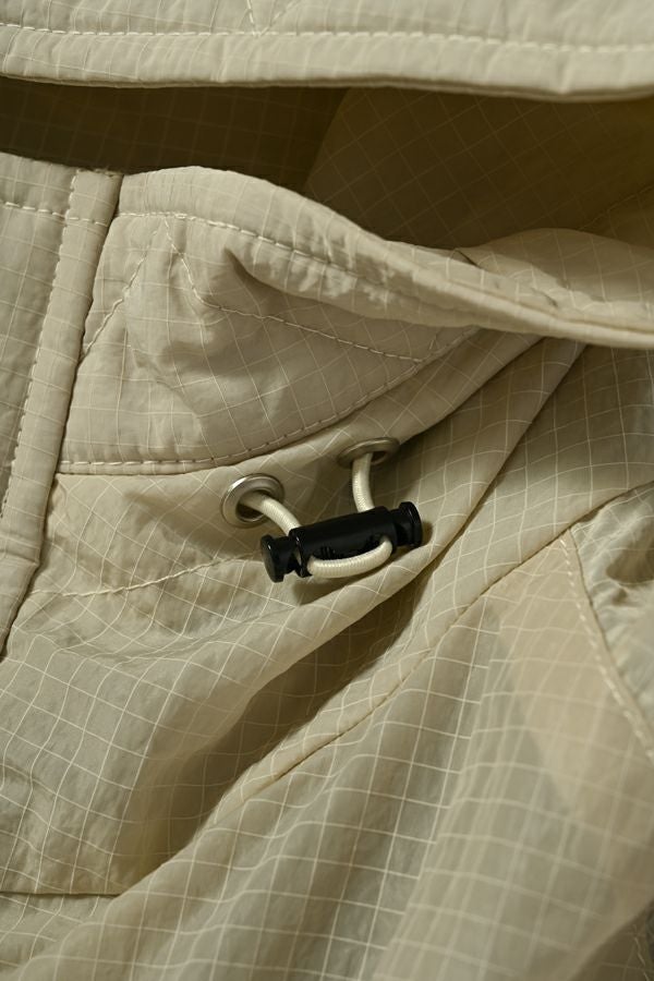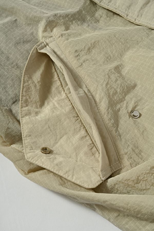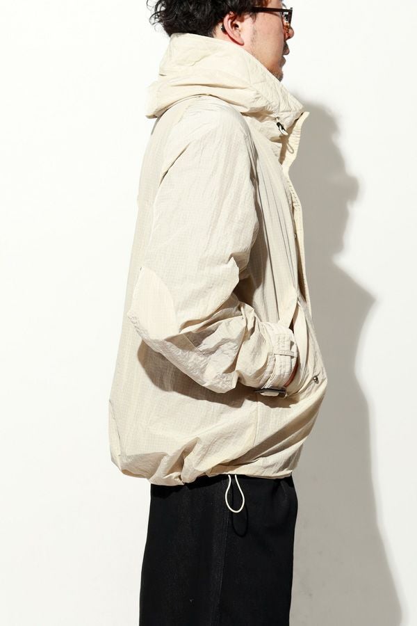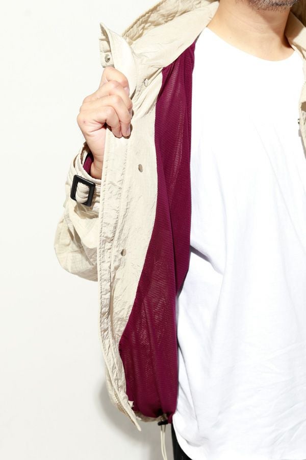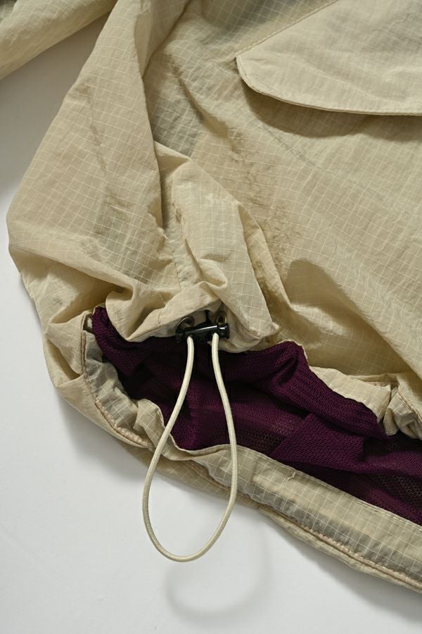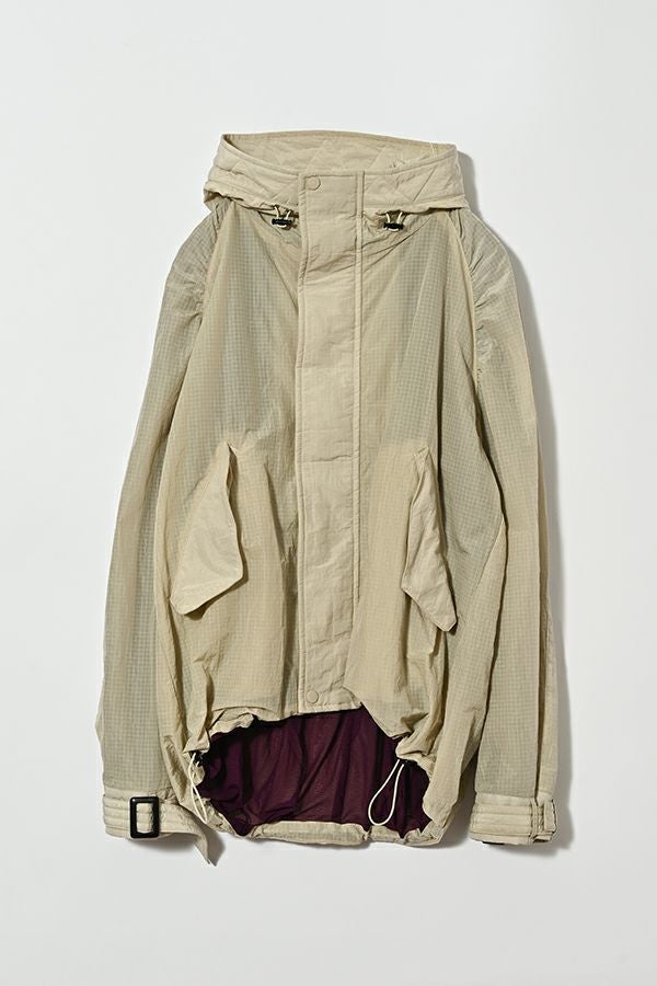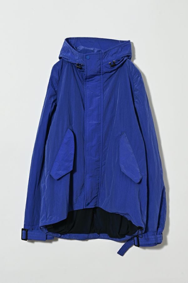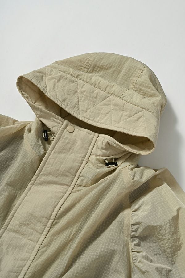 空気を纏うように軽やかに、機能性を兼ね備えたマウンテンパーカー。 袖や裾にタックやギャザーを効かせ、フード周りも立体的なパターンに仕立てた、空気感のあるアイテム。ナイロン特有のまとわりつく不快感を軽減し、体との間に心地よいゆとりを生むデザインです。顔に直接当たらないフード設計は、メイク崩れを気にせず着用できる女性にうれしい仕様。機能性とデザイン性を両立した一枚です。 素材には、軽くしなやかで光沢感のある撥水リップストップを使用。小雨程度なら弾き、通気性の高いメッシュ裏地が蒸れを防いでくれます。体の動きに自然とフィットする伸縮性もあり、アウトドアにもデイリーにも活躍。 ゴアパーカーをベースにしたミリタリーテイストのディテールも魅力のひとつ。雨の侵入を防ぐ工夫を凝らしたポケットや、着用時に力を入れやすいよう工夫された袖口のベルトなど、機能美が細部にまで宿る一着です。