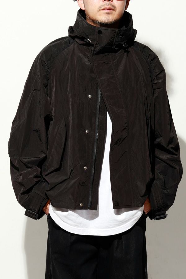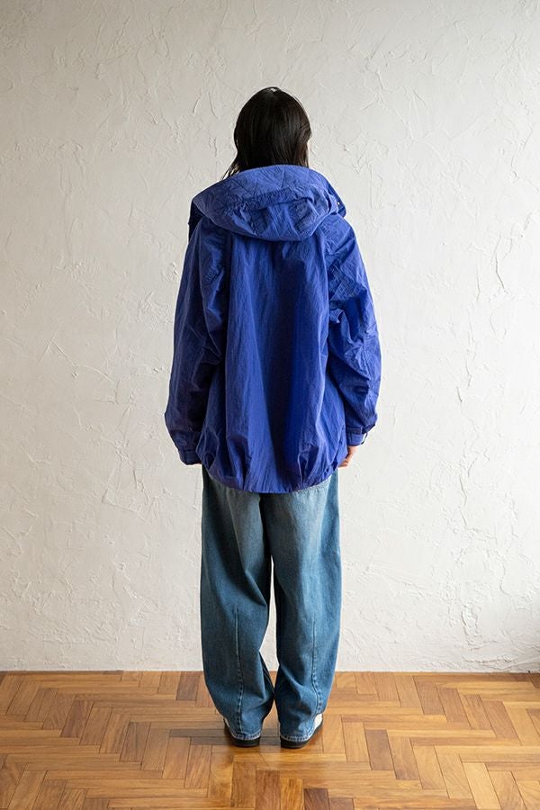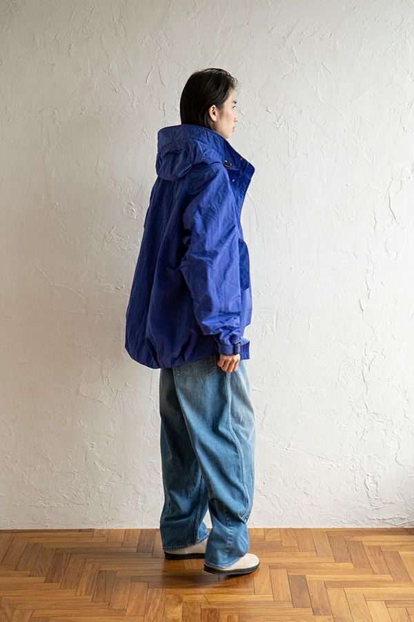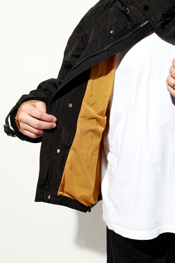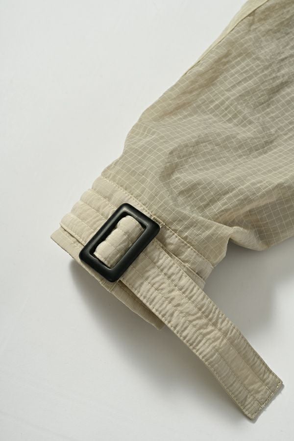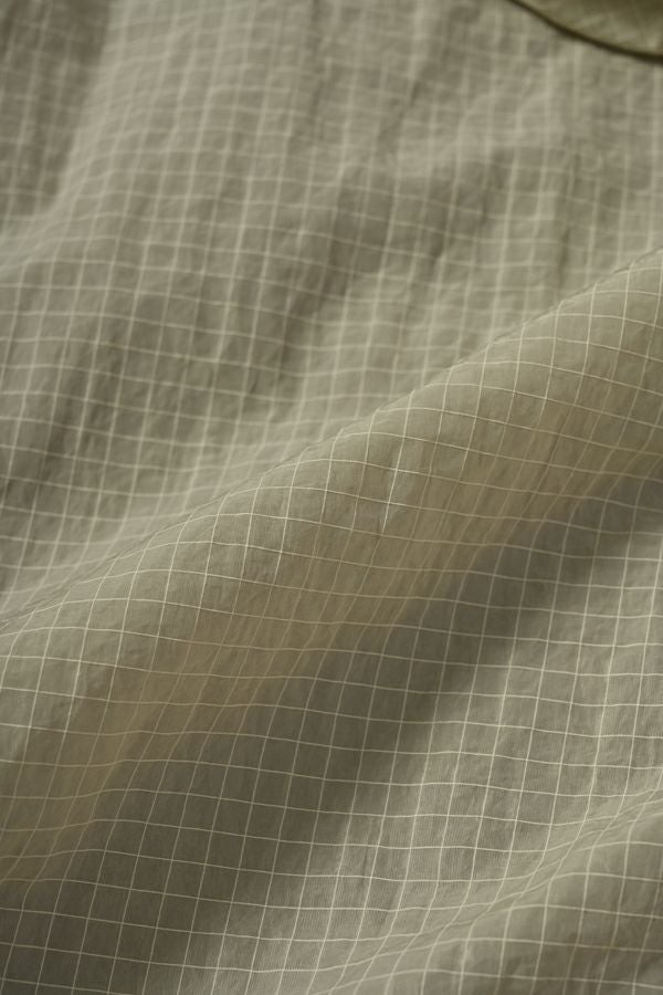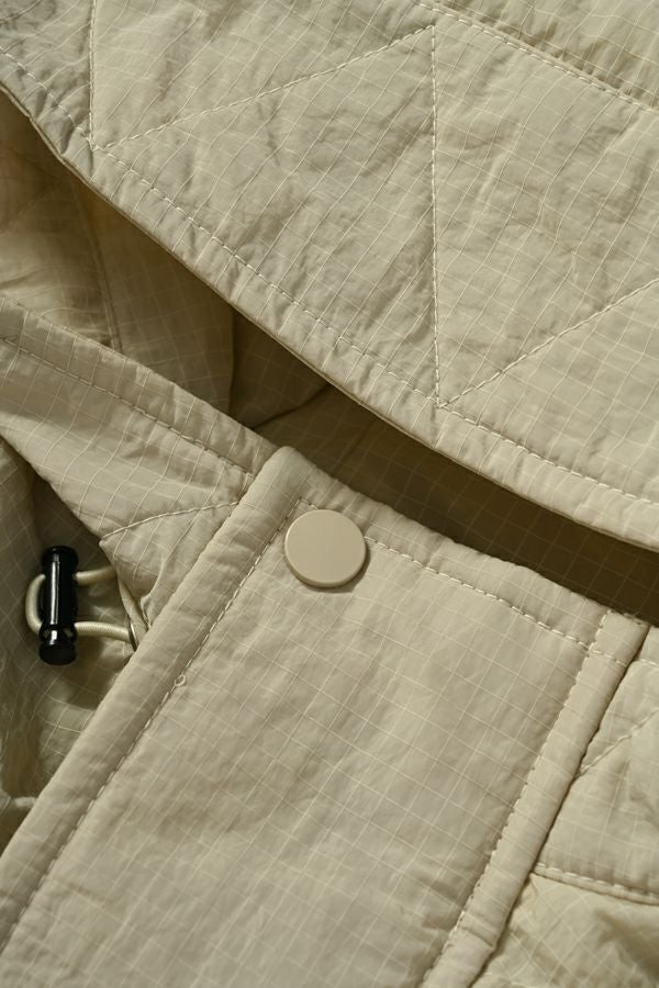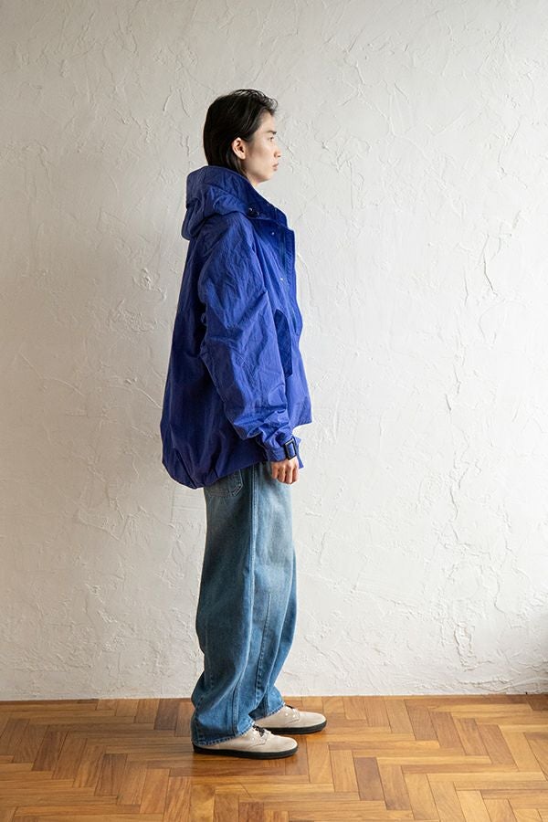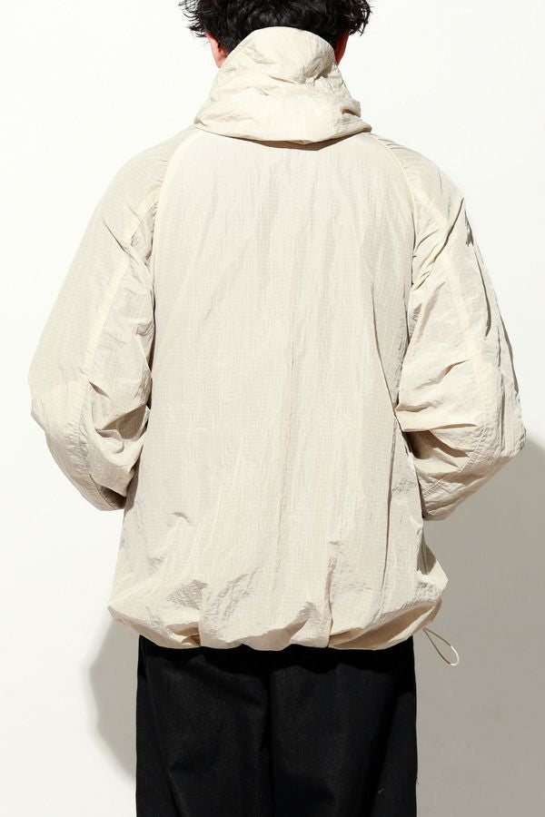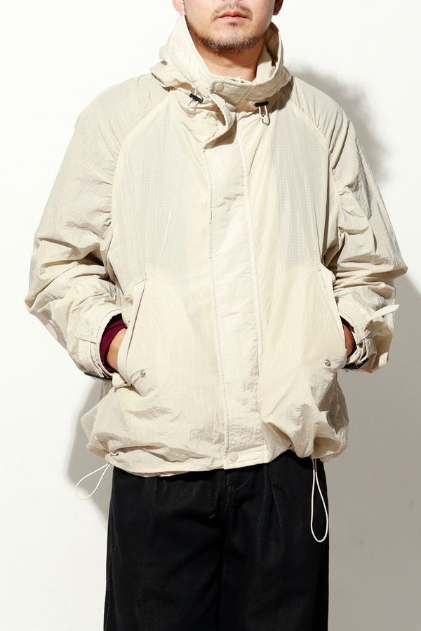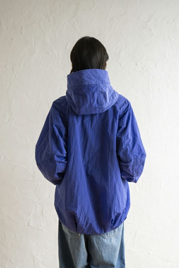 空気を纏うように軽やかに、機能性を兼ね備えたマウンテンパーカー。 袖や裾にタックやギャザーを効かせ、フード周りも立体的なパターンに仕立てた、空気感のあるアイテム。ナイロン特有のまとわりつく不快感を軽減し、体との間に心地よいゆとりを生むデザインです。顔に直接当たらないフード設計は、メイク崩れを気にせず着用できる女性にうれしい仕様。機能性とデザイン性を両立した一枚です。 素材には、軽くしなやかで光沢感のある撥水リップストップを使用。小雨程度なら弾き、通気性の高いメッシュ裏地が蒸れを防いでくれます。体の動きに自然とフィットする伸縮性もあり、アウトドアにもデイリーにも活躍。 ゴアパーカーをベースにしたミリタリーテイストのディテールも魅力のひとつ。雨の侵入を防ぐ工夫を凝らしたポケットや、着用時に力を入れやすいよう工夫された袖口のベルトなど、機能美が細部にまで宿る一着です。