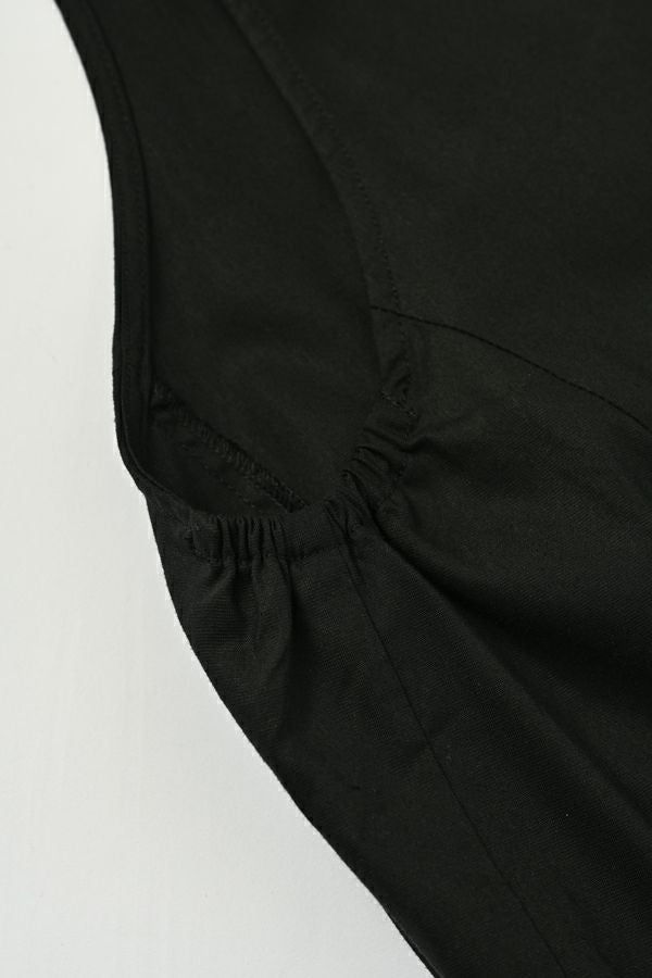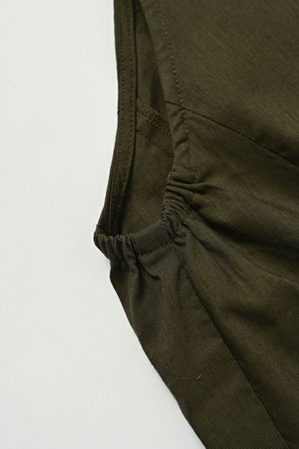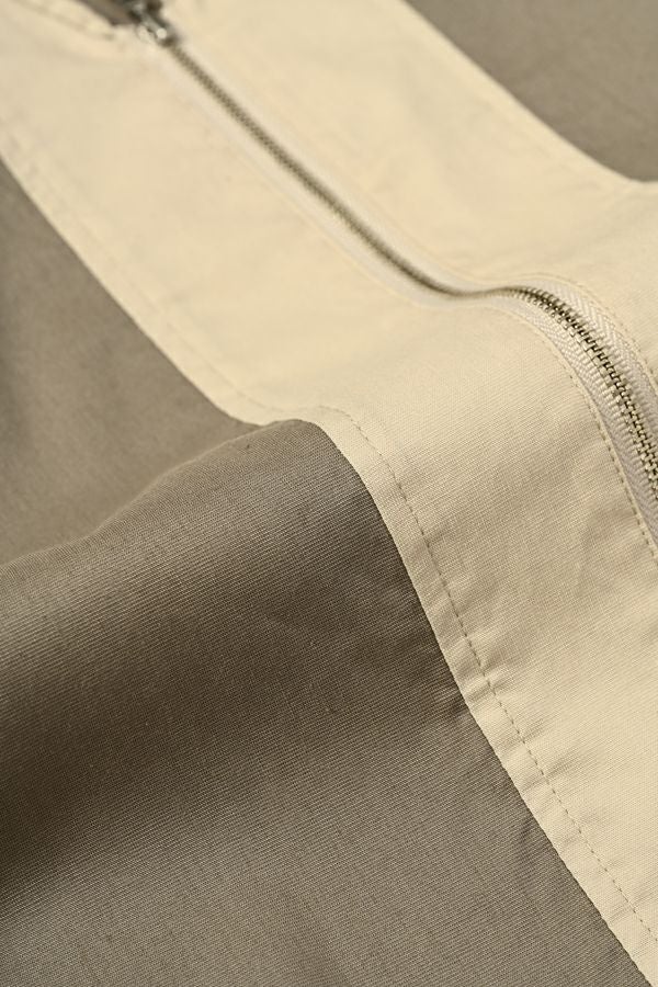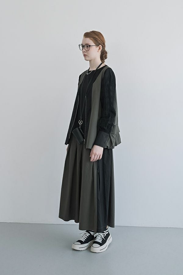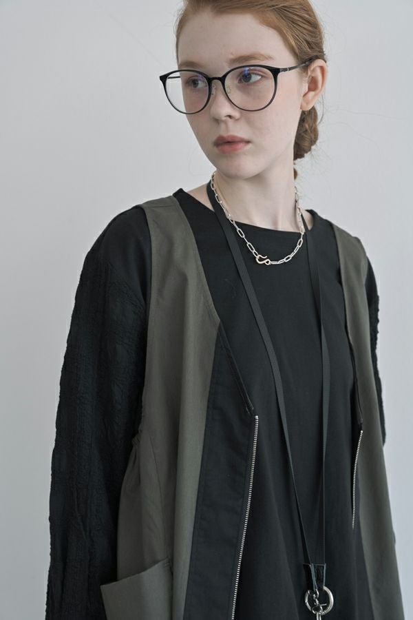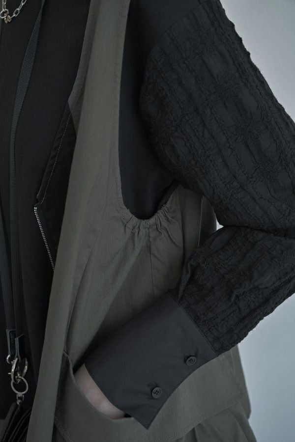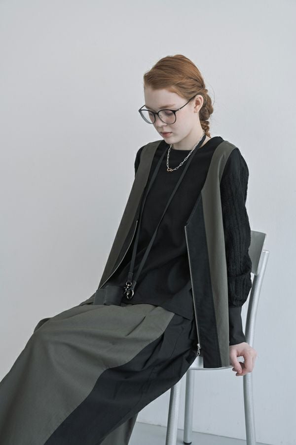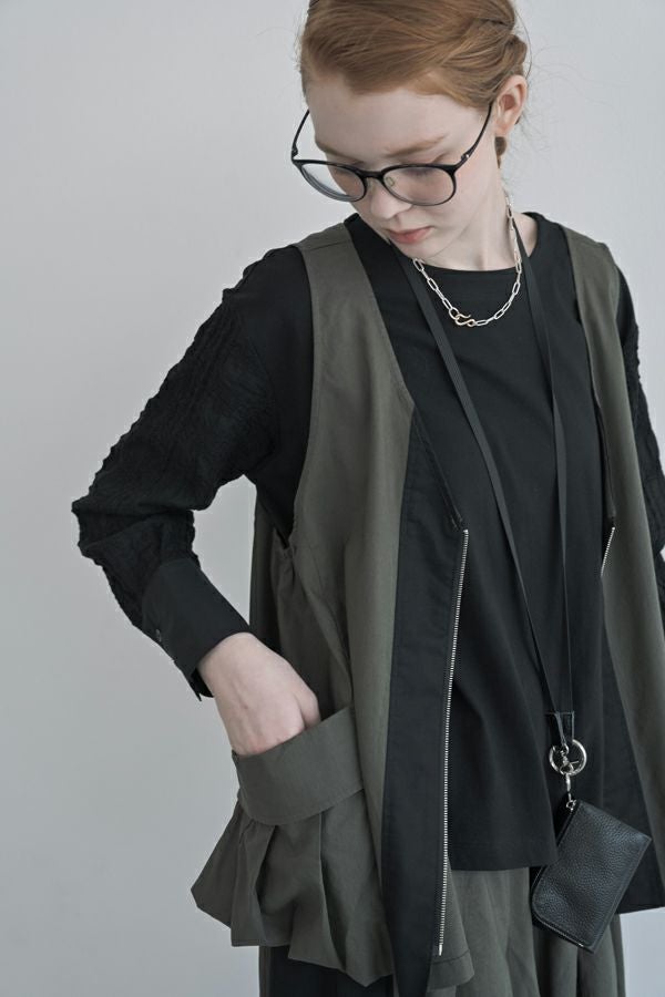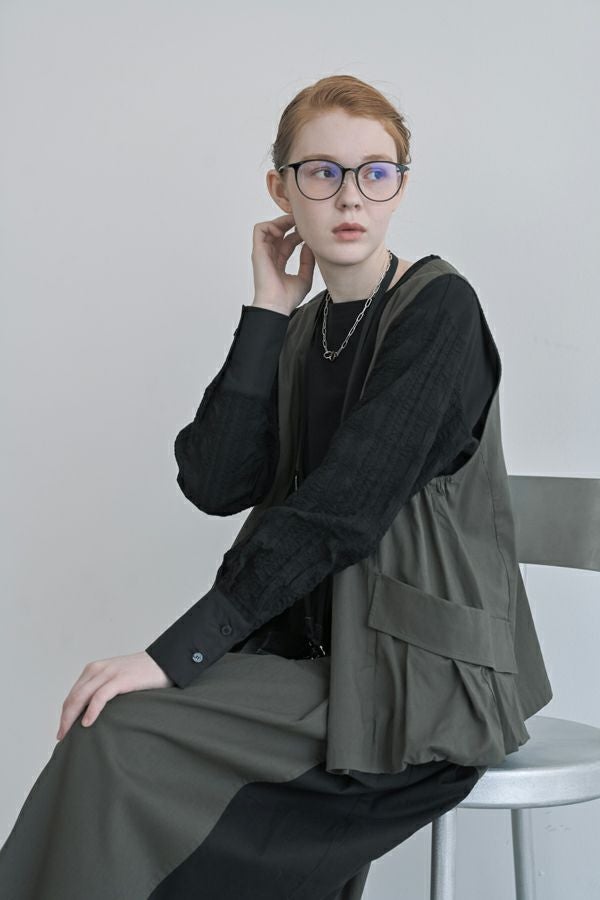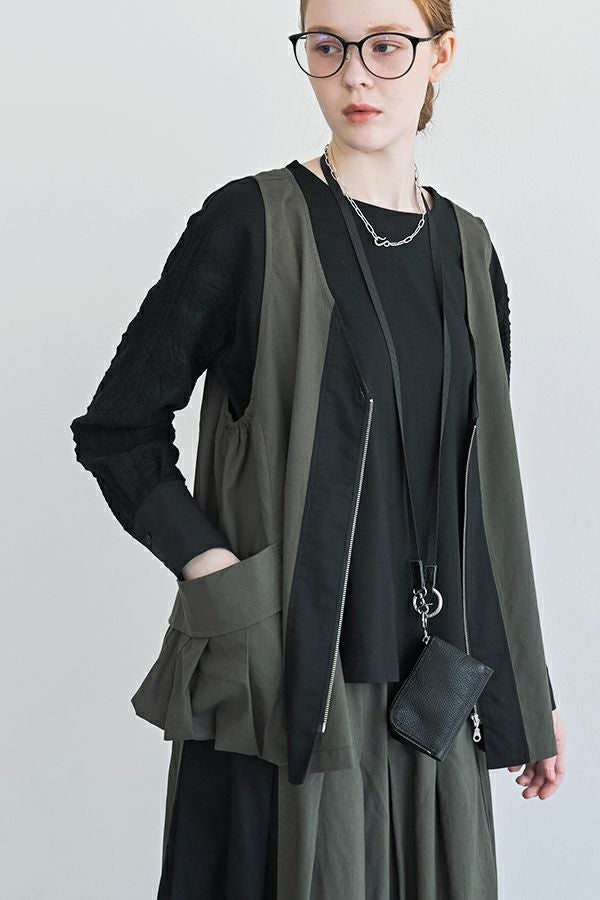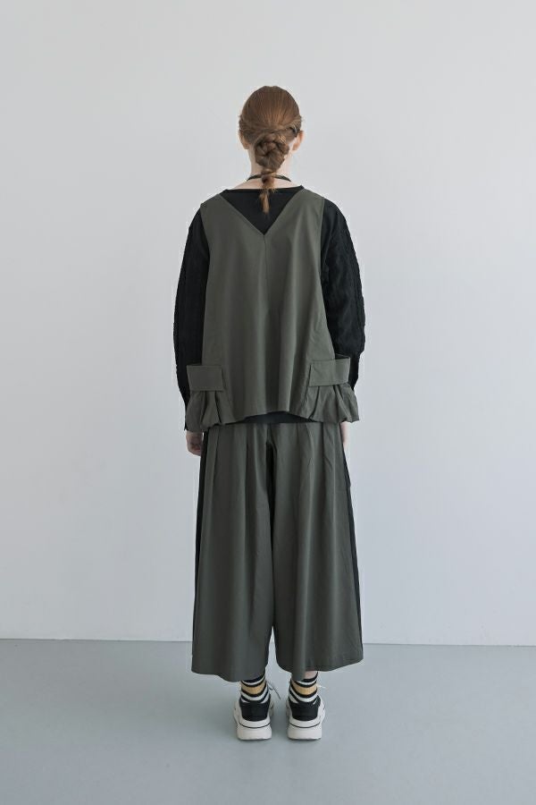 ヴィンテージテイストが香る、配色デザインショートベスト。 細かなシボ感とライトでソフトな風合いが特徴のヴィンテージ感漂う素材を使用。 絶妙な配色デザインが、どこか懐かしくも新しい印象を与えます。 袖ぐりにはゴムギャザーを施し、着心地の良さとさりげないボリューム感を演出。 サイドポケットの下部分には、ゆったりとしたバルーンシルエットを作り出し、立体感が際立つディテールが特徴です。 衿元は深いVネック仕様で、前身頃の切り替え配色が細見え効果を発揮。体のラインをカバーしつつ、スタイリッシュな印象をキープします。両脇の大きなフラップポケットは、実用性とアクセントを兼ね備え、どの角度から見ても洗練された雰囲気に。 トレンド感とクラシック感をバランスよく取り入れた一着で、コーディネートにひと味違う存在感をプラスします。 ●サイド切替タックパンツ(25228-9397F-R)とセットアップ可