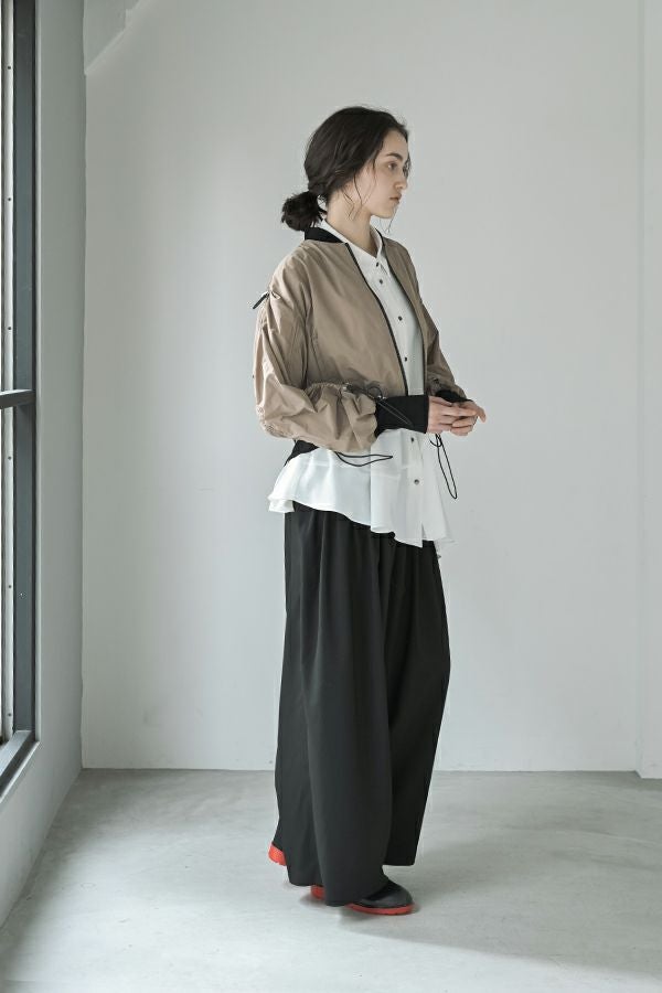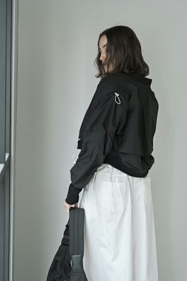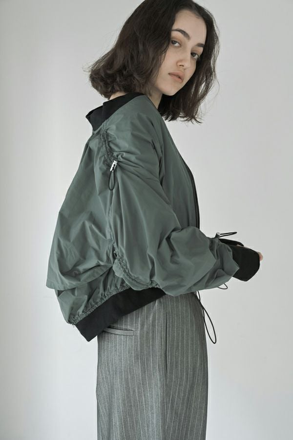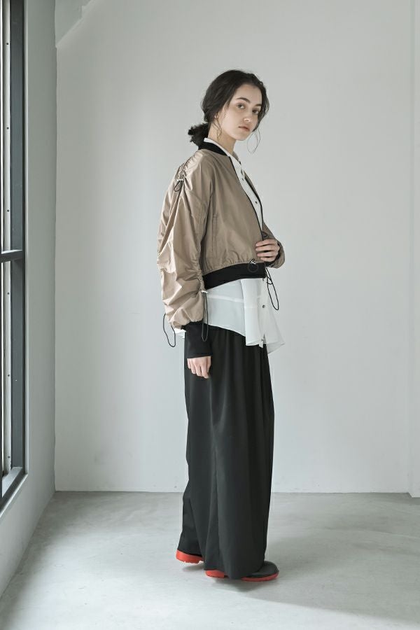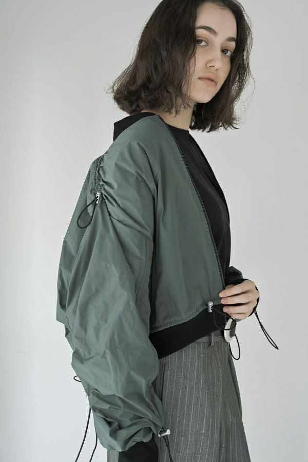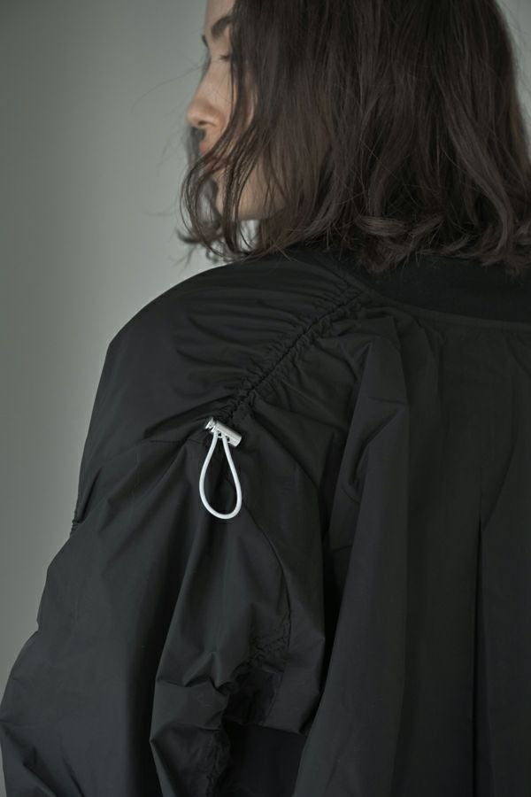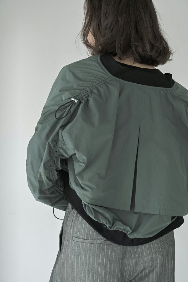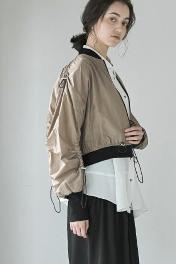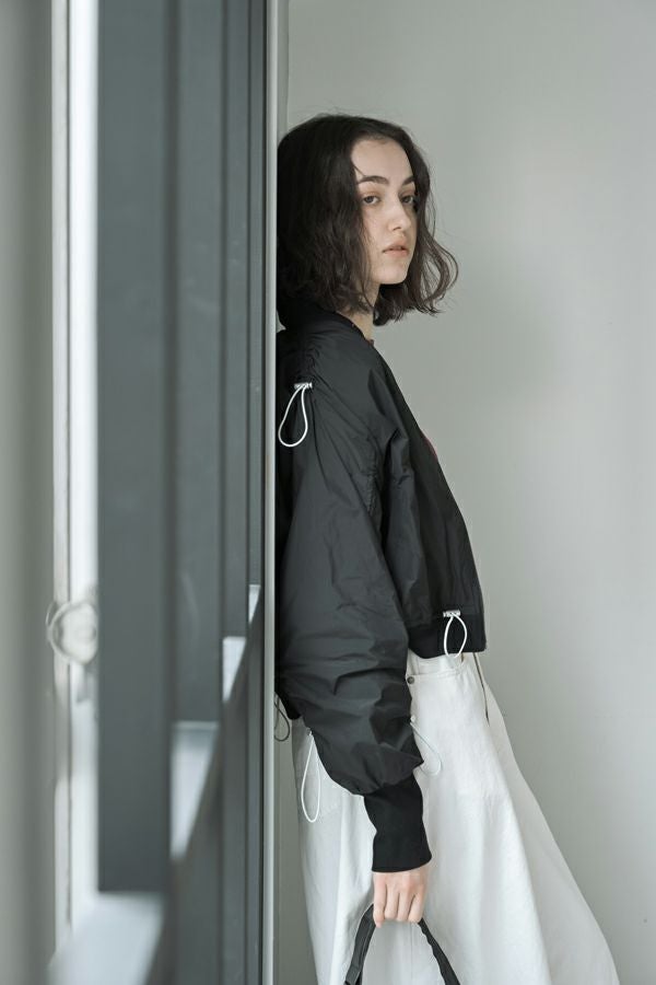 軽やかさと遊び心を纏った、シャーリングブルゾン。 シャーリングデザインが目を惹くショート丈ブルゾンは、トレンド感のあるシルエットと、軽やかなポリエステル素材でサッと羽織れる優れもの。長めの袖口リブと裾のドローストリングがさりげないアクセントになり、大人のカジュアルスタイルに抜け感と動きをプラスします。 街歩きや旅行など、アクティブなシーンにもぴったりで、軽やかな着心地が行動力を後押し。ワイドパンツやロングスカートなど、ボトムを選ばずバランスよく着こなせるのも嬉しいポイント。 シンプルな中に程よくモード感を宿した、デイリーに寄り添う一着です。