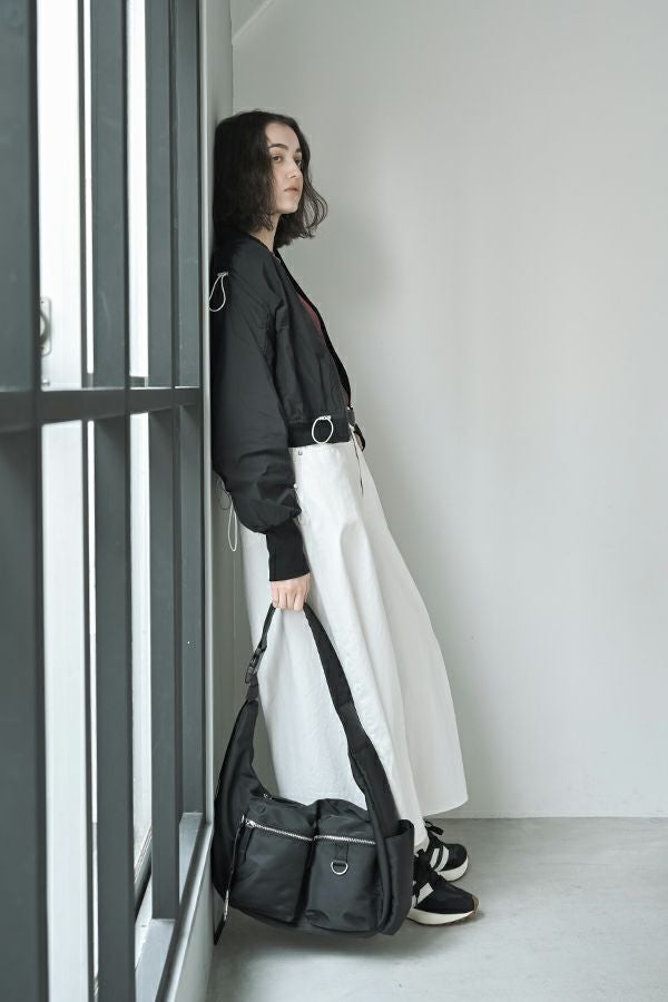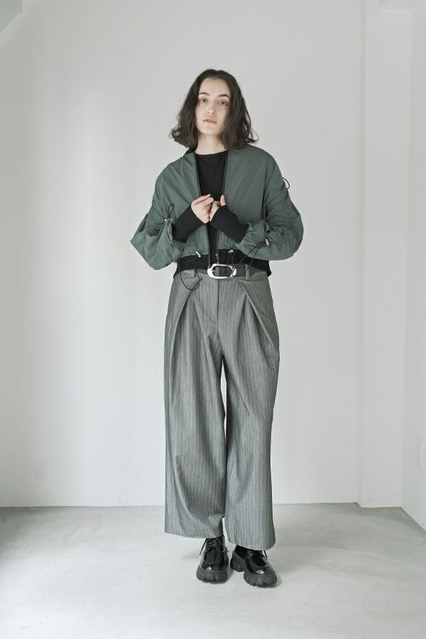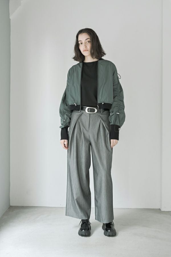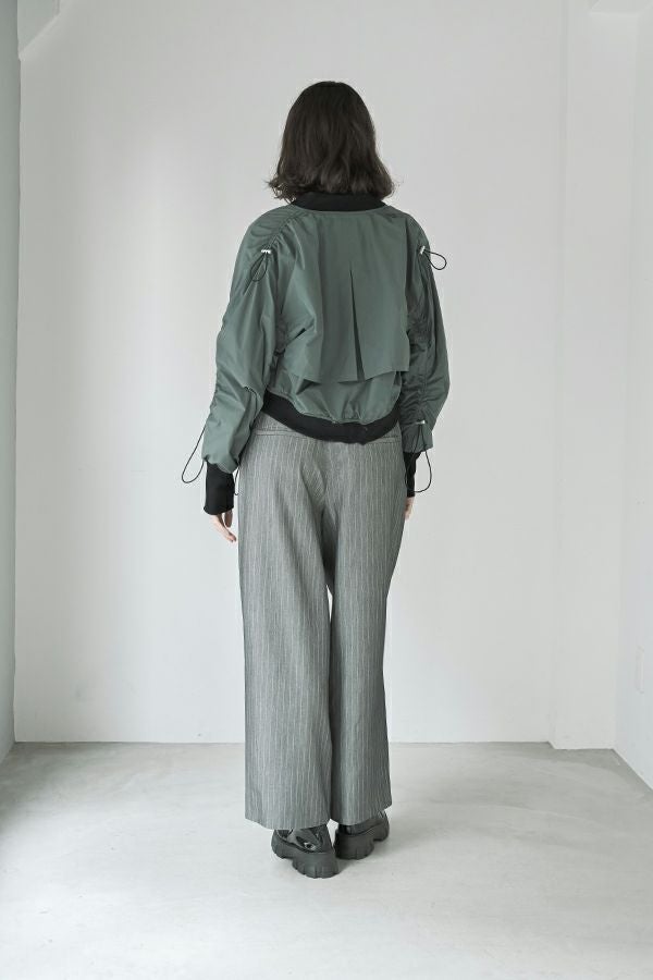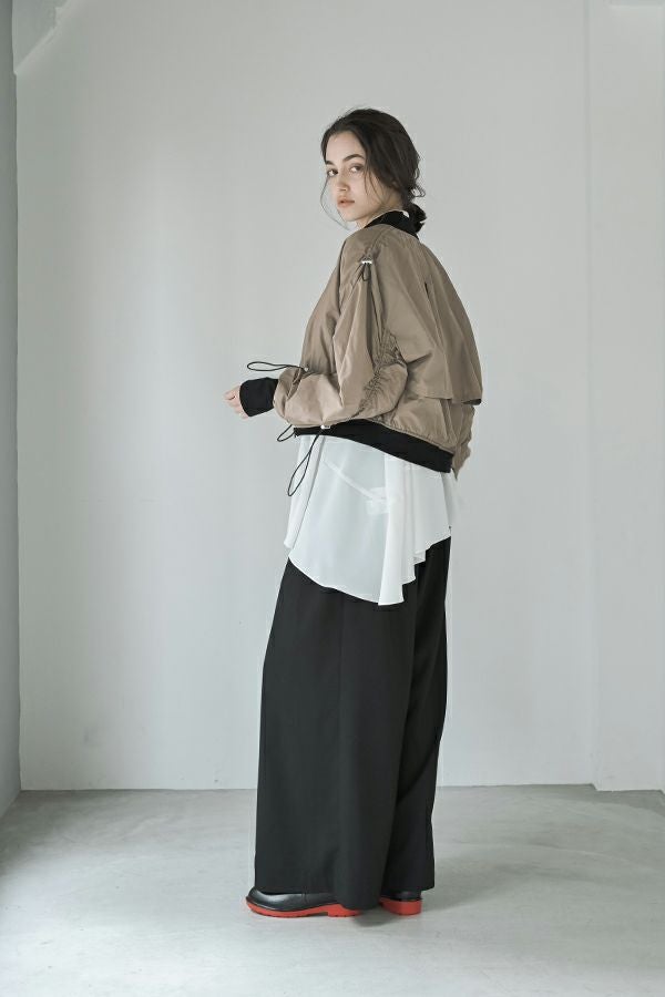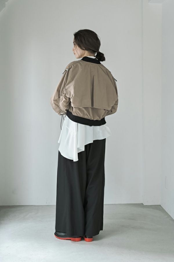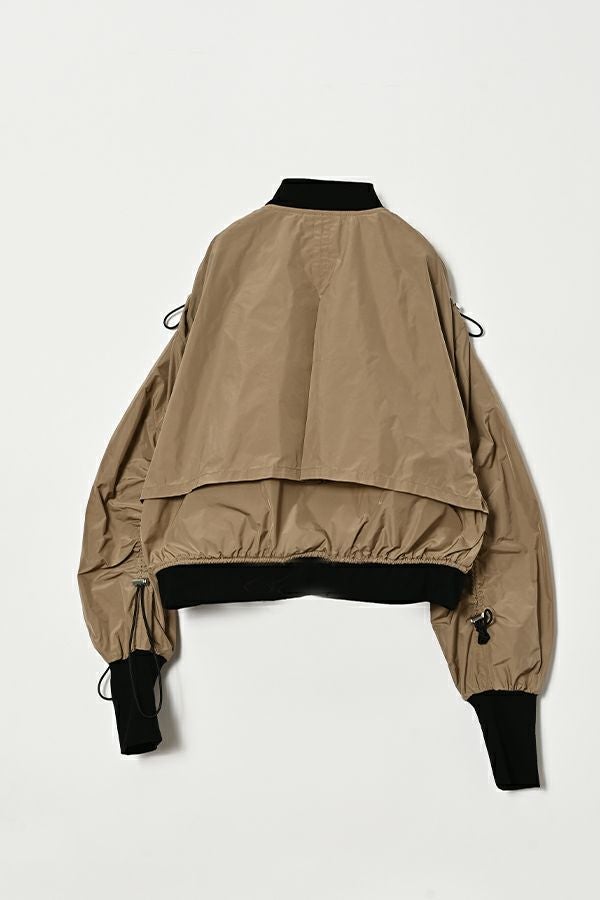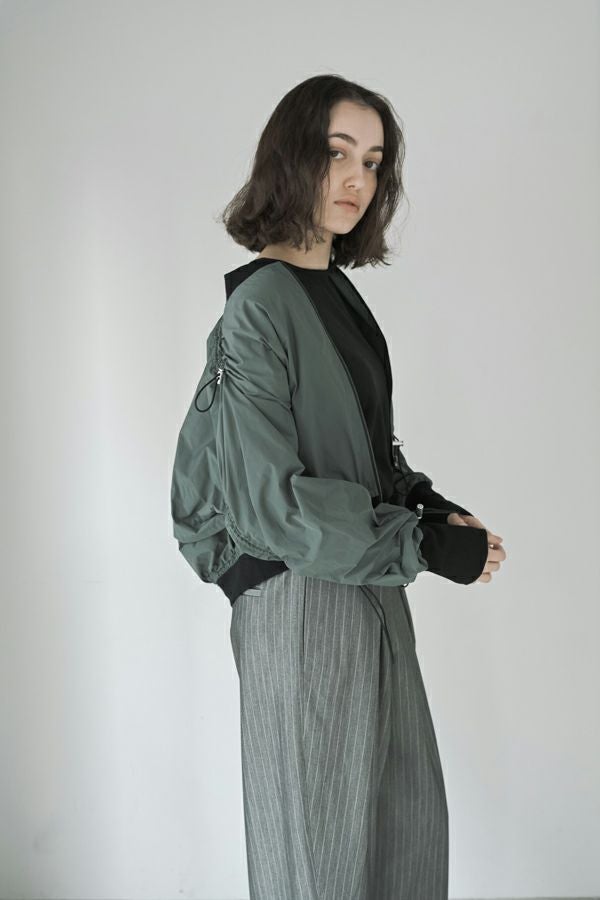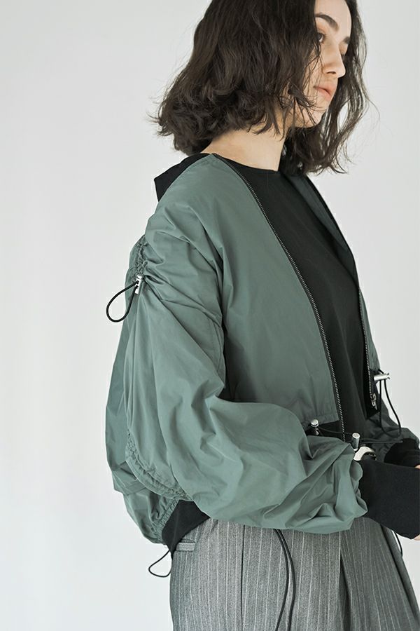 軽やかさと遊び心を纏った、シャーリングブルゾン。 シャーリングデザインが目を惹くショート丈ブルゾンは、トレンド感のあるシルエットと、軽やかなポリエステル素材でサッと羽織れる優れもの。長めの袖口リブと裾のドローストリングがさりげないアクセントになり、大人のカジュアルスタイルに抜け感と動きをプラスします。 街歩きや旅行など、アクティブなシーンにもぴったりで、軽やかな着心地が行動力を後押し。ワイドパンツやロングスカートなど、ボトムを選ばずバランスよく着こなせるのも嬉しいポイント。 シンプルな中に程よくモード感を宿した、デイリーに寄り添う一着です。