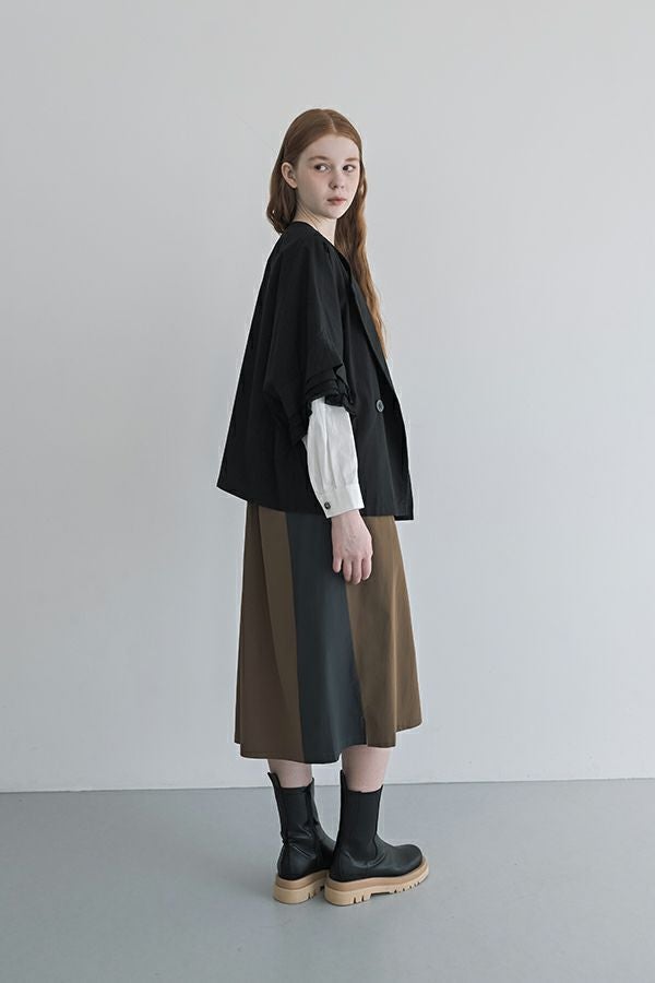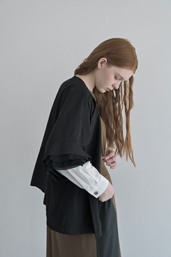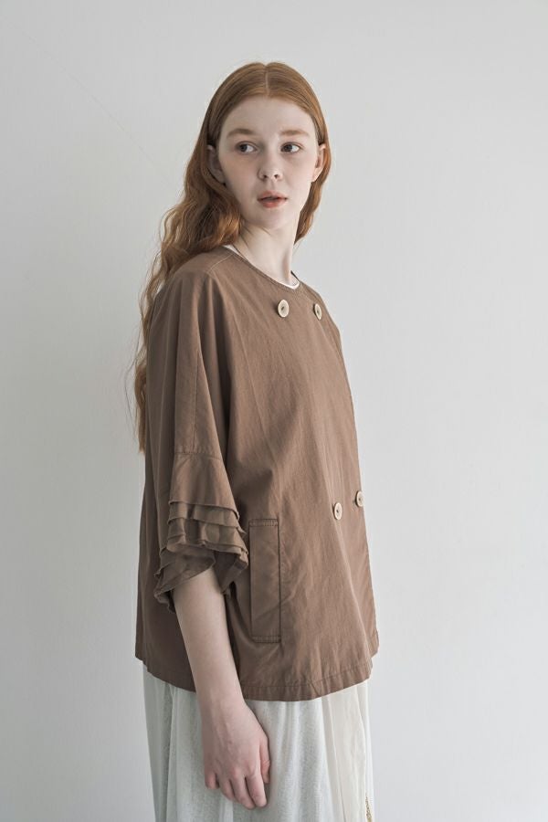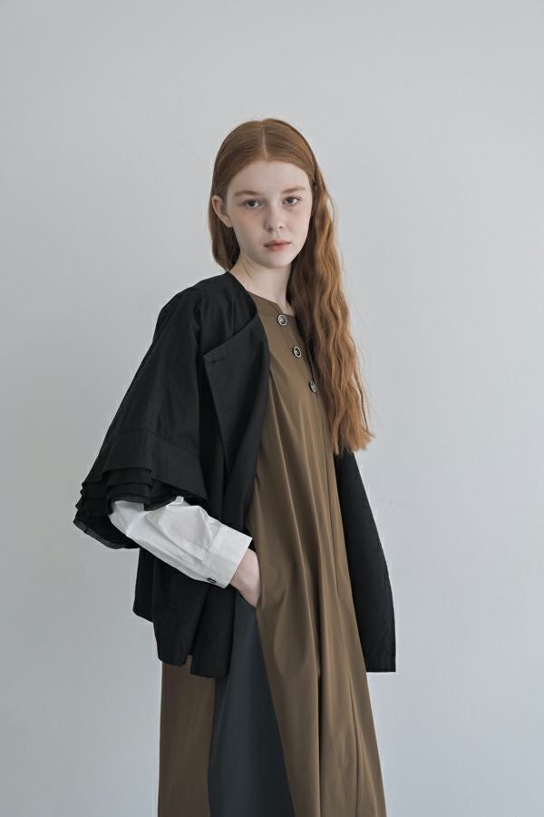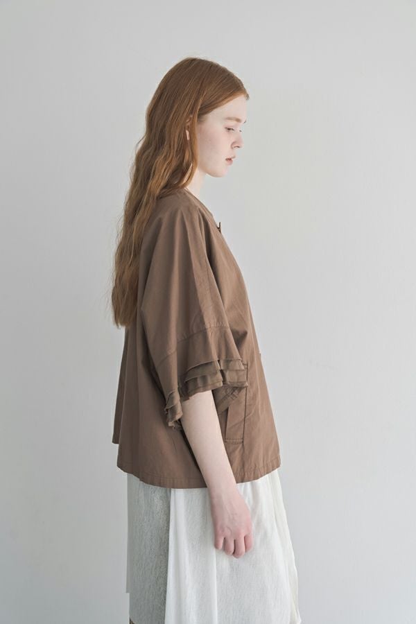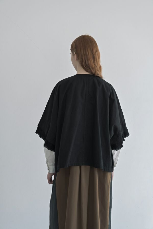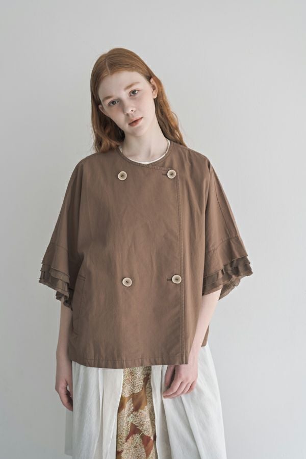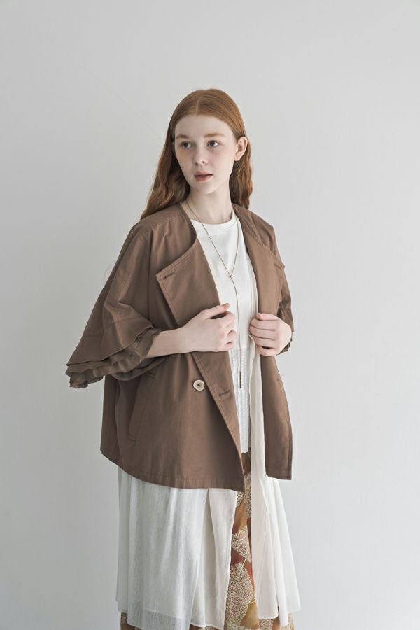ロングシーズン着回せる、五分袖ショートジャケット。 短めの5分袖がベストのように気軽に羽織れる便利なライトアウター。裏なし仕様なのでロングシーズンにわたって活躍します。 身幅にはゆとりを持たせつつ、スッキリとしたバランスのクロップド丈が絶妙で、幅広い体型にも馴染みます。ノーカラーデザインが顔周りを明るく見せ、いろいろなコーディネートにマッチします。 製品洗いした綿素材は少しカジュアルな印象を与えつつ、同色系の切りっぱなしサテンフリルが袖口に施されており、ほんのり甘さをプラス。 今っぽいシルエットが可愛らしく、ワイドパンツやデニムパンツとのカジュアルコーディネートにぴったりです。また、スカートやワンピースにボレロ風に羽織ることで、エレガントな印象にもなり、シーンを選ばずに使えるアイテムです。