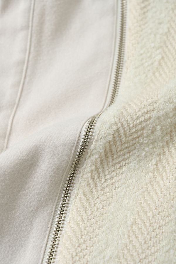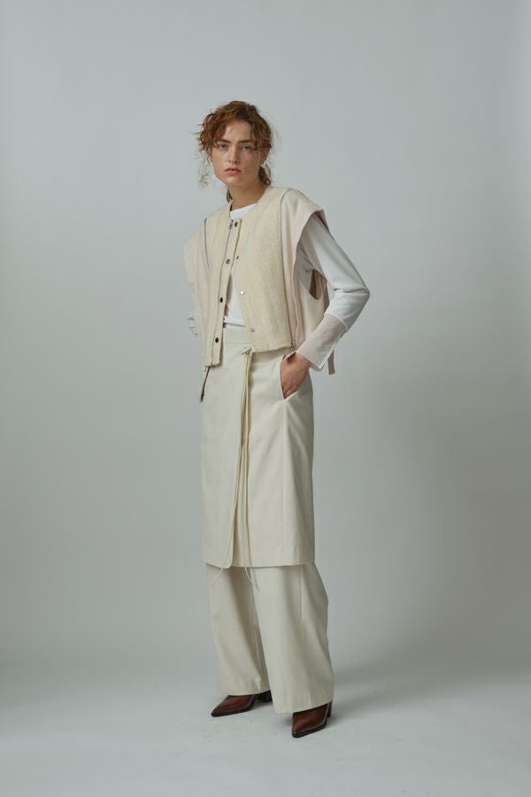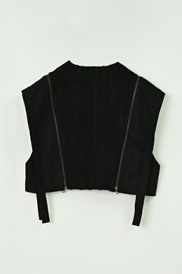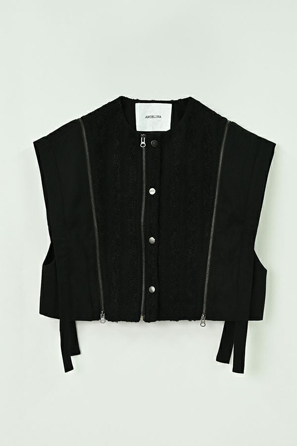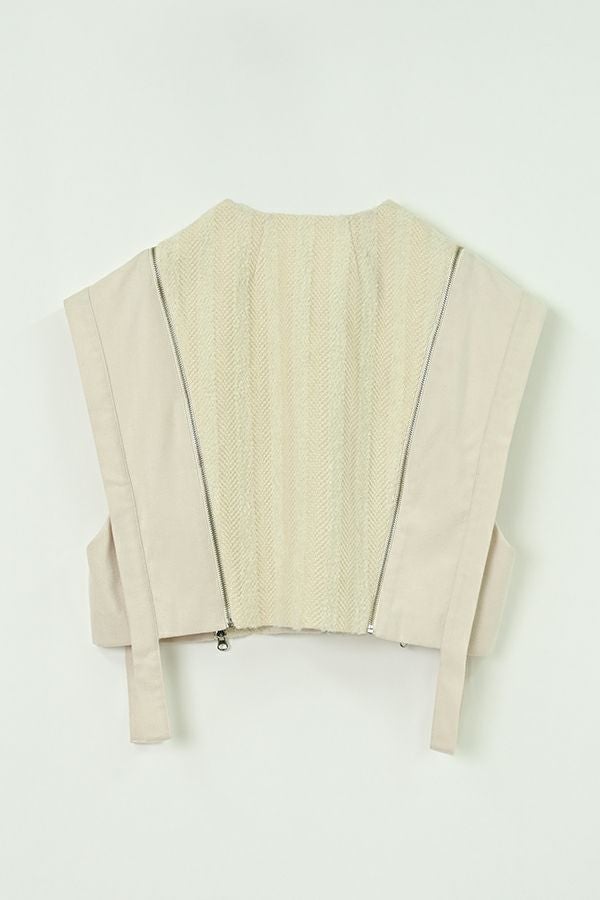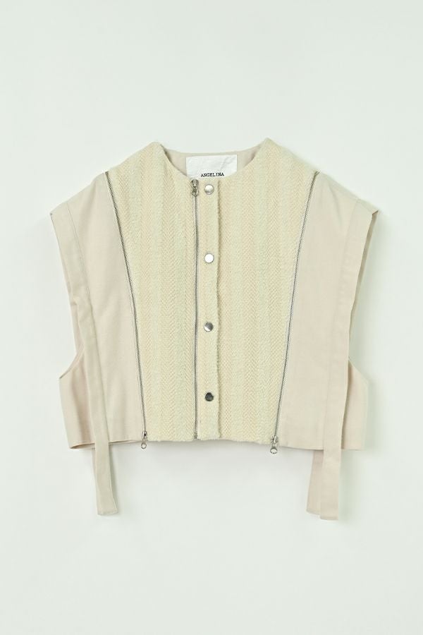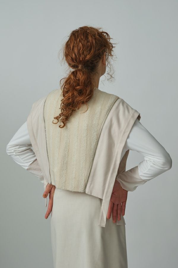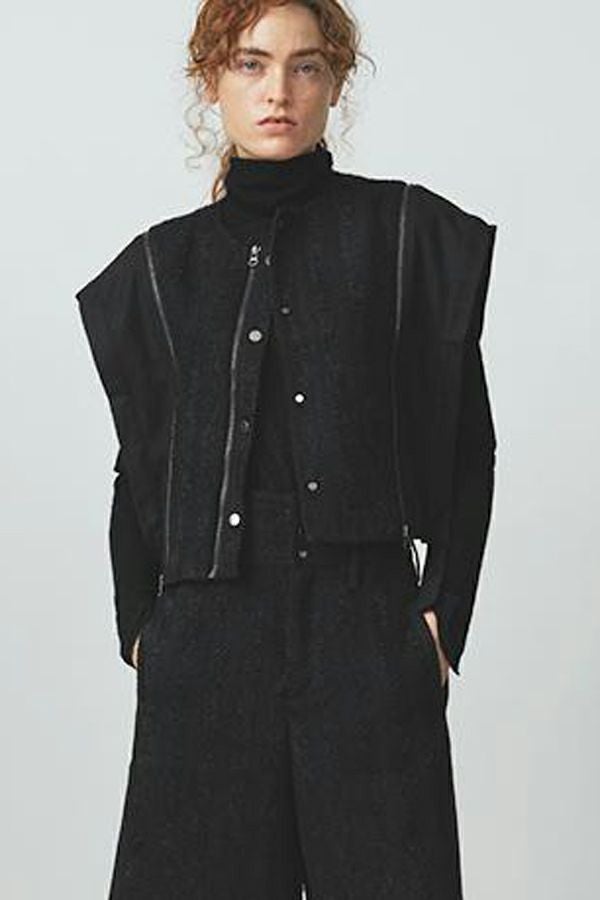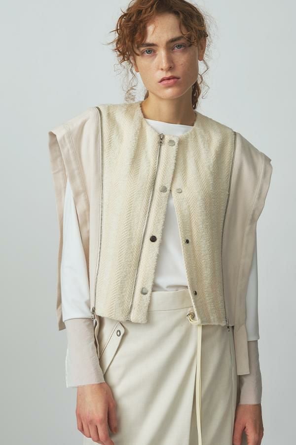 新バランスで魅せる、構築ツイードベスト。 クラシックなツイードに、メタルファスナーの無機質なシャープさを掛け合わせたアイテム。素材のコントラストが洗練された緊張感を生み出し、シンプルなスタイリングにひとさじの強さを与えます。 肩や身頃の立体的なフォルムが構築的なシルエットを生み、今季らしいモード感を演出し、着るだけでスタイルの輪郭を引き締めてくれる一枚。タートルネックやシャツとのレイヤードで袖にニュアンスを加えれば、さらに奥行きのある印象に。ワイドパンツやAラインスカートを合わせて重心を整え、モダンで都会的なバランスに仕上げるのがおすすめ。定番に甘んじない、スタイルに“エッジ”を効かせるベストです。●ウールツィード切替ハーフパンツ(25233-9732E)とセットアップ可