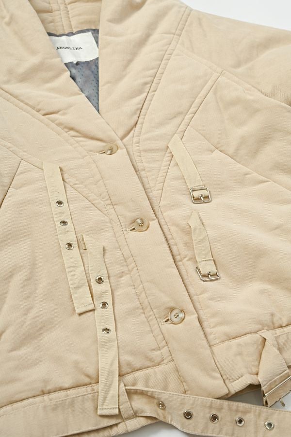ラインで魅せる、大人の中綿ブルゾン。 首元までしっかり包み込む衿高デザインと中綿の保温性で、冬の冷たい空気から守るコーデュロイブルゾン。洗いをかけた生地の風合いがワーク感を演出しつつ、計算された切り替えラインが全体をシャープに引き締め、モダンなバランスへと昇華。 暖かさと軽さを備え、デザインだけでなく実用性も抜かりなく。テーパードパンツやワイドシルエットのボトムと合わせれば、力の抜けた大人のリラックススタイルが完成。 ローファーやショートブーツで足元に重みを加えると、都会的なまとまりが生まれます。 カジュアルに寄せても、ラフすぎず。エッジを効かせた一枚が、冬の日常を洗練されたスタイルへと導いてくれます。