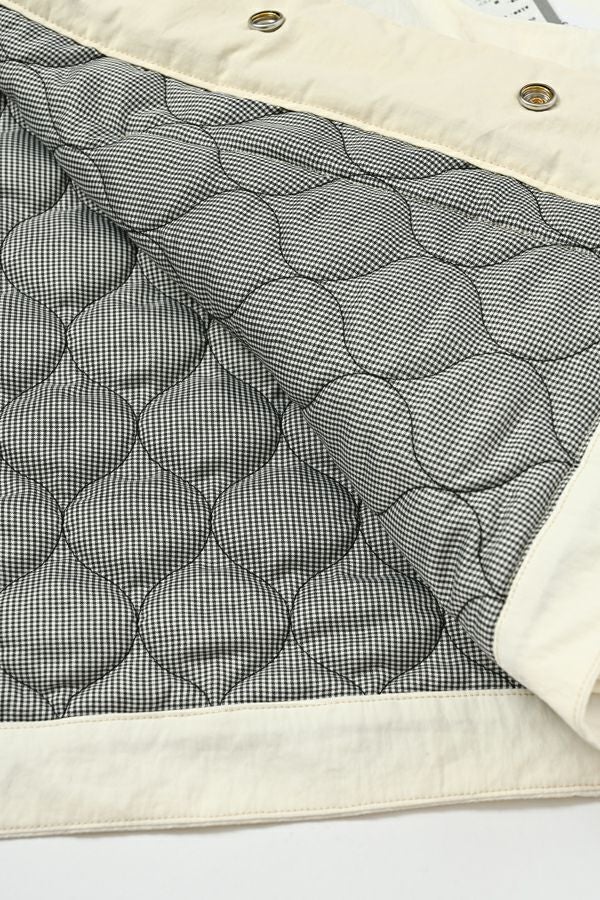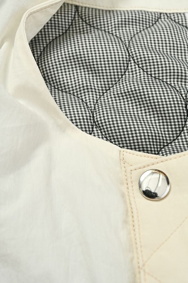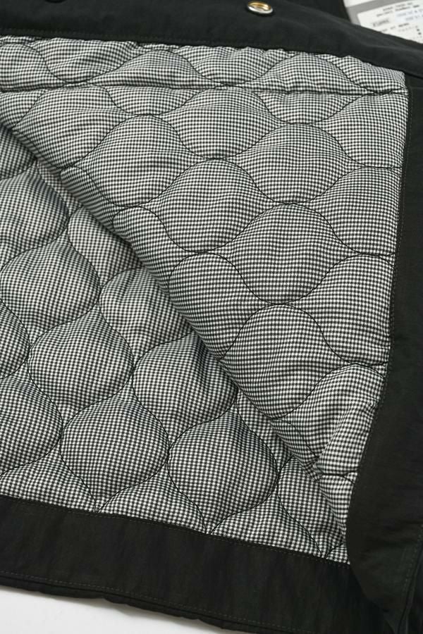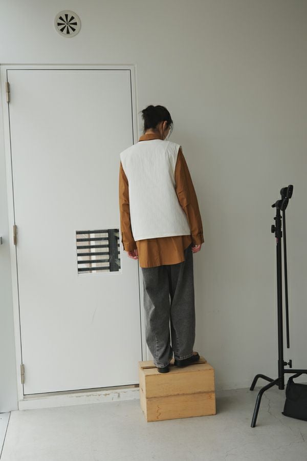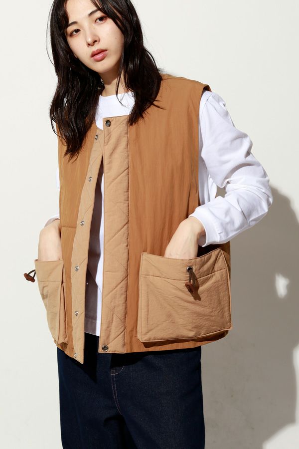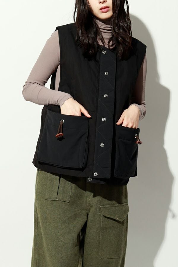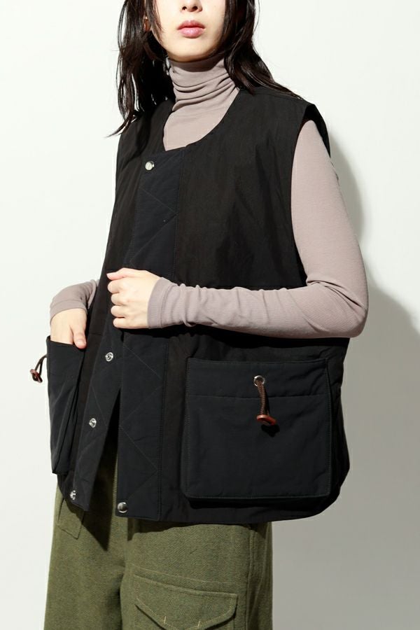 重ねて魅せる、大人の余裕。バランス上手なキルティングベスト。 いつものスタイルにひとさじのスパイスを。ショート丈とワイドなアームホールが生む、絶妙なレイヤードバランス。ロングシャツやスウェット、ざっくりニットの上からさっと重ねるだけで、今っぽさと奥行きのある着こなしが完成します。 裏地にはチェック柄の中綿キルティングを使用し、暖かさとさり気ない遊び心をプラス。コットンライクなナイロン混素材は、粗野感を残したニュアンスのある表情で、大人カジュアルにしっくり馴染みます。 目を惹く大きめポケットは、チェコ軍のミリタリーベストをベースにした実用的なディテール。ポケット口に配されたコードとブタバナで調整でき、物の出し入れをし易くしつつ、ポケットが広がらないようにする仕組みに。使い勝手の良さとスマートな印象を両立しています。 羽織るだけでこなれて見える、頼れる一枚。冬のレイヤードスタイルに、心強い相棒です。 ●裏地はカラーによって柄が異なります。