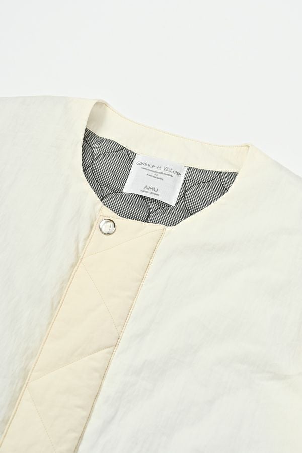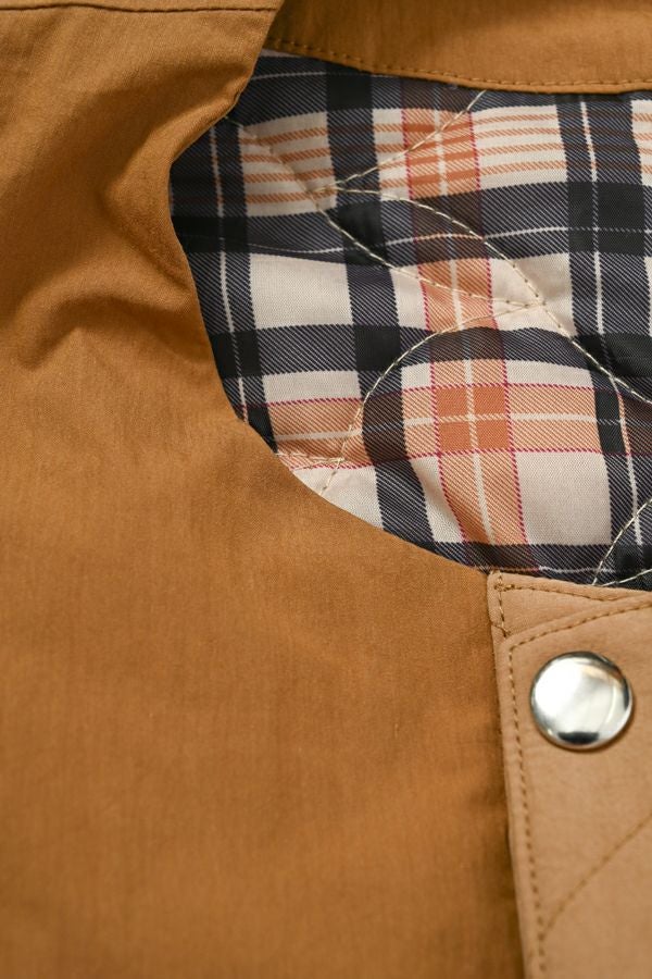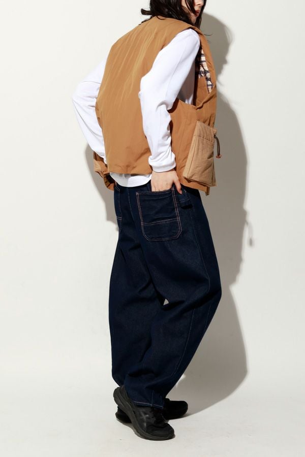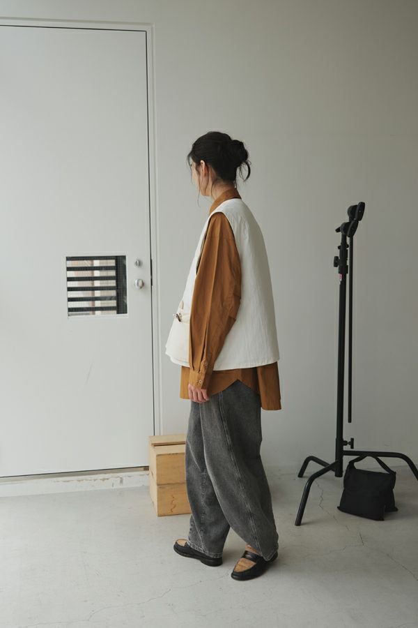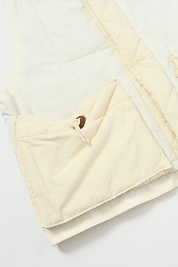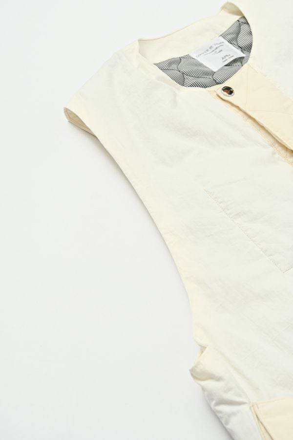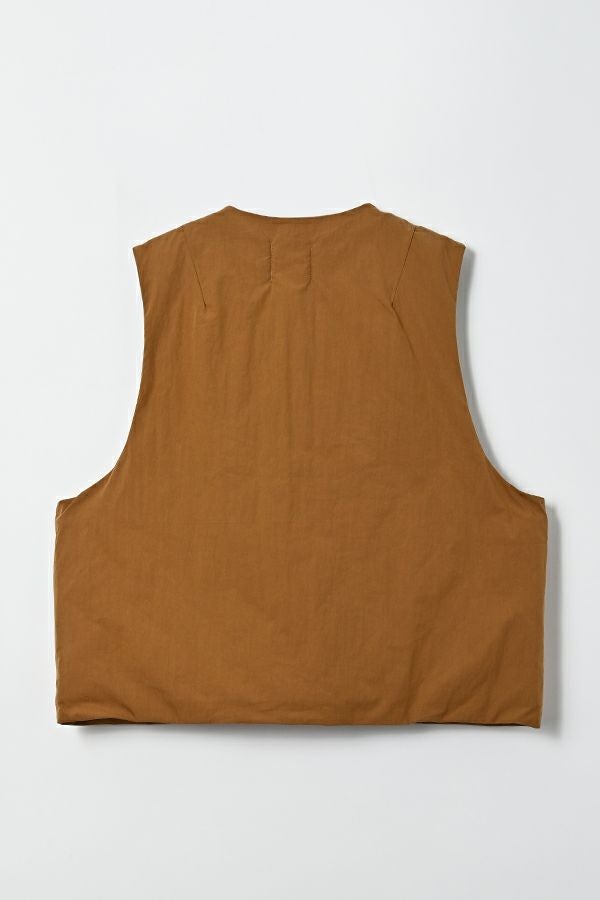 重ねて魅せる、大人の余裕。バランス上手なキルティングベスト。 いつものスタイルにひとさじのスパイスを。ショート丈とワイドなアームホールが生む、絶妙なレイヤードバランス。ロングシャツやスウェット、ざっくりニットの上からさっと重ねるだけで、今っぽさと奥行きのある着こなしが完成します。 裏地にはチェック柄の中綿キルティングを使用し、暖かさとさり気ない遊び心をプラス。コットンライクなナイロン混素材は、粗野感を残したニュアンスのある表情で、大人カジュアルにしっくり馴染みます。 目を惹く大きめポケットは、チェコ軍のミリタリーベストをベースにした実用的なディテール。ポケット口に配されたコードとブタバナで調整でき、物の出し入れをし易くしつつ、ポケットが広がらないようにする仕組みに。使い勝手の良さとスマートな印象を両立しています。 羽織るだけでこなれて見える、頼れる一枚。冬のレイヤードスタイルに、心強い相棒です。 ●裏地はカラーによって柄が異なります。