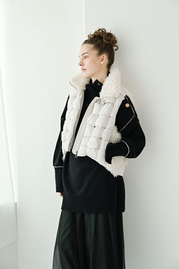 異素材が奏でる、洗練と存在感。大人のためのハンサムベスト。 シンプルなシルエットの中に、モードな要素を巧みに散りばめた一着。前身頃にはパディッド(中綿入り)テープを編み込んだ立体的なディテールに。衿と後ろ身頃にはカルガンラム風の柔らかなフェイクファーを使用し、リュクスなムードを演出。 裾部分には中綿入りのポリエステルヨークを配し、ヒップラインを包み込むような設計に。 軽さと温もりを備えた異素材のコントラストが、装いに奥行きをもたらします。ショート丈がスタイルアップ効果を発揮し、甘さを抑えたファー使いで、媚びない女性らしさを表現。 華やかさとクールさを絶妙に併せ持つ、大人のためのハンサムモードベストです。
